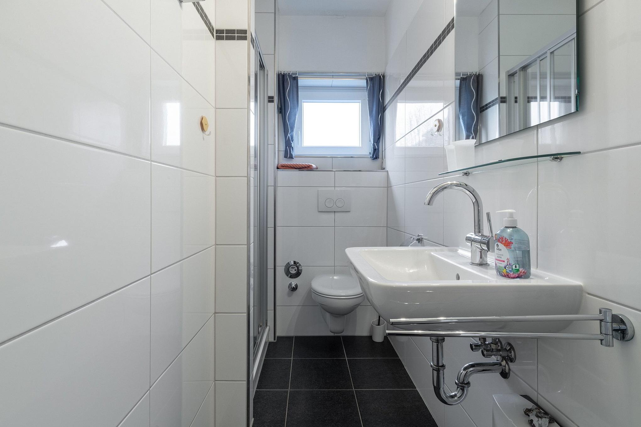 Modernes, hell gefliestes Tageslichtbad mit Dusche, WC und Waschbecken. Das Bad wurde komplett renoviert.