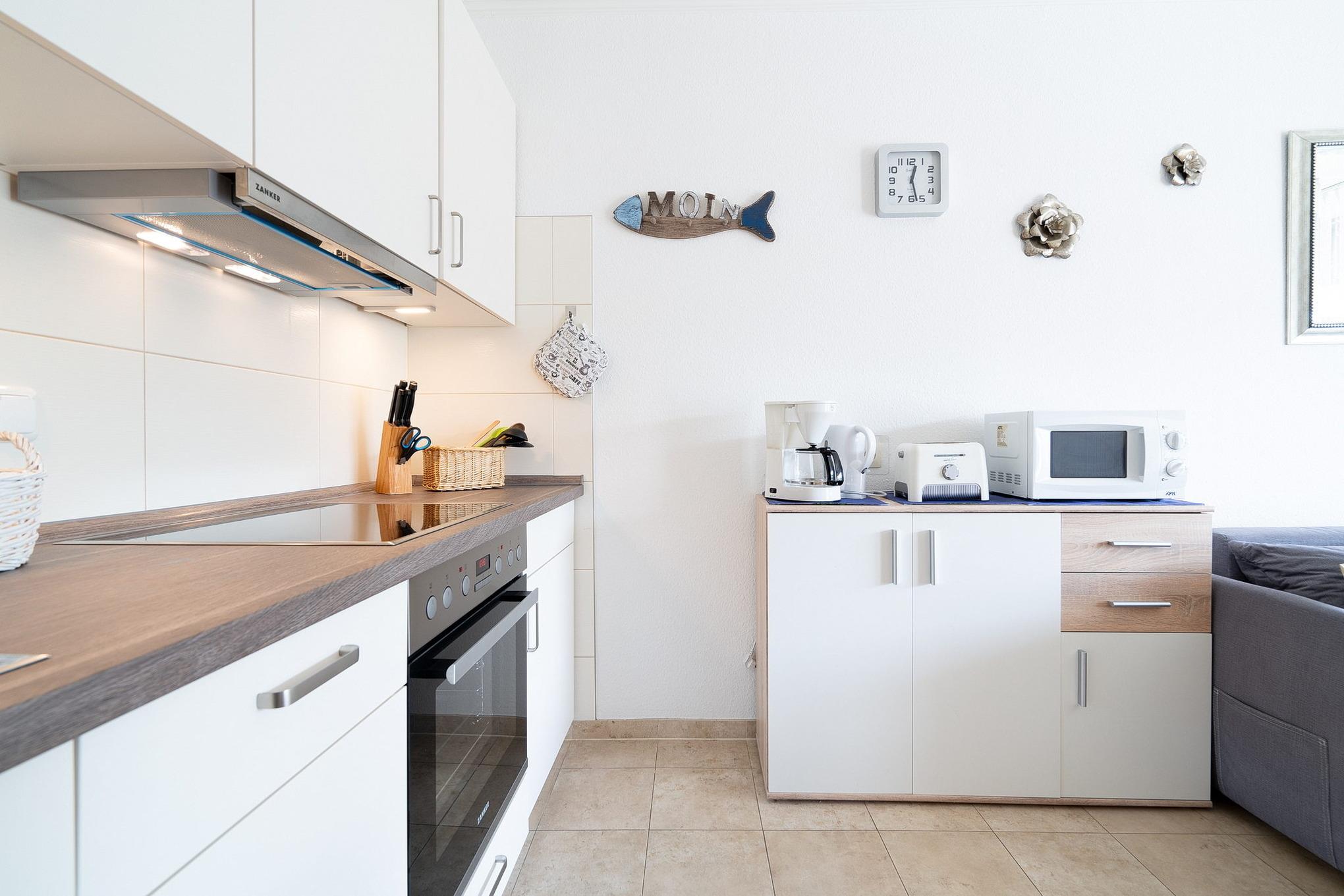 Komplett eingerichtete, zum Wohnzimmer offene Küche mit Cerankochfeld, Backofen, Dunstabzugshaube, Geschirrspüler, Mikrowelle, Toaster, Wasserkocher, Eierkocher, Kaffeemaschine und Kühlschrank mit kleinem Gefrierfach.