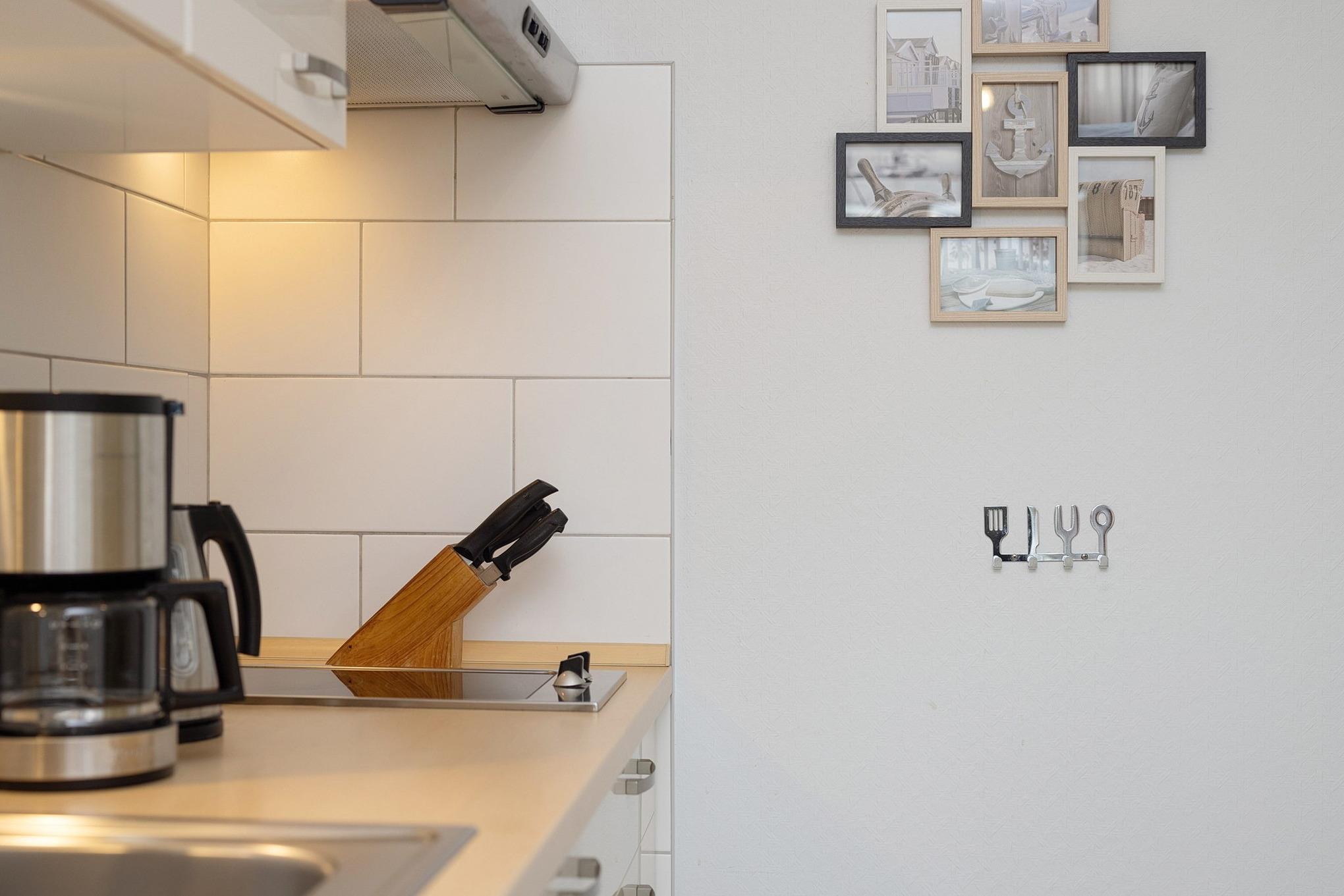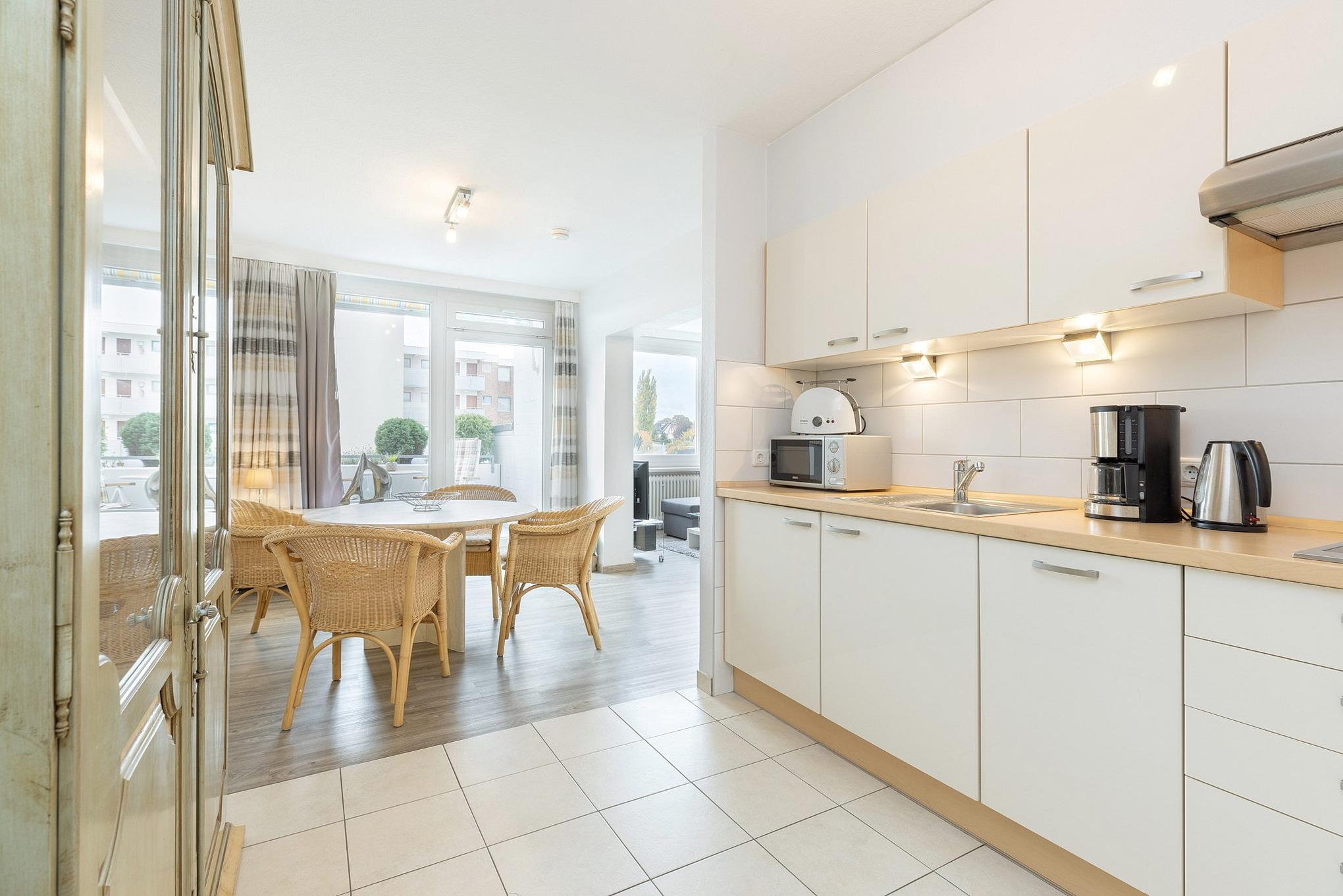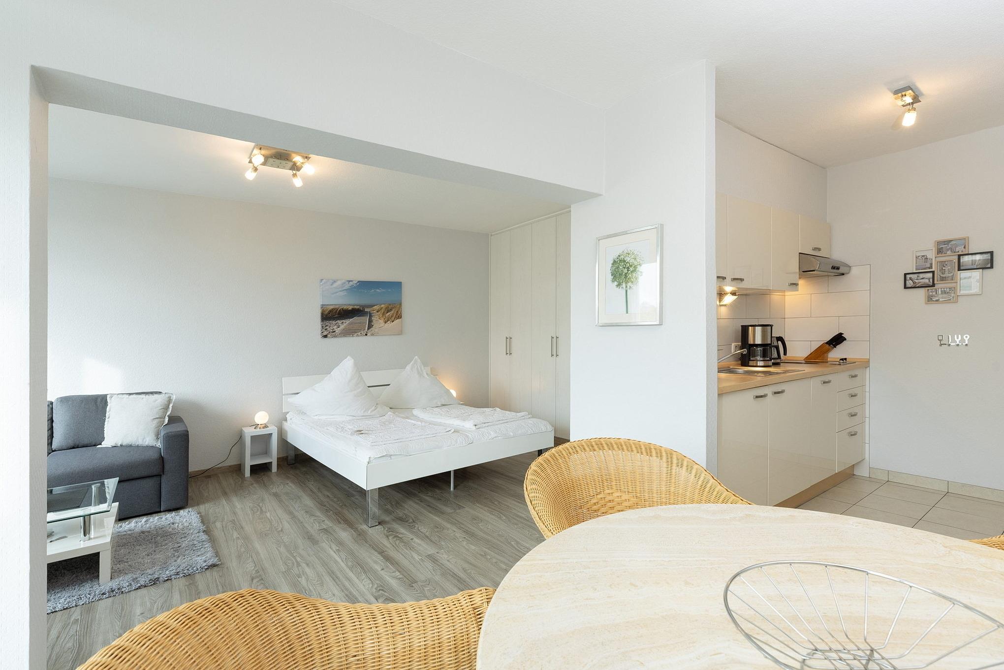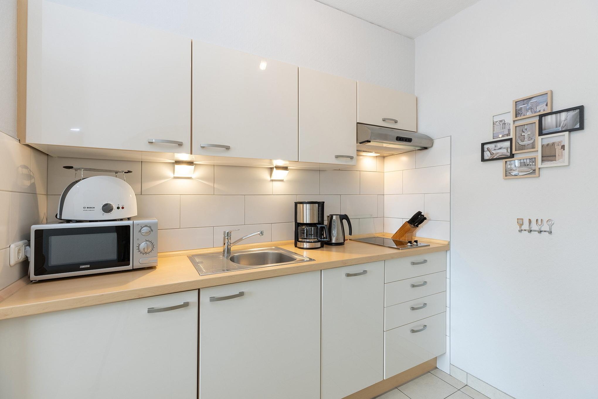 Zum Wohn-Schlafbereich offene komplett ausgestattete Küchenzeile mit 2-Platten Cerankochfeld, Spülmaschine, Kühlschrank mit kleinem Gefrierfach und Mikrowelle. Ebenso stehen eine Kaffeemaschine, ein Toaster und ein Wasserkocher zur Verfügung.