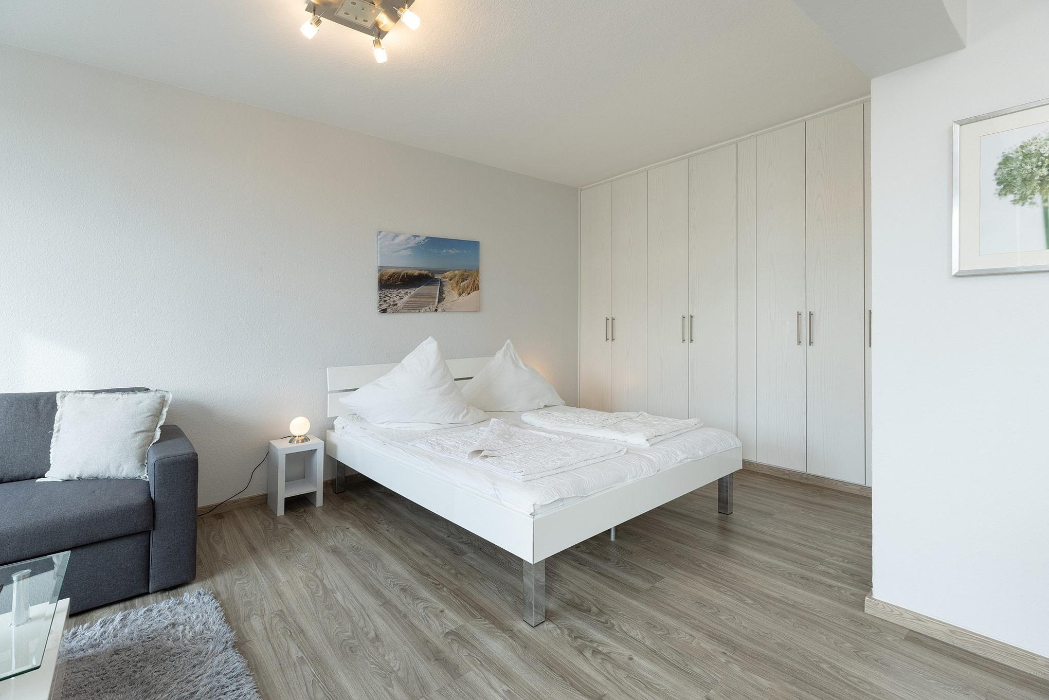 Großzügiger Wohn-Schlafbereich mit direktem Zugang zum schönen Balkon mit seitlichem Seeblick. Das Zimmer ist ausgestattet mit einem Doppelbett (2x80x200cm) und einem großen Kleiderschrank, einer Couch und einem Essplatz für 4 Personen. Zur Unterhaltung stehen ein Flachbild-TV und eine Mini-Stereoanlage zur Verfügung. Der Boden ist mit Laminat ausgelegt. Die Fenster lassen sich mit Vorhängen verdunkeln.