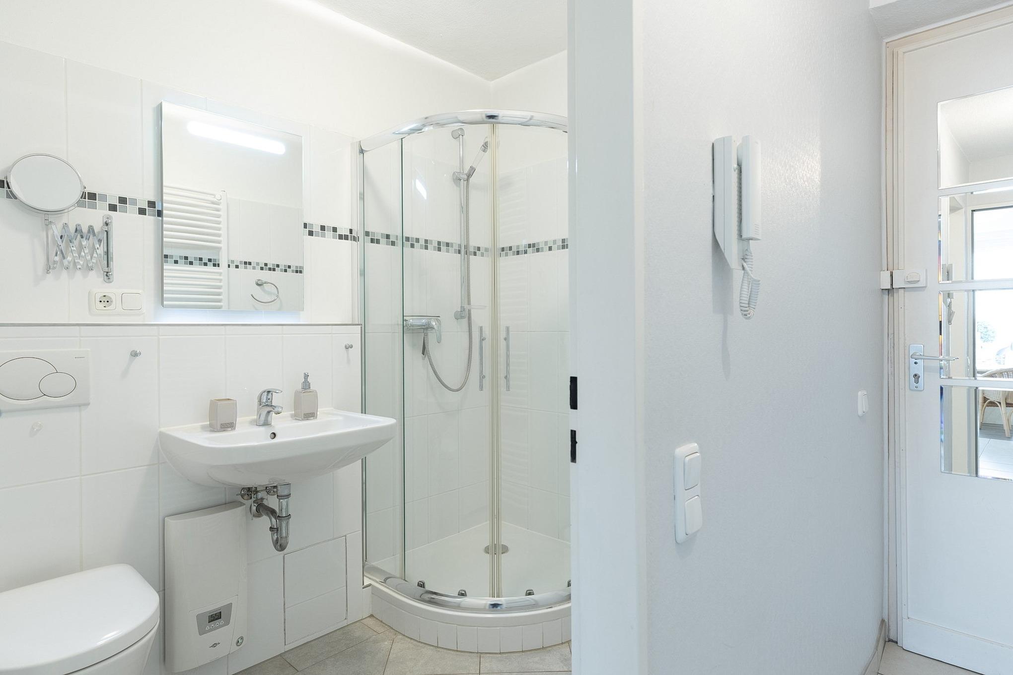 Helles modernes Bad mit Dusche, WC und Waschbecken.