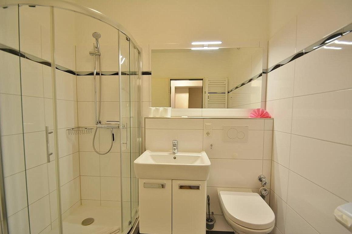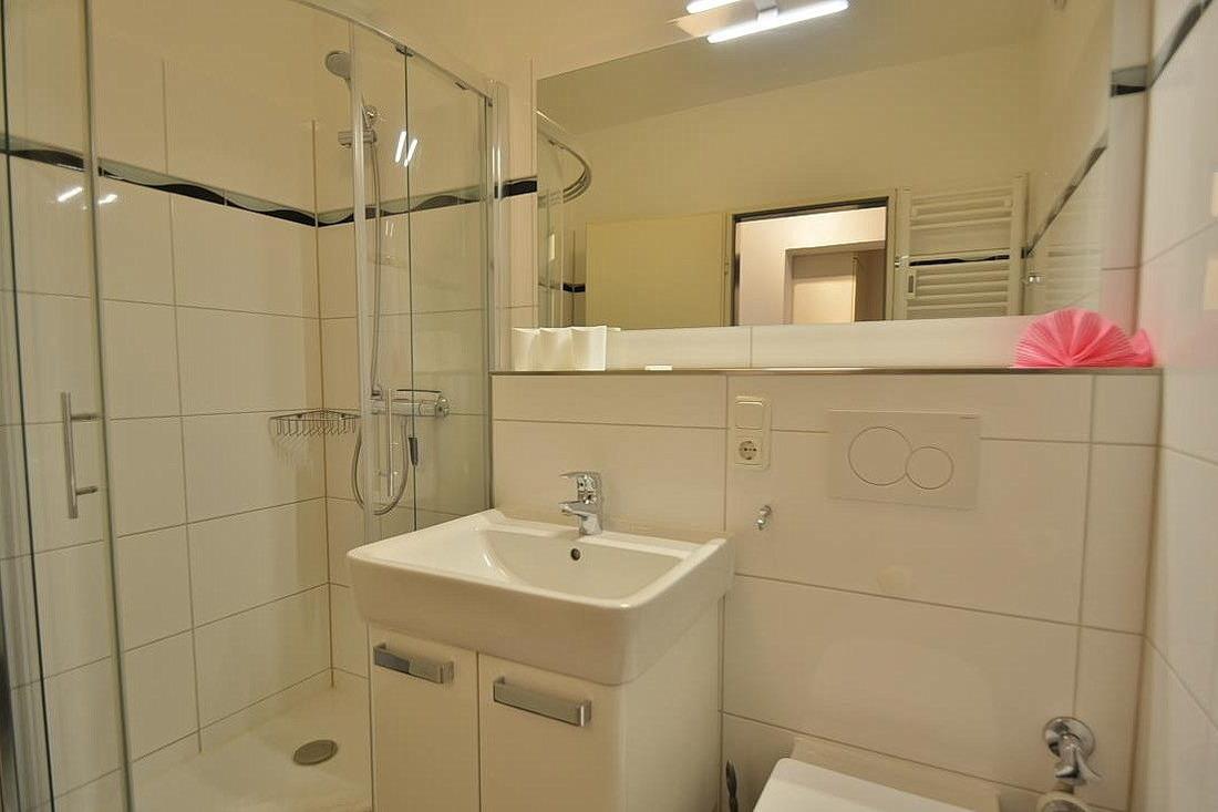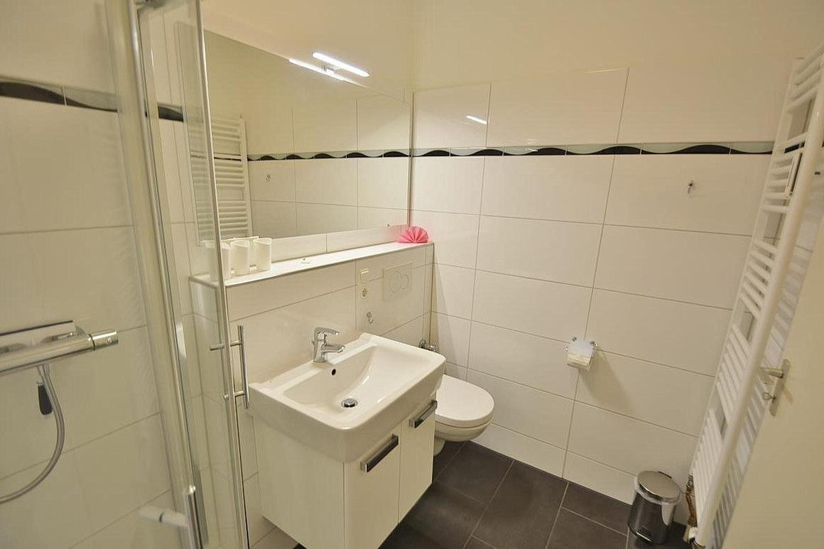 Modernes, renoviertes, hell gefliestes Bad mit Dusche, WC und Waschbecken.