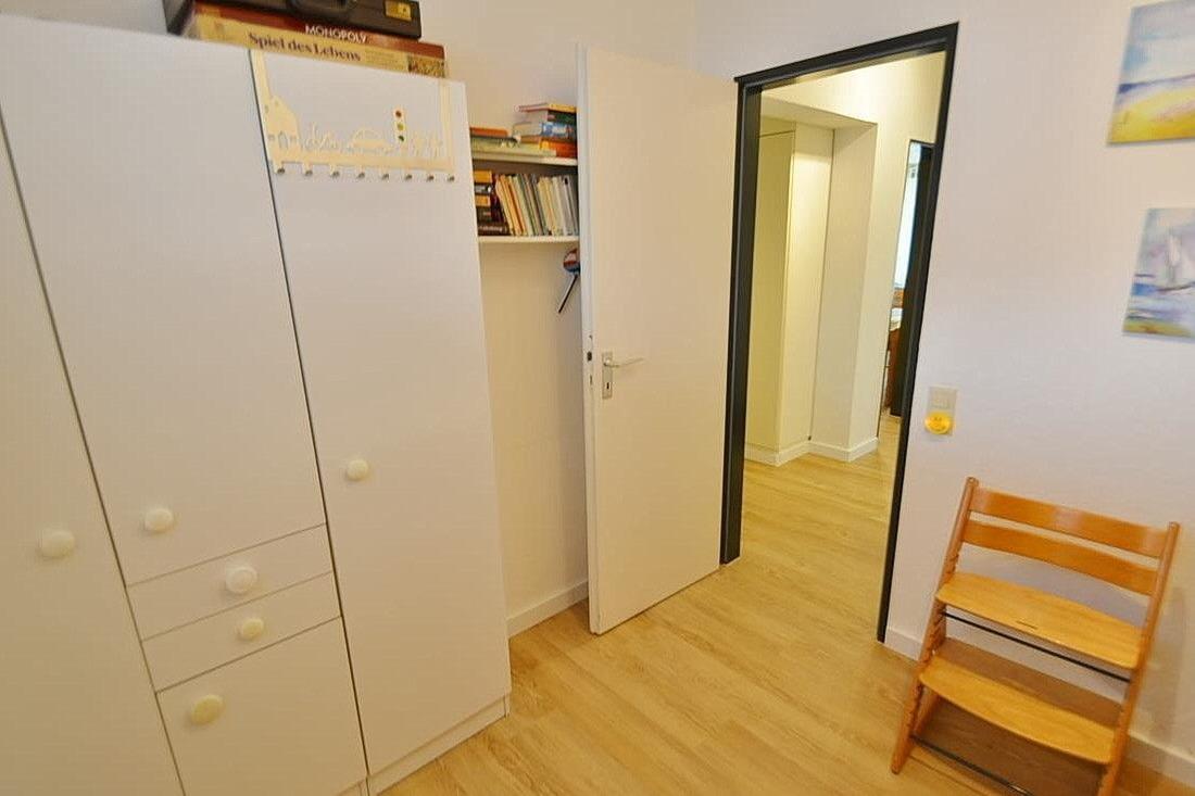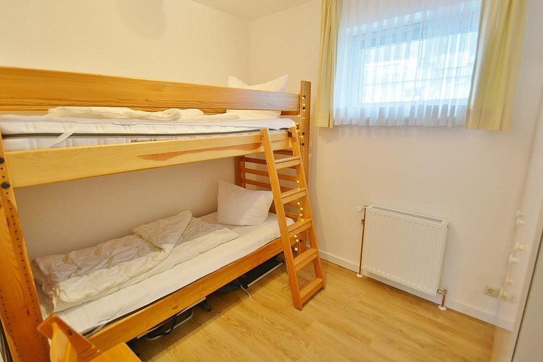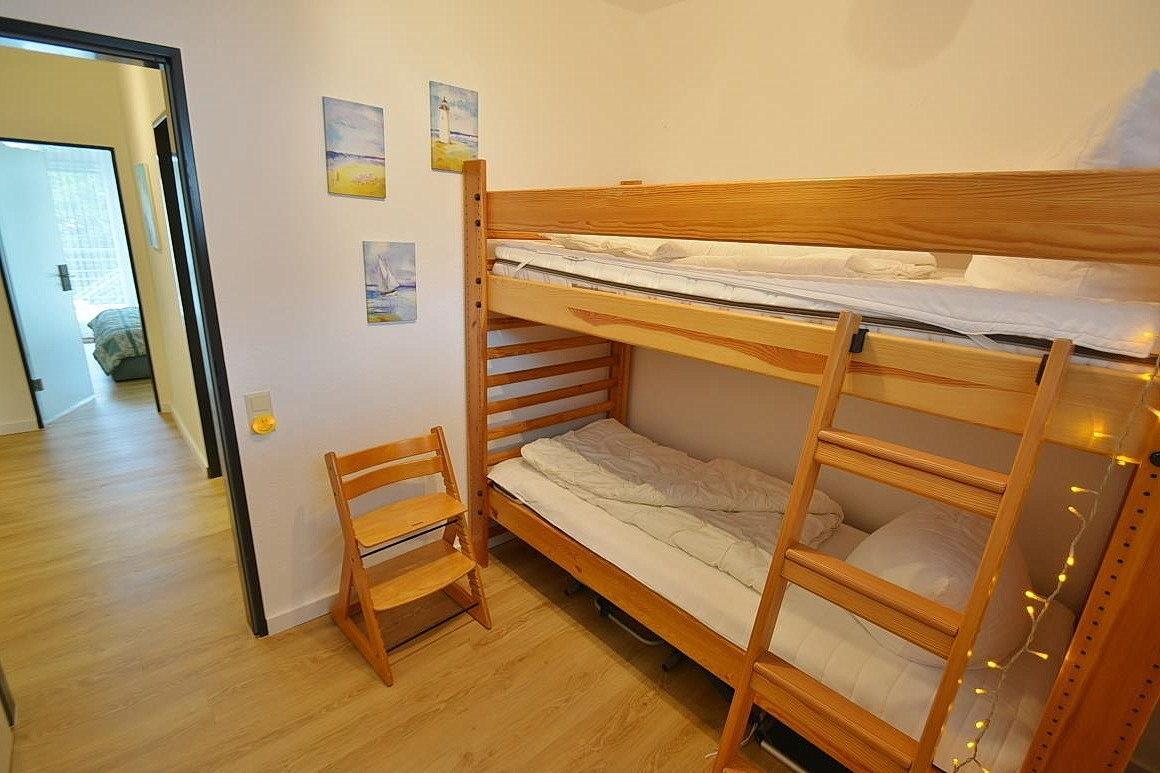 Im Kinderzimmer, das mit Vinylboden ausgelegt ist, befindet sich ein Etagenbett (Matratzengröße: 2x 80cm x 200cm) und ein Kleiderschrank. Das Fenster im Kinderzimmer führt zum Laubengang.