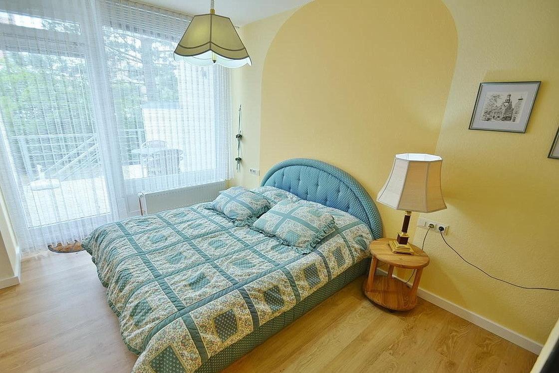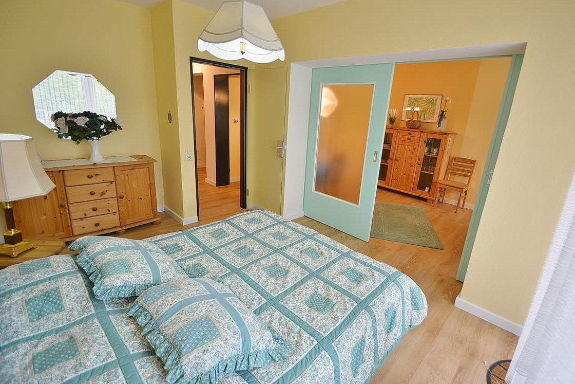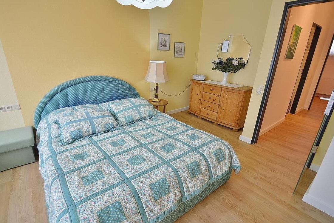 Direkt ans Wohnzimmer angrenzendes, freundliches, gepflegtes Schlafzimmer mit Terrassenzugang. Das Schlafzimmer ist mit Vinylboden ausgelegt. Im Schlafzimmer befindet sich ein Doppelbett (2 getrennte Matratzen in der Größe 80 cm x 200cm) und eine Kommode. Ein Kleiderschrank befindet sich im Flur.