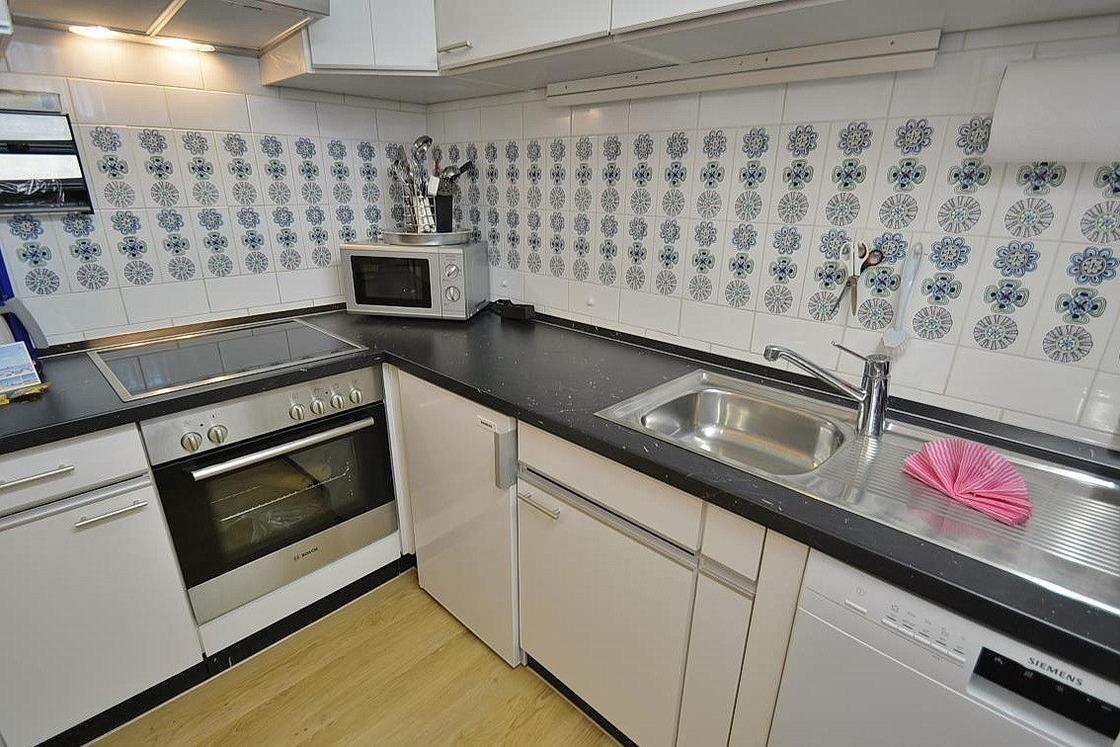 Komplett eingerichtete, gepflegte Küche mit Fenster zum Laubengang. Die Küche ist mit einem 4-Flammen Cerankochfeld mit Backofen, einem Kühlschrank mit kleinem 1-Sterne Gefrierfach, Spülmaschine, Wasserkocher, Kaffeemaschine, Eierkocher, Mikrowelle und Toaster ausgestattet.