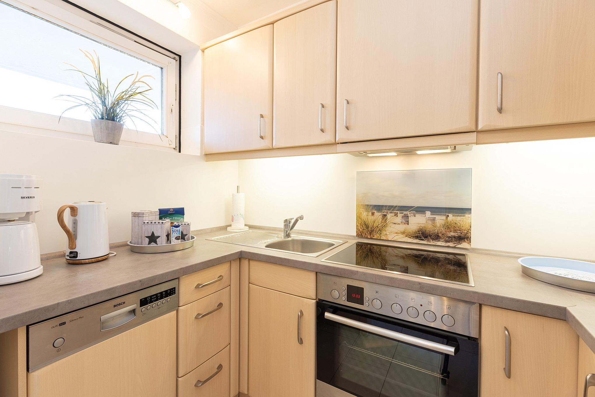 Offene komplett ausgestattete Küche mit 4-Platten Cerankochfeld, Backofen, Spülmaschine und Kühlschrank. Ebenso stehen eine Kaffeemaschine, ein Toaster und ein Wasserkocher zur Verfügung.