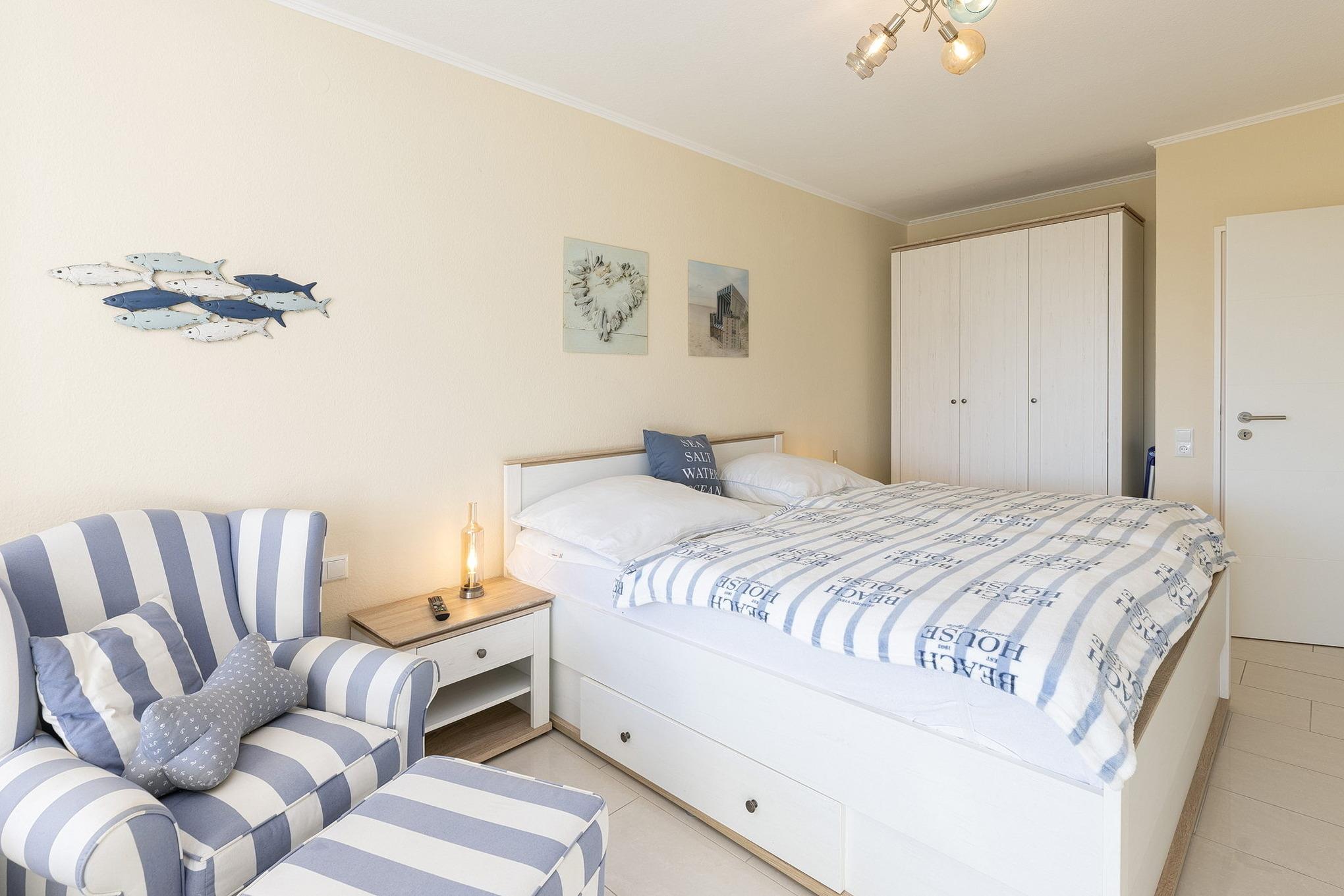 Kleines gemütlich eingerichtetes Schlafzimmer mit kleinem Kleiderschrank und direktem Zugang zum Balkon mit Seeblick. Das Zimmer ist hell gefliest und mit einem Doppelbett (2x90x200cm), einem Sessel sowie 2 Nachttischen ausgestattet. Zur Unterhaltung steht ein Flachbild-TV zur Verfügung. Die Fenster lassen sich mit Außen-Jalousien verdunkeln.