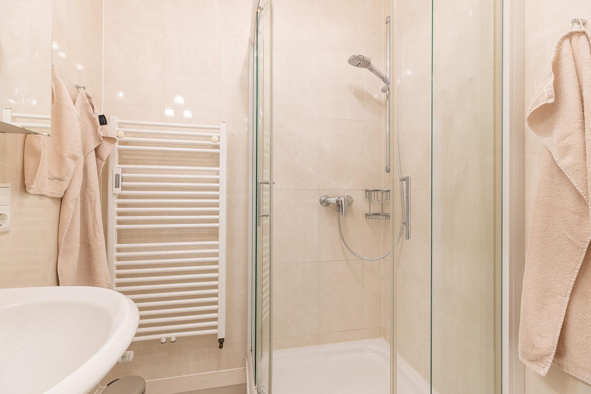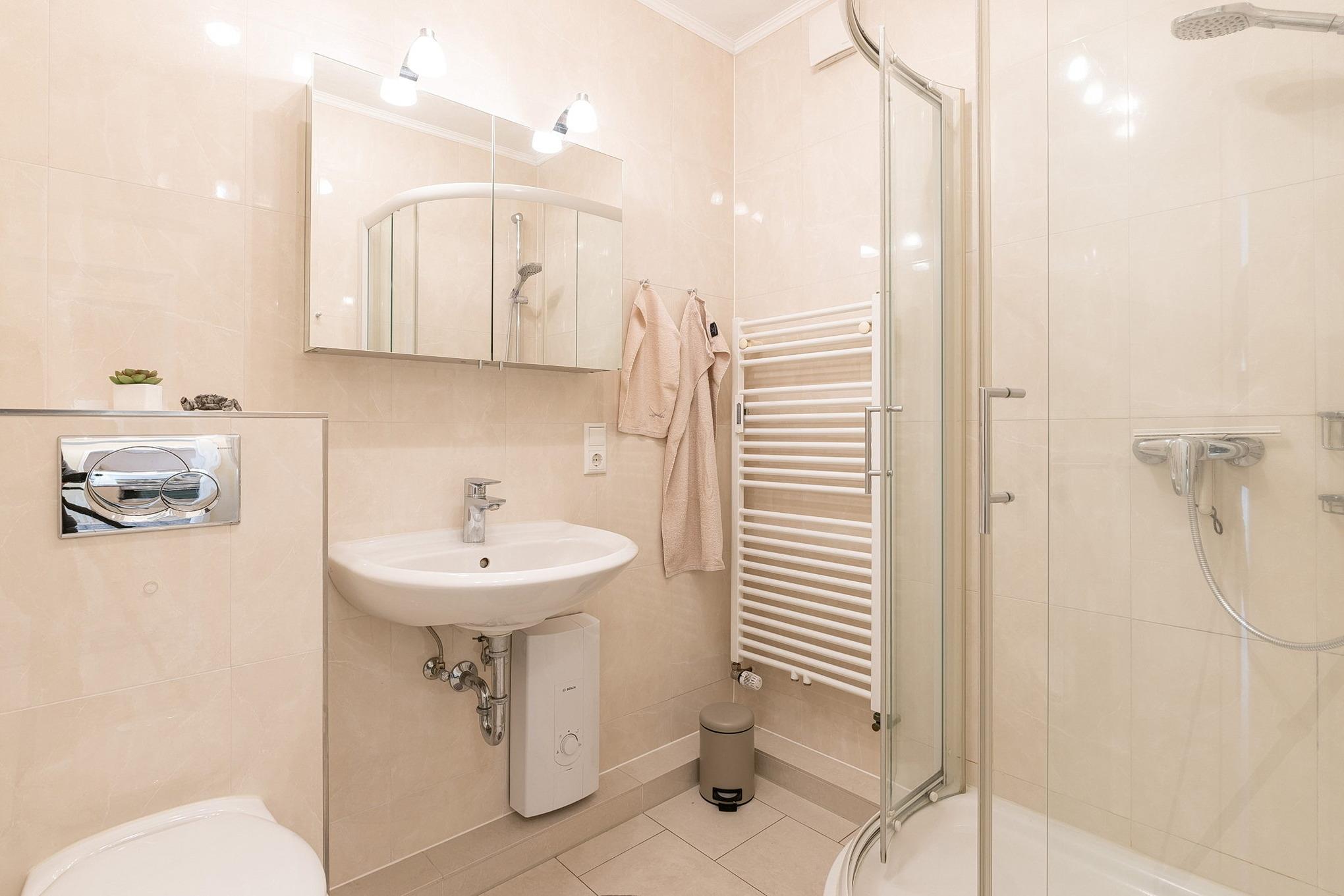 Helles Bad mit Dusche, WC und Waschbecken.