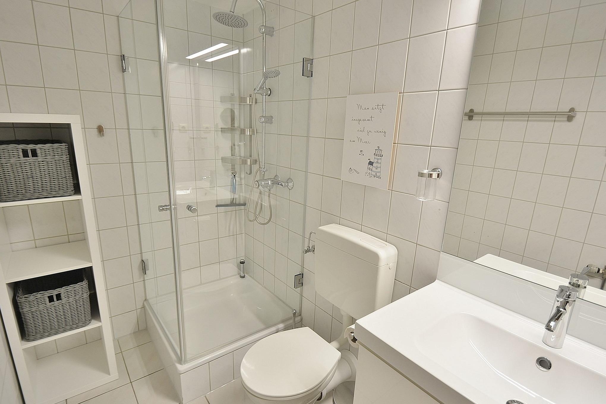 Helles Badezimmer mit Dusche, Waschbecken und WC.