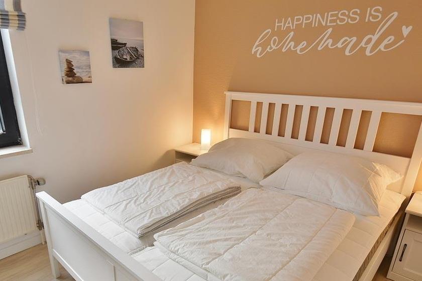 Das helle freundliche Schlafzimmer verfügt über ein Doppelbett (2x80x200cm) und einen Kleiderschrank. Der Raum ist mit Laminat ausgelegt, die Fenster lassen sich durch ein Plissee verdunkeln.