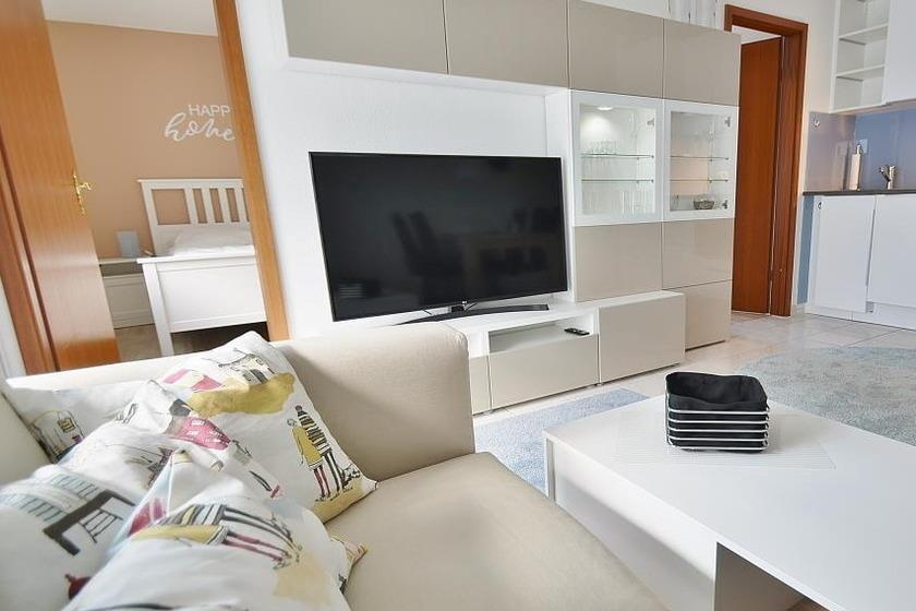 Gemütlicher Wohn-Essbereich mit direktem Zugang zum Balkon. Das Wohnzimmer verfügt über ein Sofa sowie einen Esstisch mit Platz für 4 Personen. Zur Unterhaltung steht ein Flachbildfernseher zur Verfügung. Der Raum ist mit Fliesen ausgelegt.