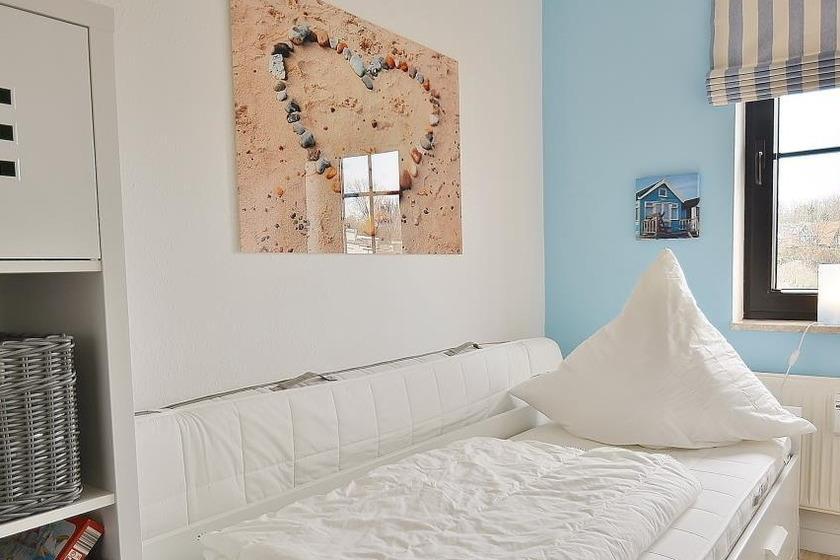 Das Kinderzimmer verfügt über ein ausziehbares Doppelbett (2x80x200cm). Der Raum ist mit Laminatboden ausgelegt, das Fenster lässt sich durch ein Plissee verdunkeln.