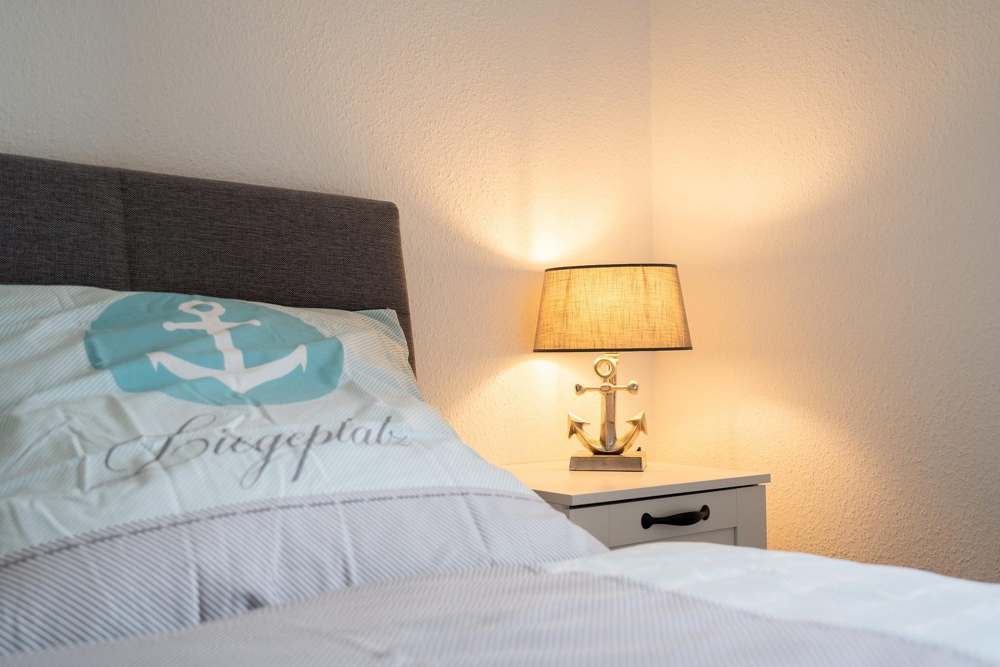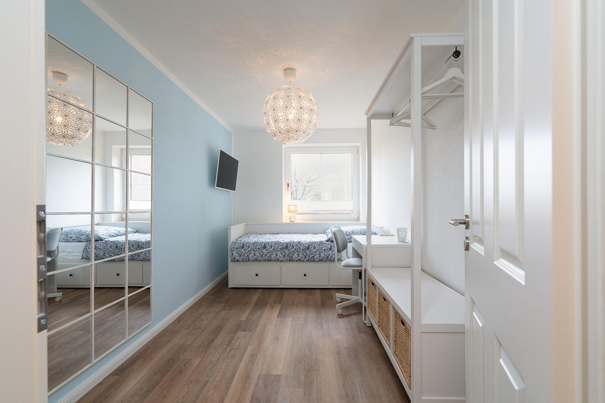 Das gemütliche Schlafzimmer ist mit einem großen Boxspringbett (180x200cm plus Topper), einem Kleiderschrank sowie zwei Nachttischen ausgestattet. Der Boden ist mit hochwertigem Laminat ausgelegt. Das Fenster ist mit einem blickdichtem Plissee ausgestattet.