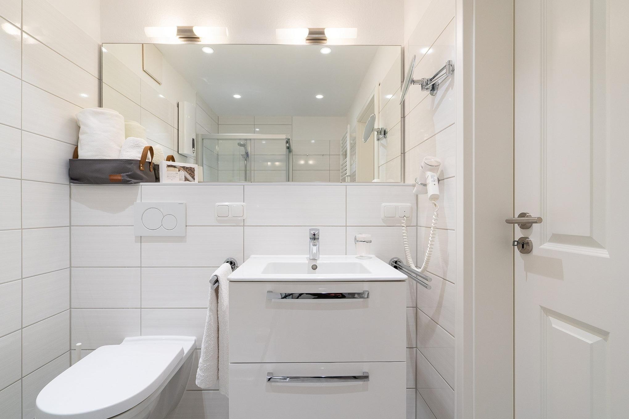 Helles modernes Bad mit flacher, fast ebenerdiger Dusche, WC und Waschbecken.