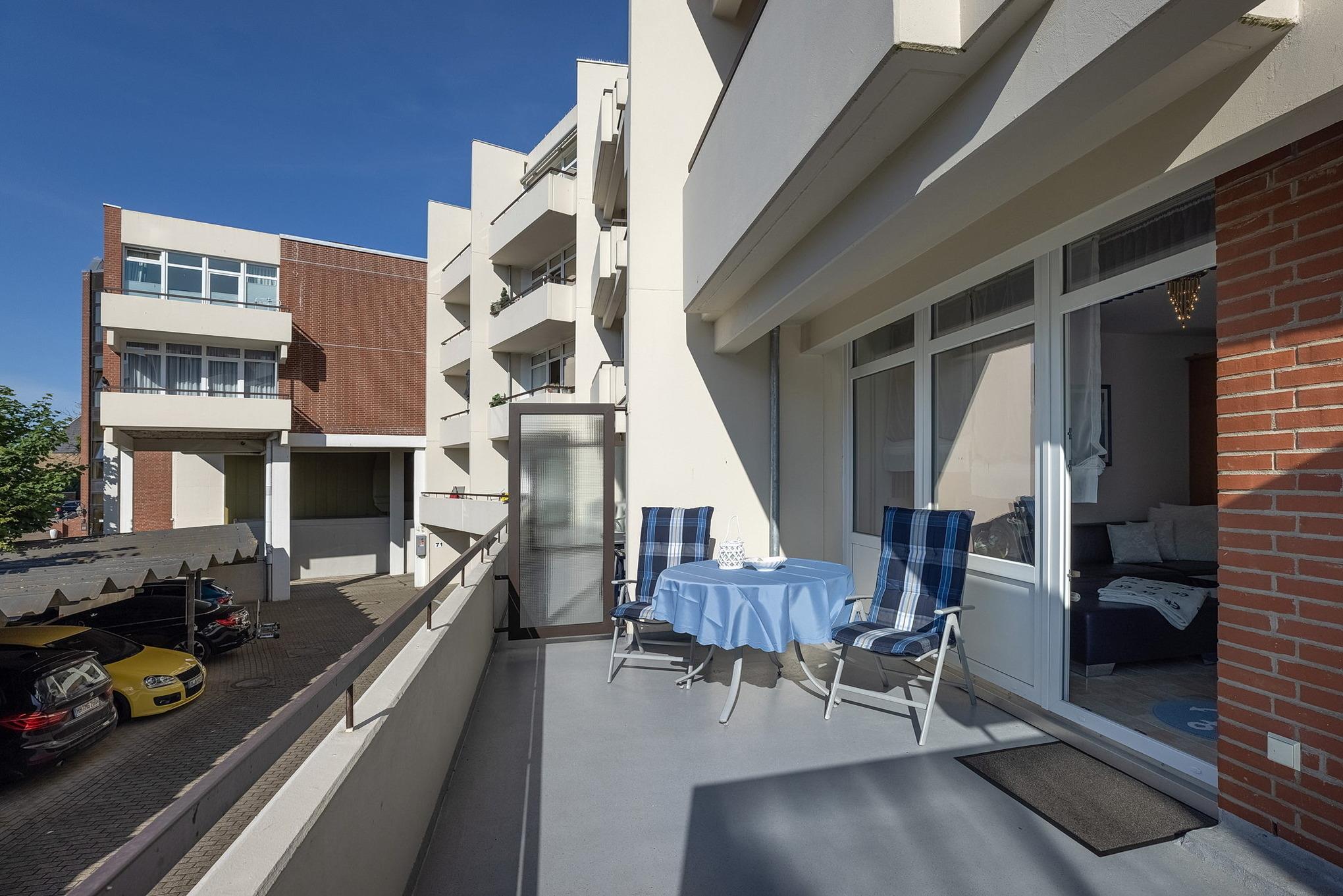Eigener Stellplatz vor dem Gebäude. Großer Balkon (12 qm) in nord-westliche Richtung (Sonne ab spät Nachmittag), kostenloser W-Lan Anschluss.