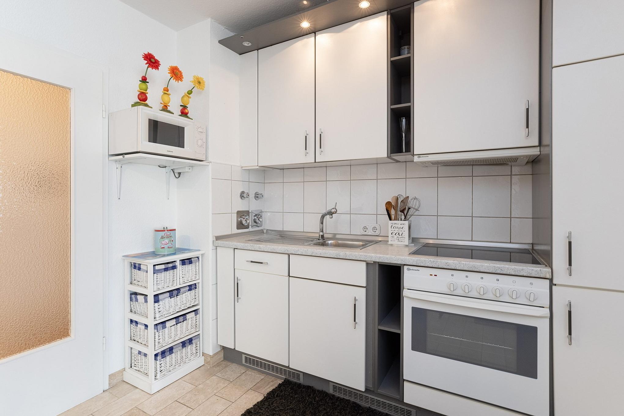Moderne, zum Wohn- und Esszimmer offene, komplett ausgestattete Küche mit 4-Platten Cerankochfeld, Backofen, Mikrowelle, Kühlschrank, Kaffeemaschine, Wasserkocher und Toaster.