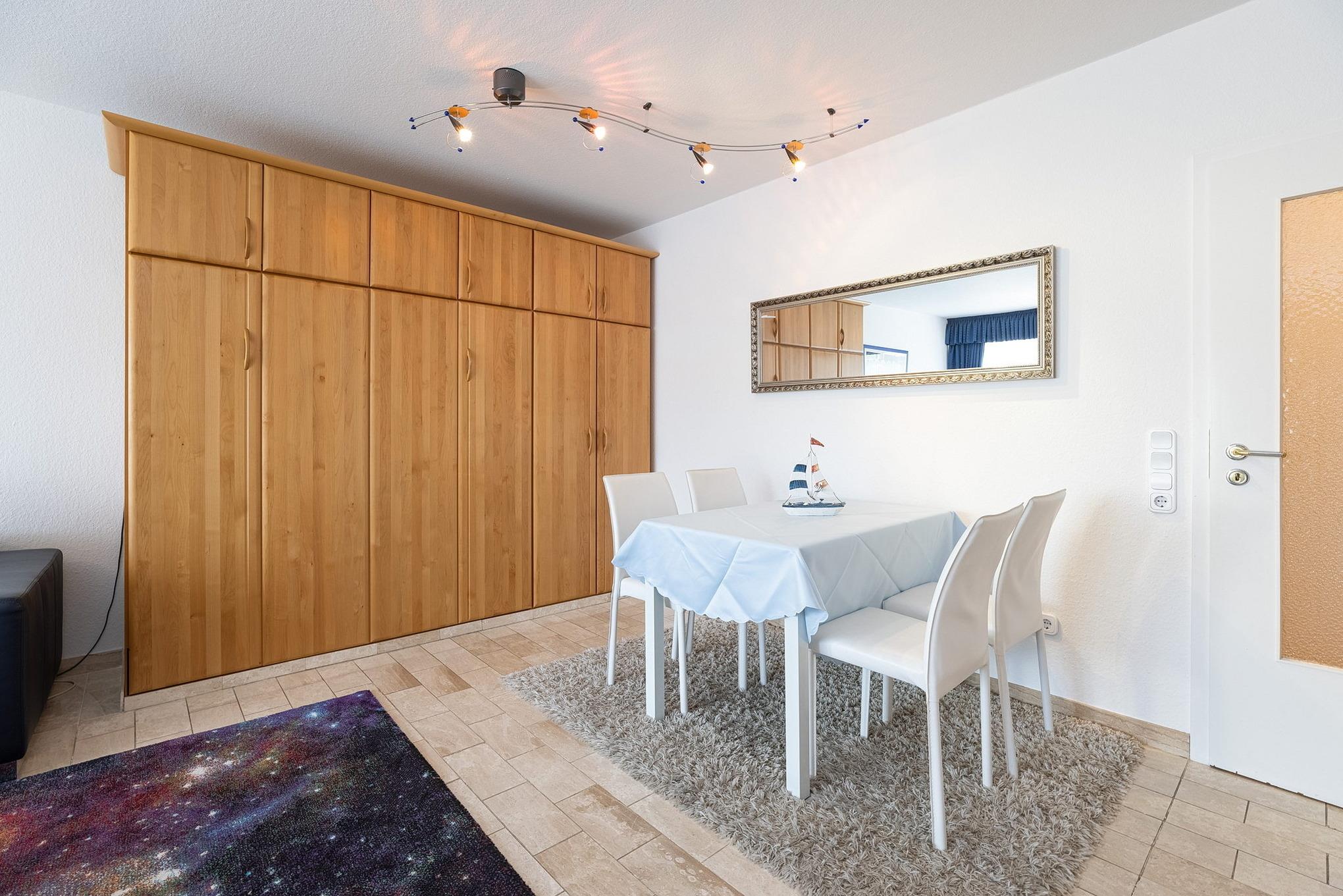 Modernes, freundliches Wohn- und Esszimmer mit direktem Zugang zum großen Balkon. Das Wohn- und Esszimmer ist mit einem Essplatz für 4 Personen, einer Eckcouch und einem Sessel, einem Couchtisch und einen Schrankbett (2x 80x200cm) und einem Kleiderschrank ausgestattet. Zur Unterhaltung steht ein Fernseher zur Verfügung. Das Wohn- und Esszimmer ist gefliest, das Fenster lässt sich durch eine blickdichte Gardine verdunkeln.