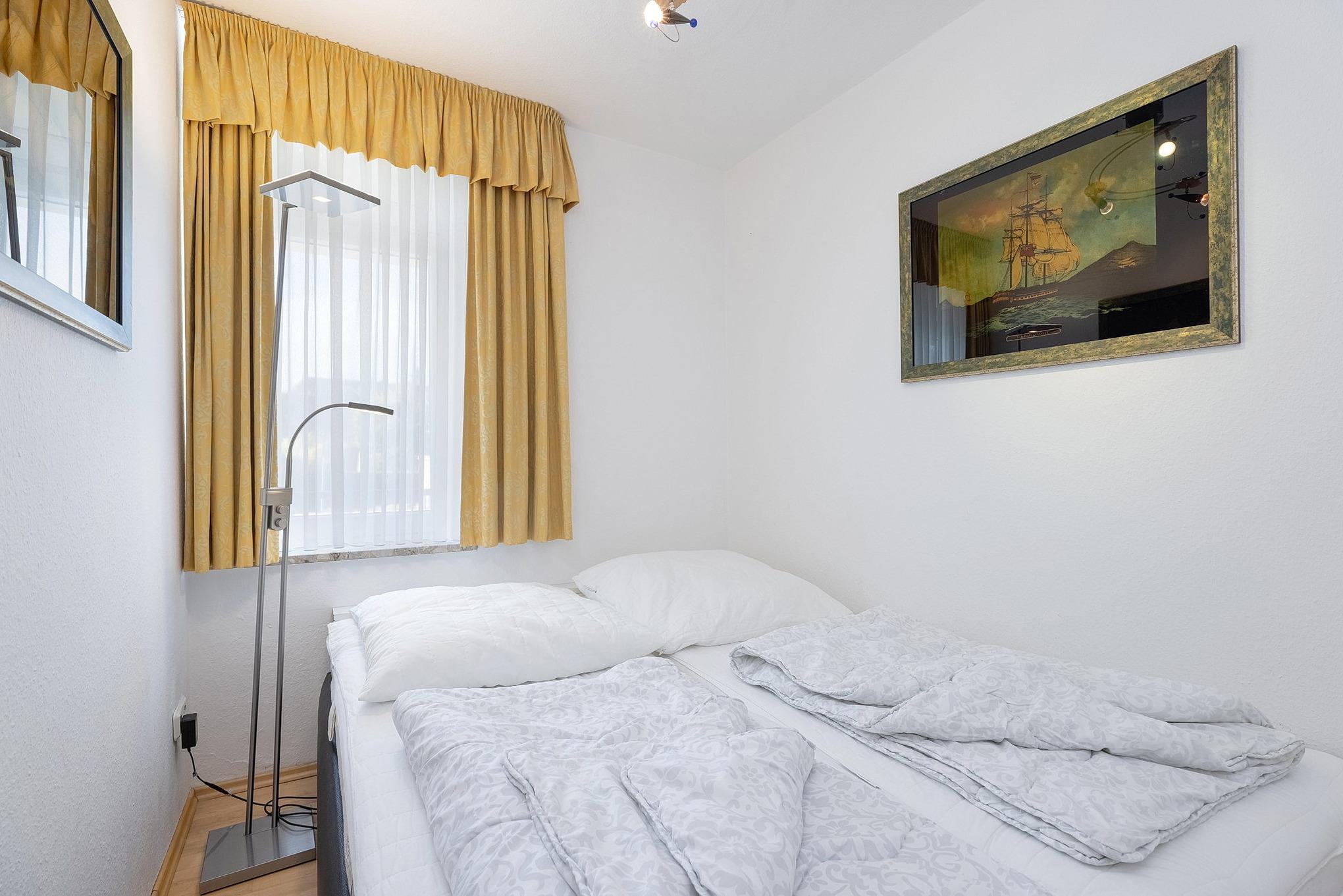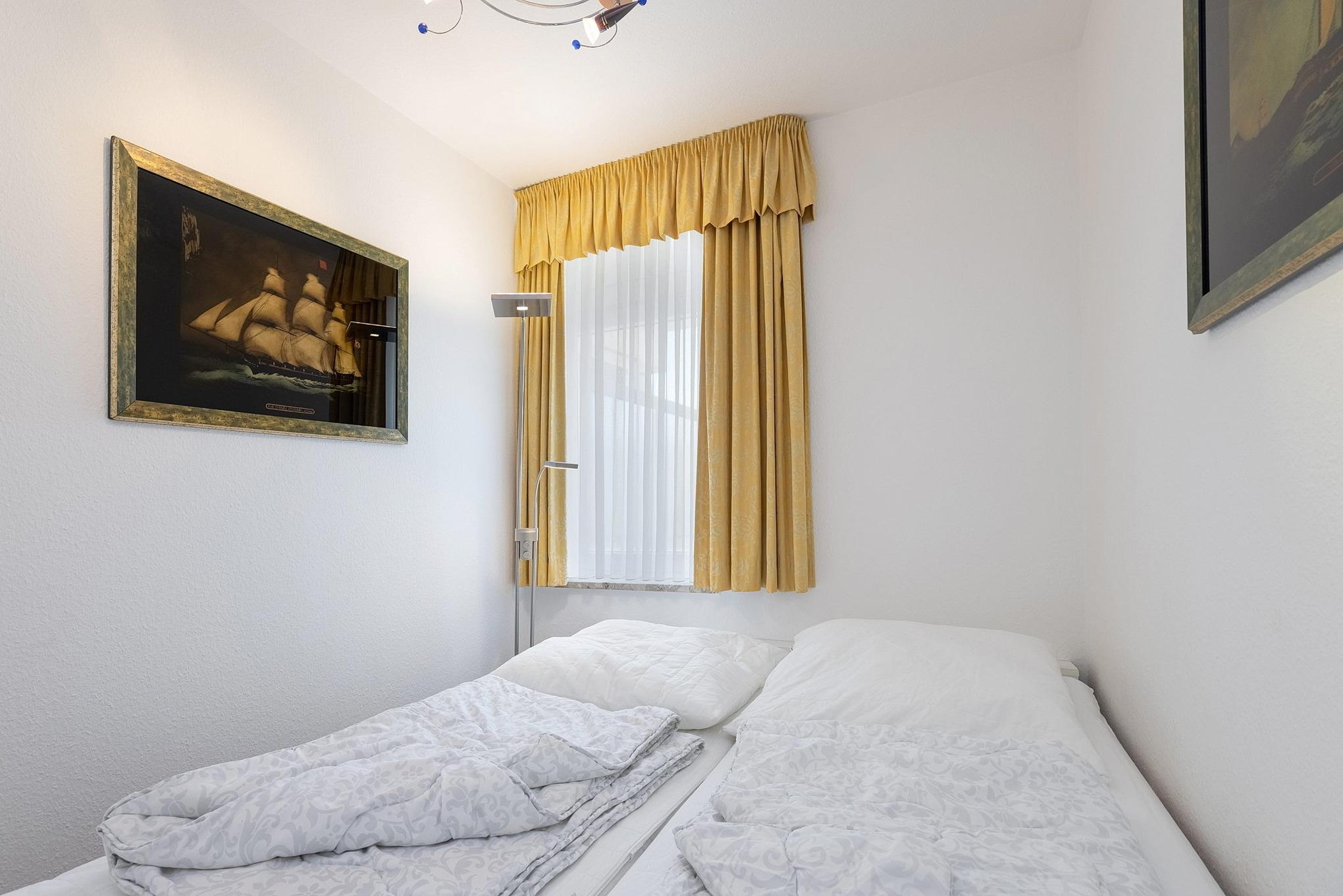 Sehr kleines, separates Schlafzimmer mit einem Doppelbett (2x 80x200cm). Das Schlafzimmer ist mit Laminatboden ausgelegt. Das Fenster lässt sich durch einen blickdichten Vorhang verdunkeln.