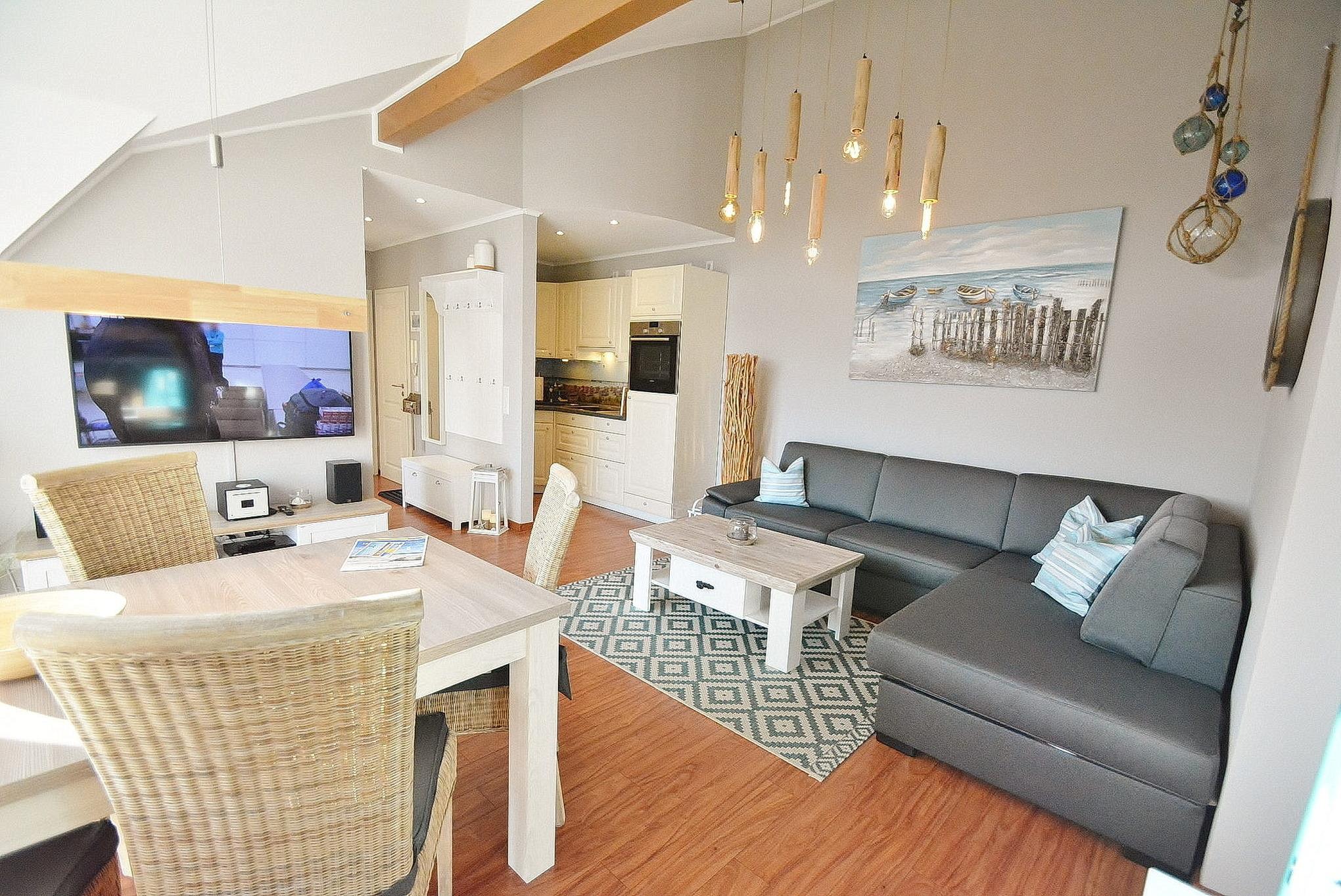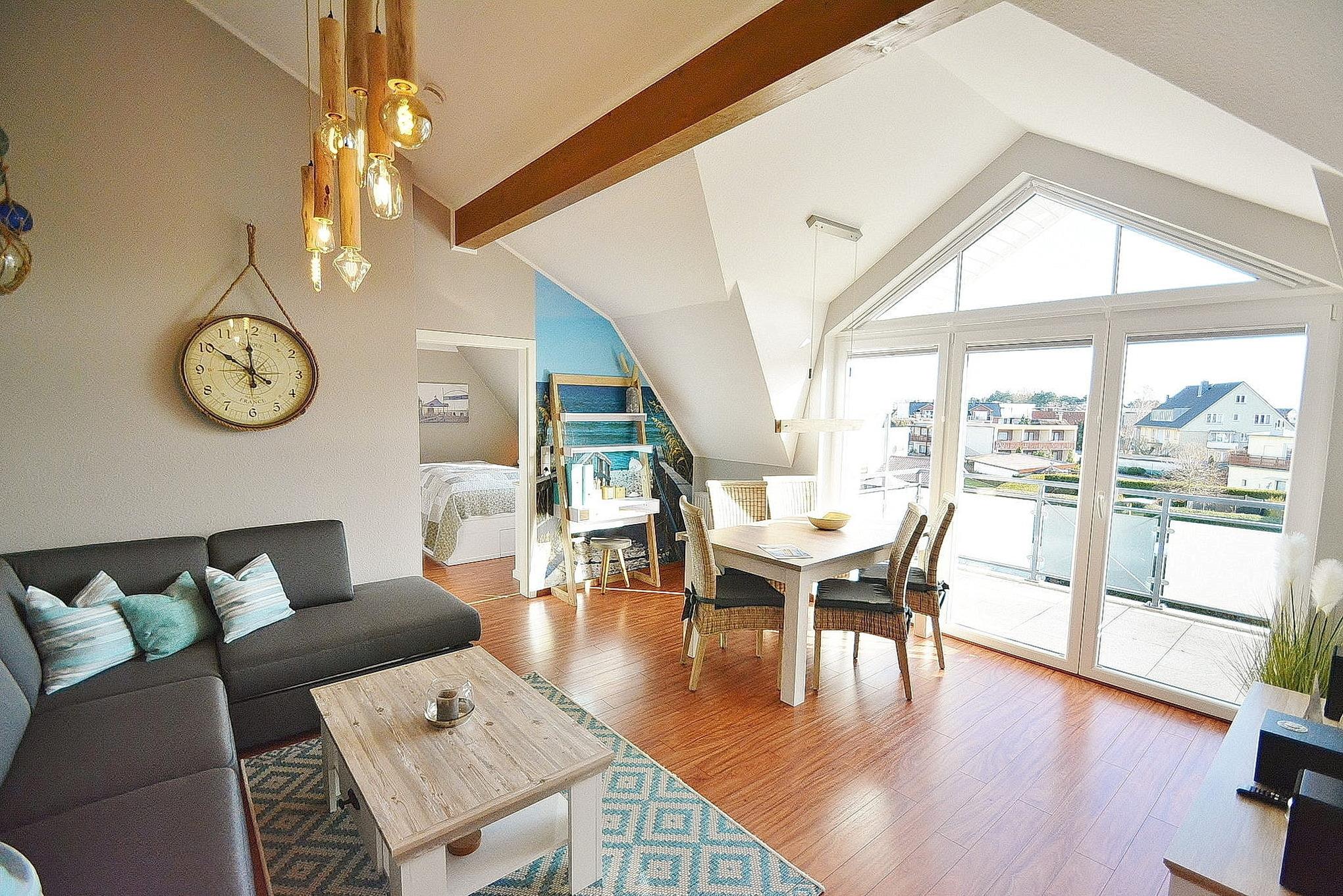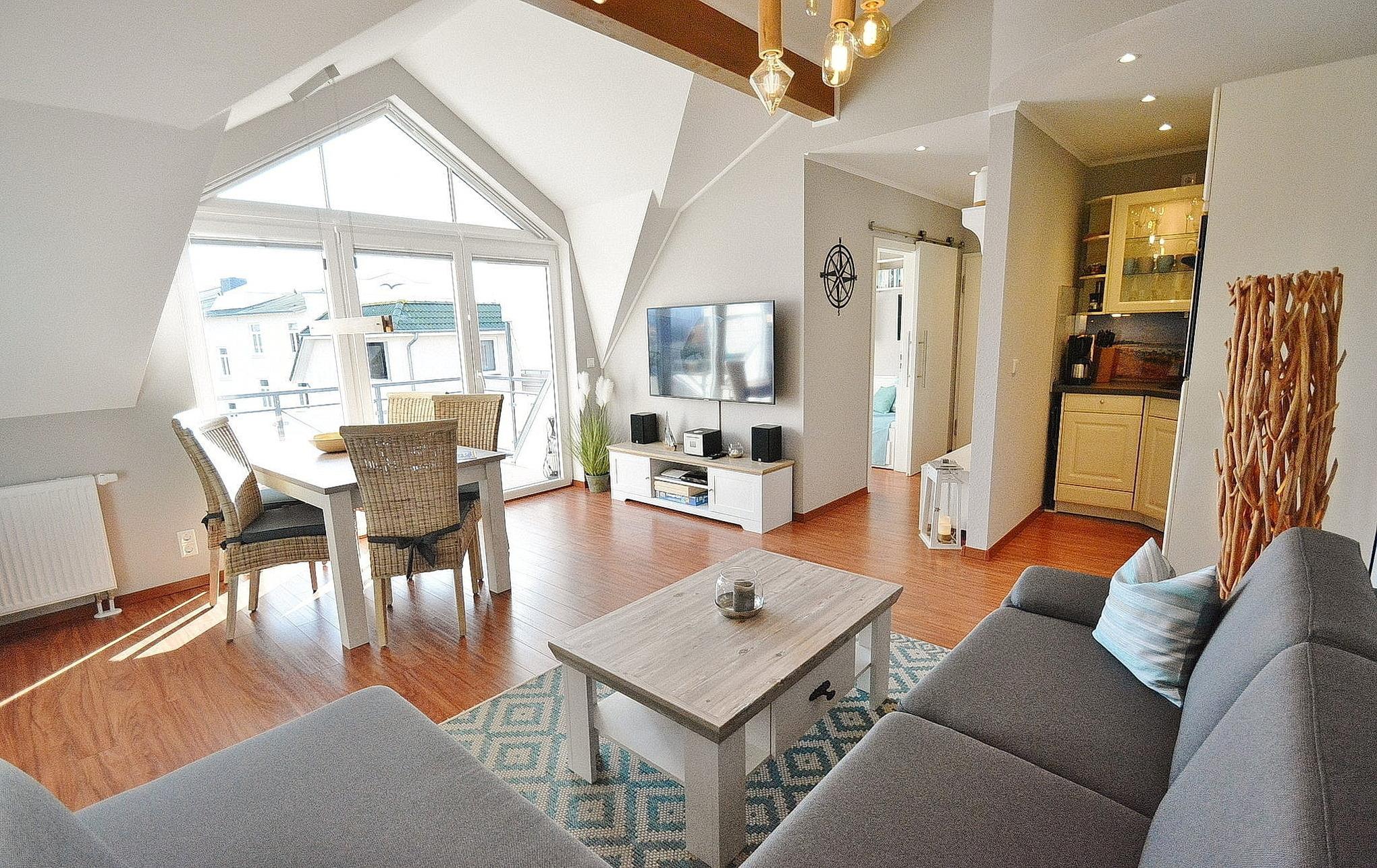 Modern und stilvoll eingerichtetes Wohn- und Esszimmer mit direktem Zugang zum Balkon. Das Wohn- und Esszimmer ist mit einer bequemen Eck-Schlafcouch (150x200cm), einem Couchtisch, einem Essplatz für 5 Personen und einem TV-Schrank ausgestattet. Das Zimmer ist mit Designer-Planken ausgelegt. Zur Unterhaltung steht ein großer Flachbildschirm, ein Bluray-Player und eine netzwerkfähige Mini-Stereoanlage mit CD-Player zur Verfügung. Die Fenster lassen sich durch Innenplissees verdunkeln.