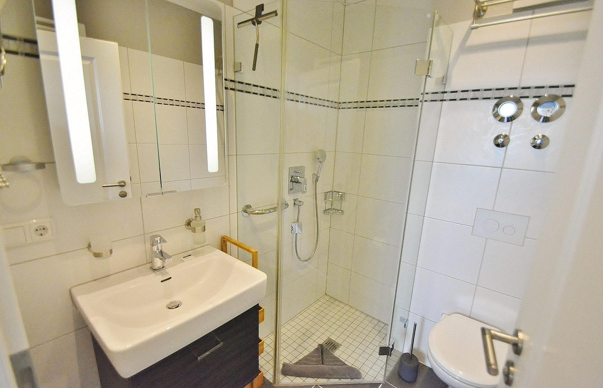 Das moderne, hell geflieste Bad mit Dusche, WC und Waschbecken ist direkt vom Schlafzimmer zugänglich.