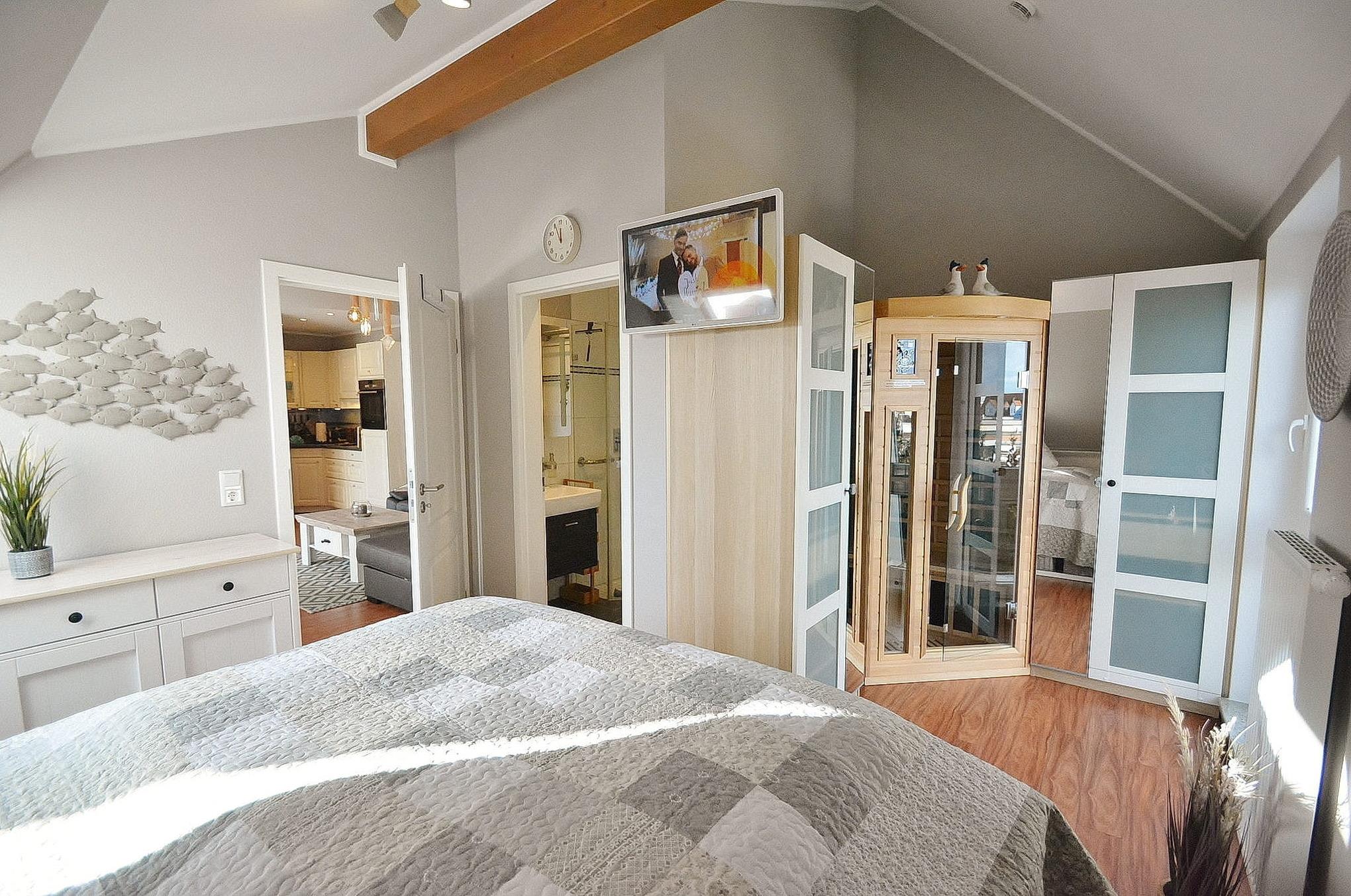 Stilvoll eingerichtetes Schlafzimmer mit direktem Zugang zum Badezimmer und zur kleinen Infrarot-Sauna. Das Schlafzimmer ist mit einem Doppelbett (1x 180x200cm), 2 Nachttischen und 2 kleinen Kleiderschränken sowie einer Kommode ausgestattet. Das Schlafzimmer ist mit Designer-Planken ausgelegt. Zur Unterhaltung stehen ein Flachbildfernseher und ein Radio zur Verfügung. Die Fenster lassen sich durch ein Innenrollo bzw. Plissees stark verdunkeln.