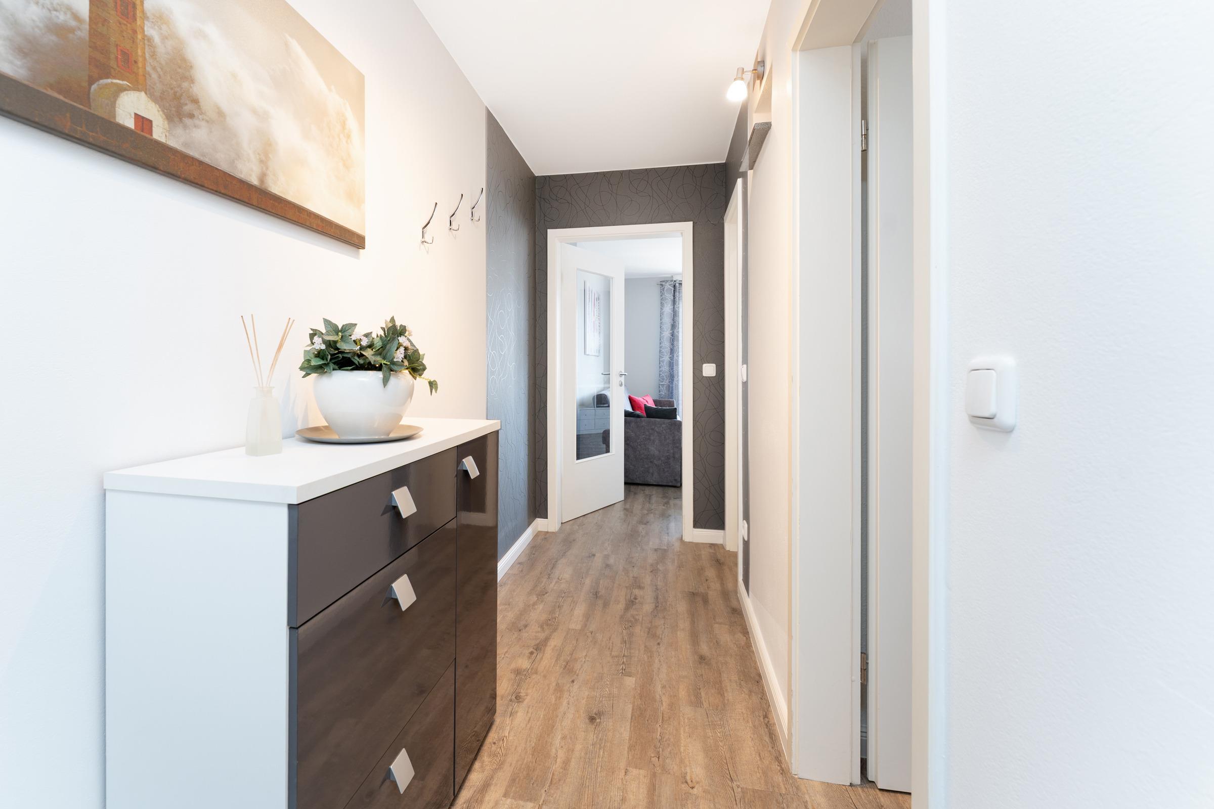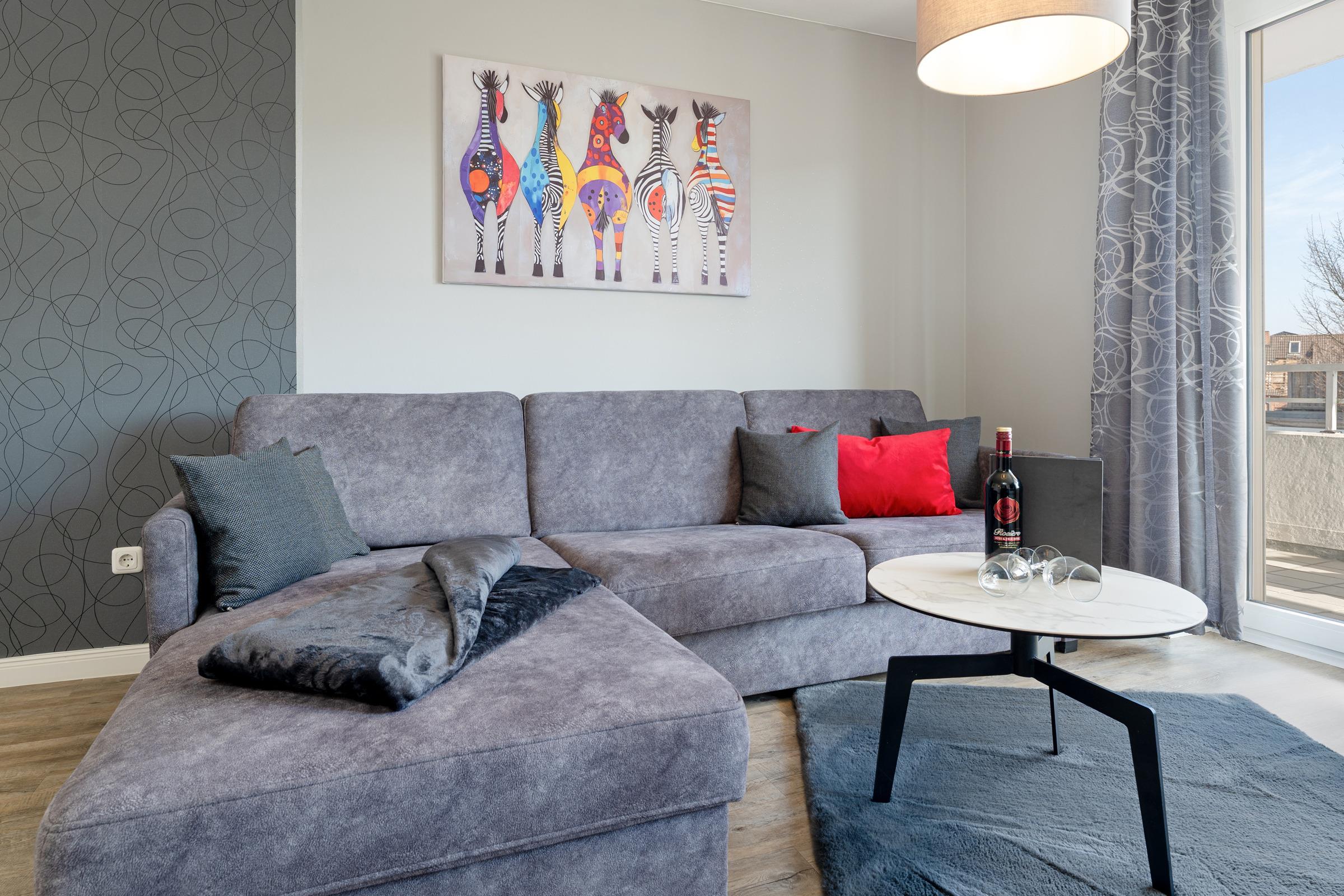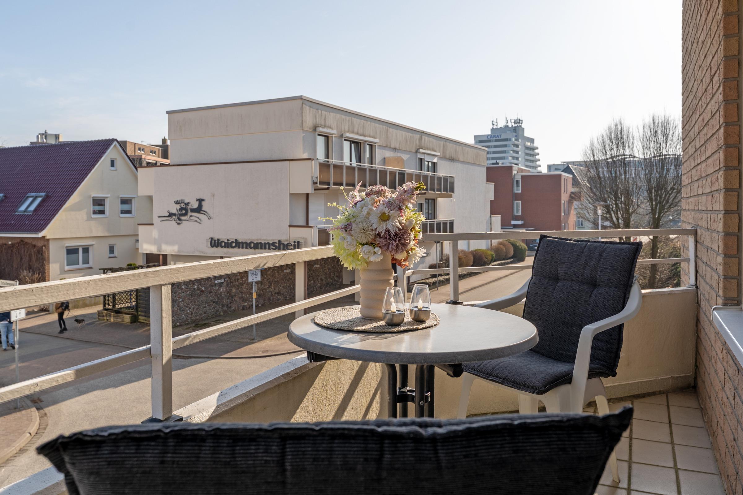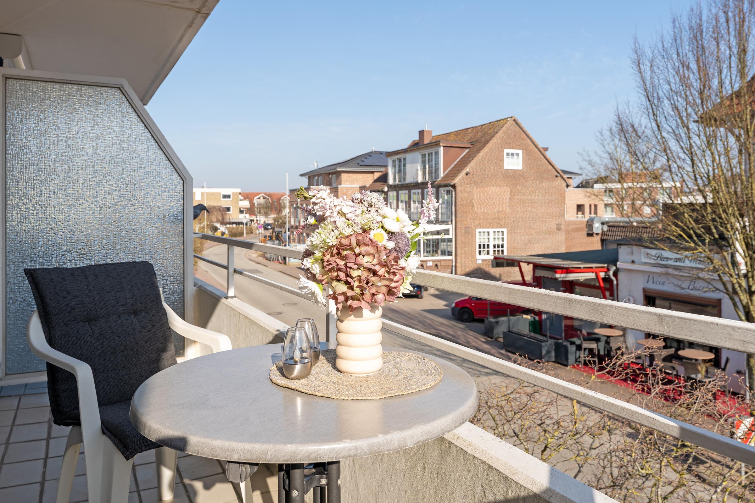 Moderne Ferienwohnung mit Balkon nahe Strand und Seebrücke in Grömitz, ideal für entspannte Ostseeferien.