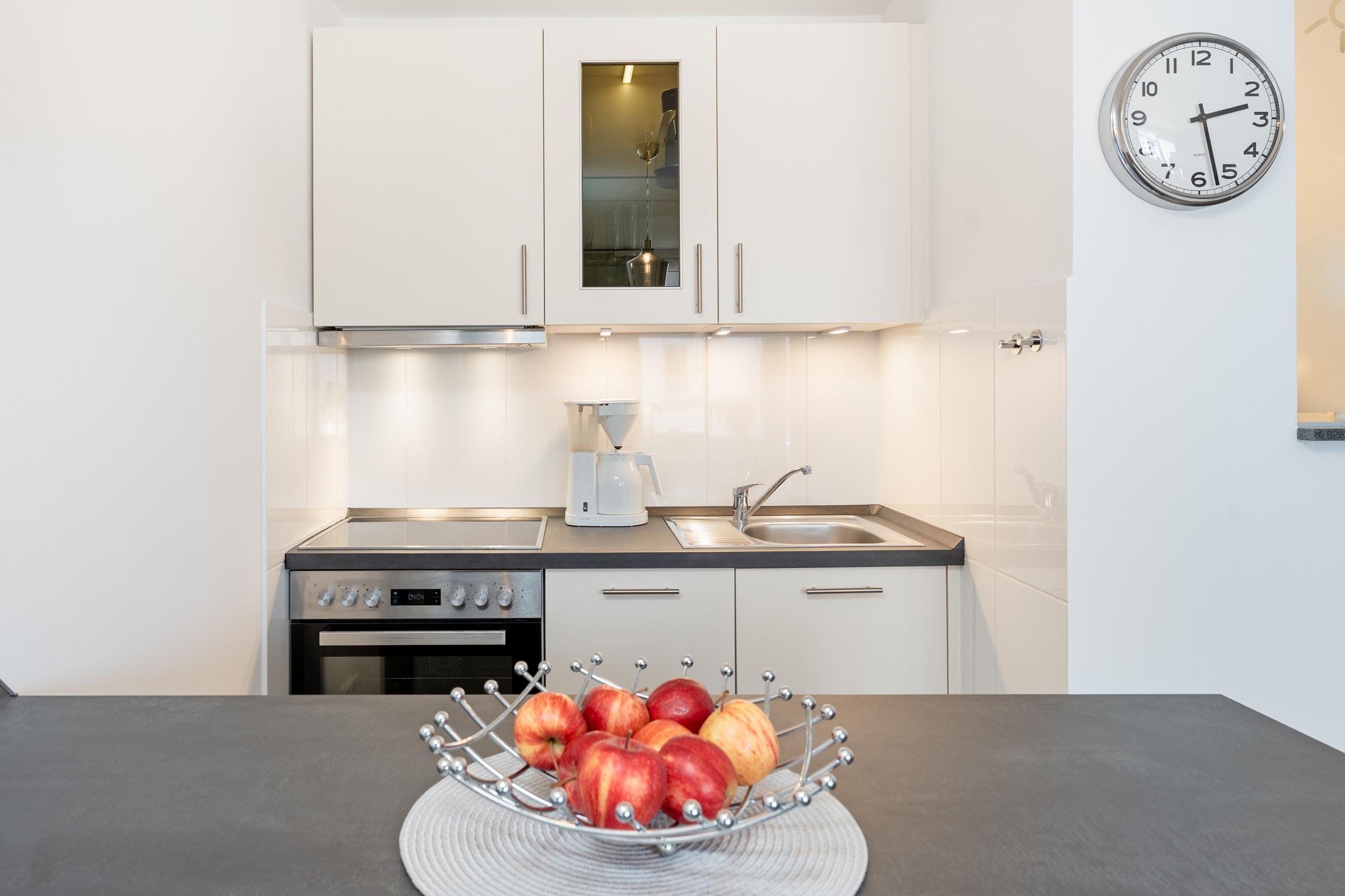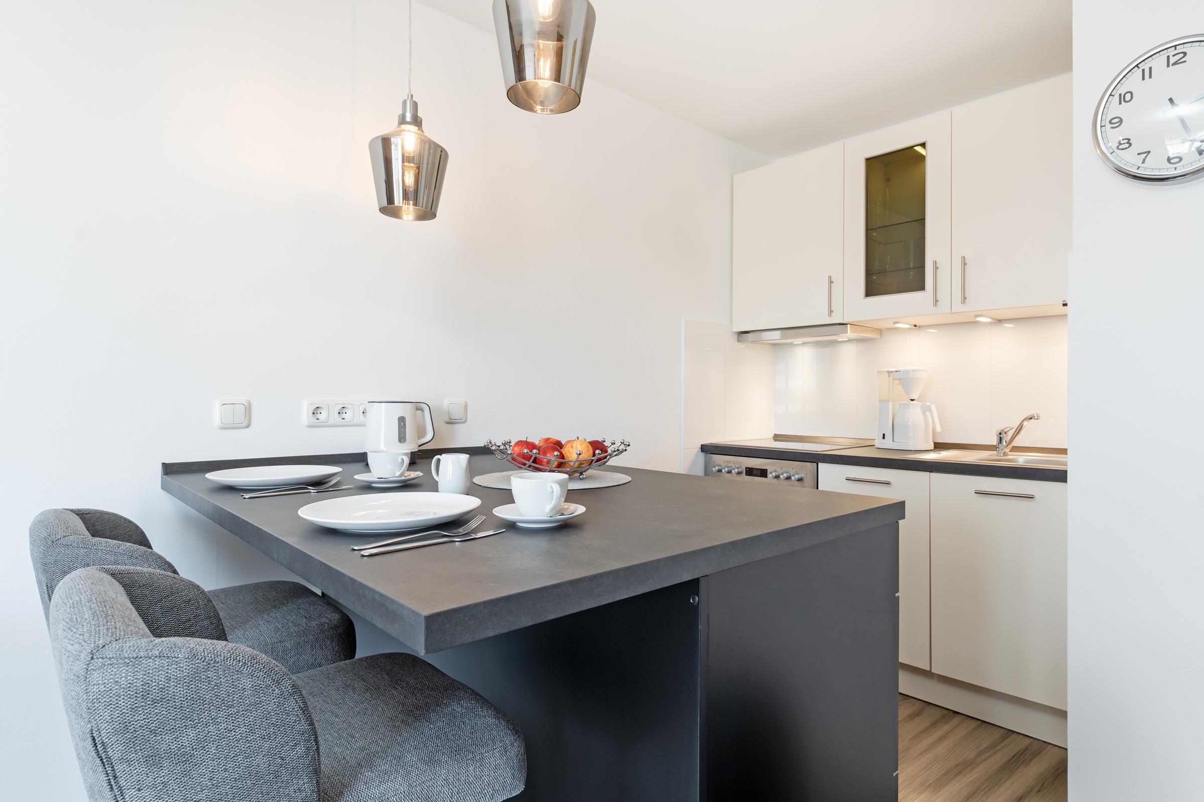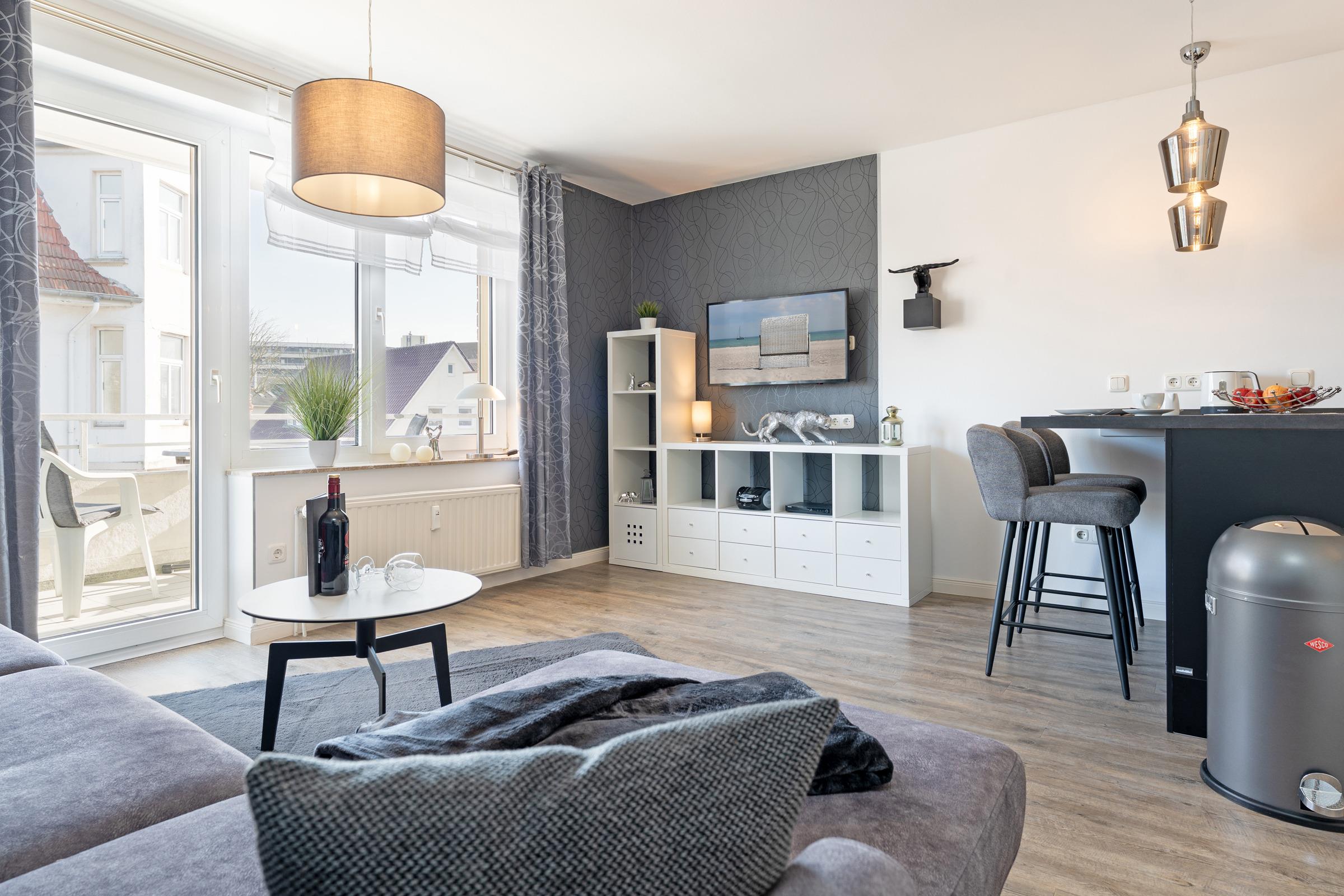 Der helle Wohnbereich mit integrierter Küchenzeile lädt zum Entspannen ein. Die Küche ist ausgestattet mit Cerankochfeld, Backofen und bietet alles für einen gelungenen Aufenthalt. Vom Wohnbereich gelangen Sie direkt auf den möblierten Balkon, ideal für entspannte Abende im Freien.