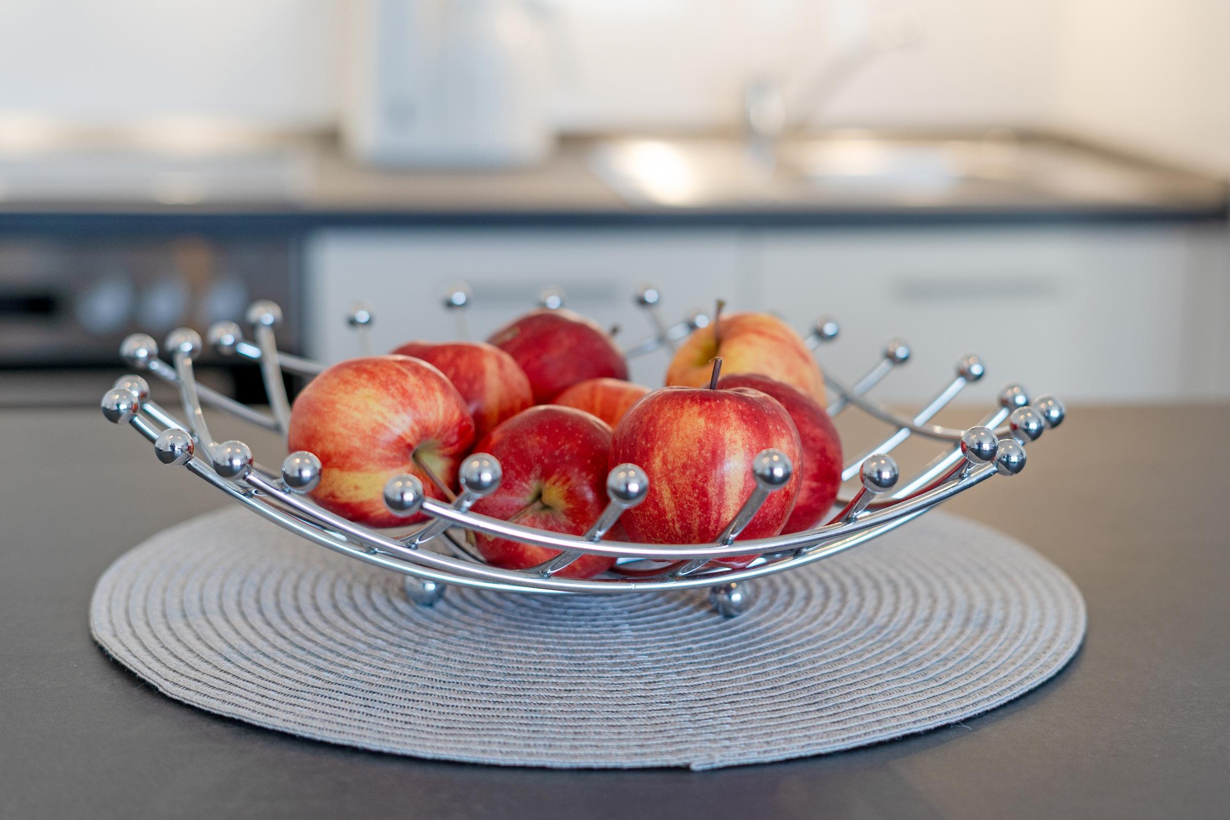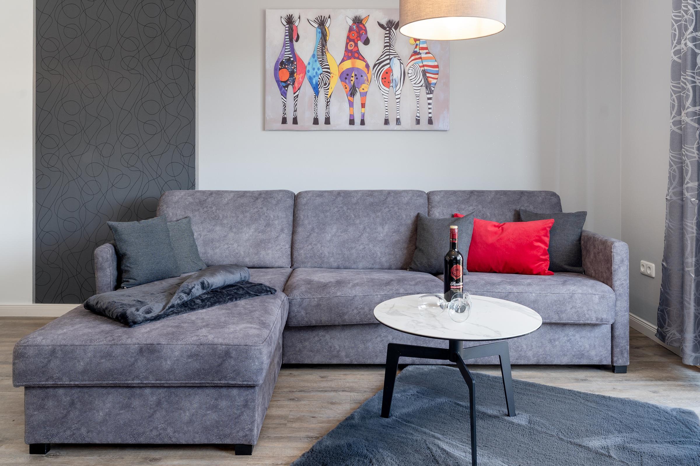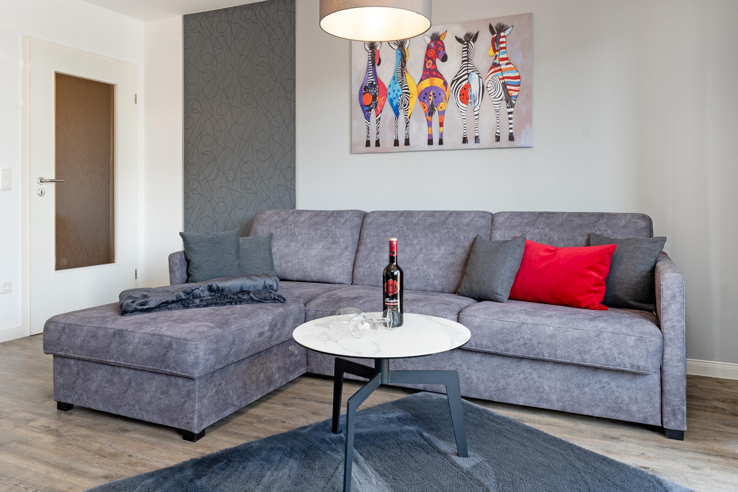 Der helle Wohnbereich mit integrierter Küchenzeile lädt zum Entspannen ein. Die Küche ist ausgestattet mit Cerankochfeld, Backofen und bietet alles für einen gelungenen Aufenthalt. Vom Wohnbereich gelangen Sie direkt auf den möblierten Balkon, ideal für entspannte Abende im Freien.