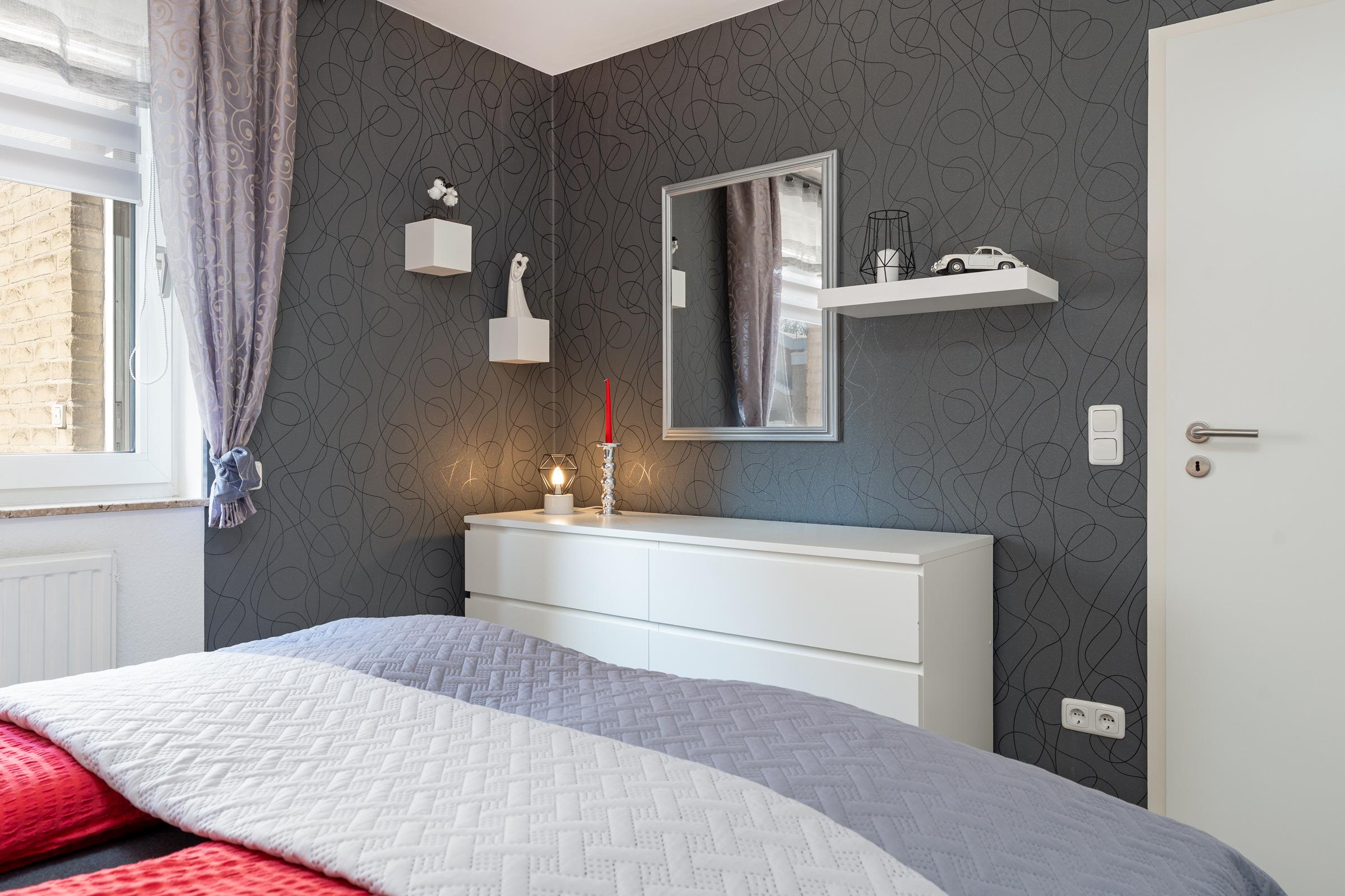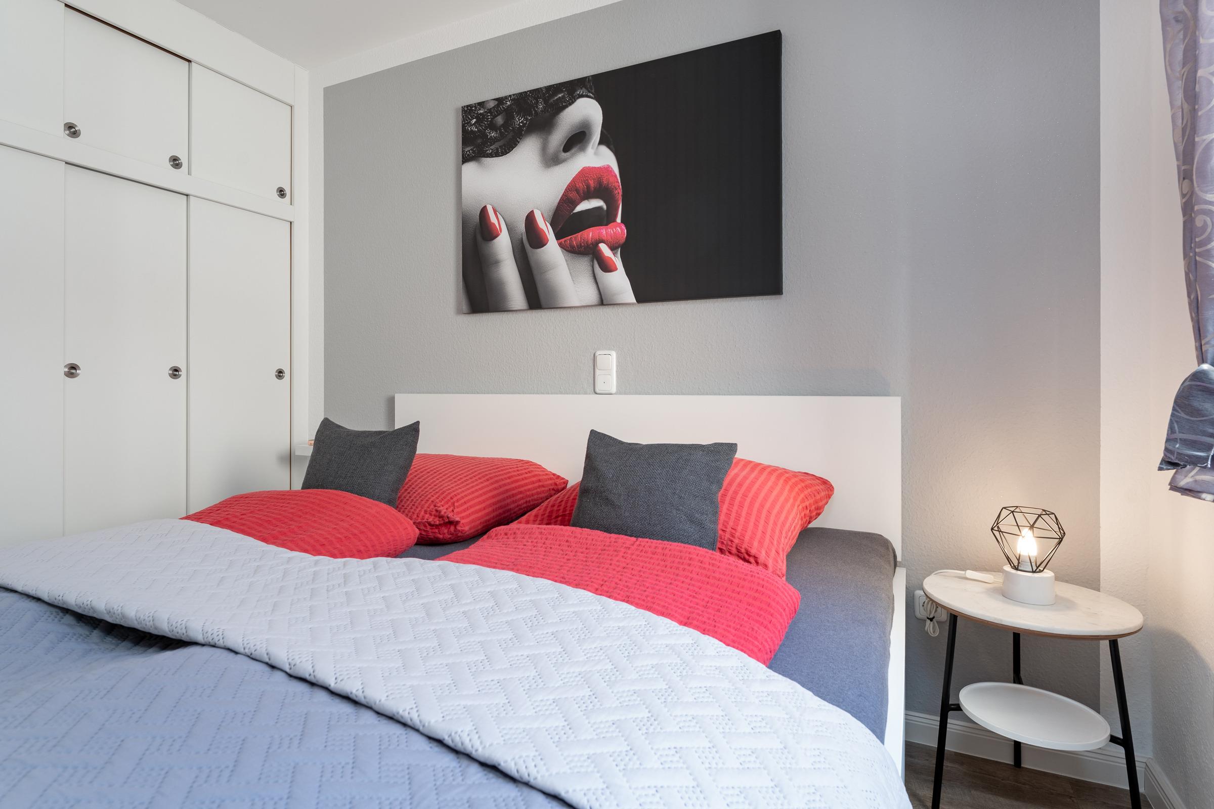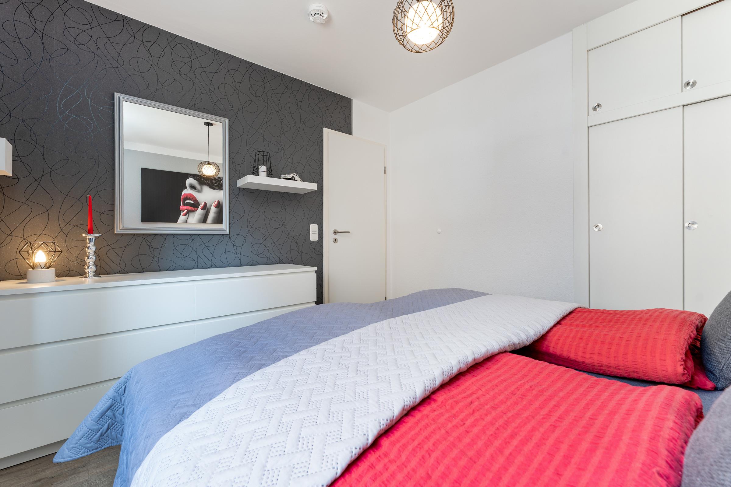 Schlafzimmer: 1 Doppelbett (2x 80x200 cm), kein Platz für ein Kinderbett, Kleiderschrank, Verdunklungsmöglichkeiten (Außenjalousie)