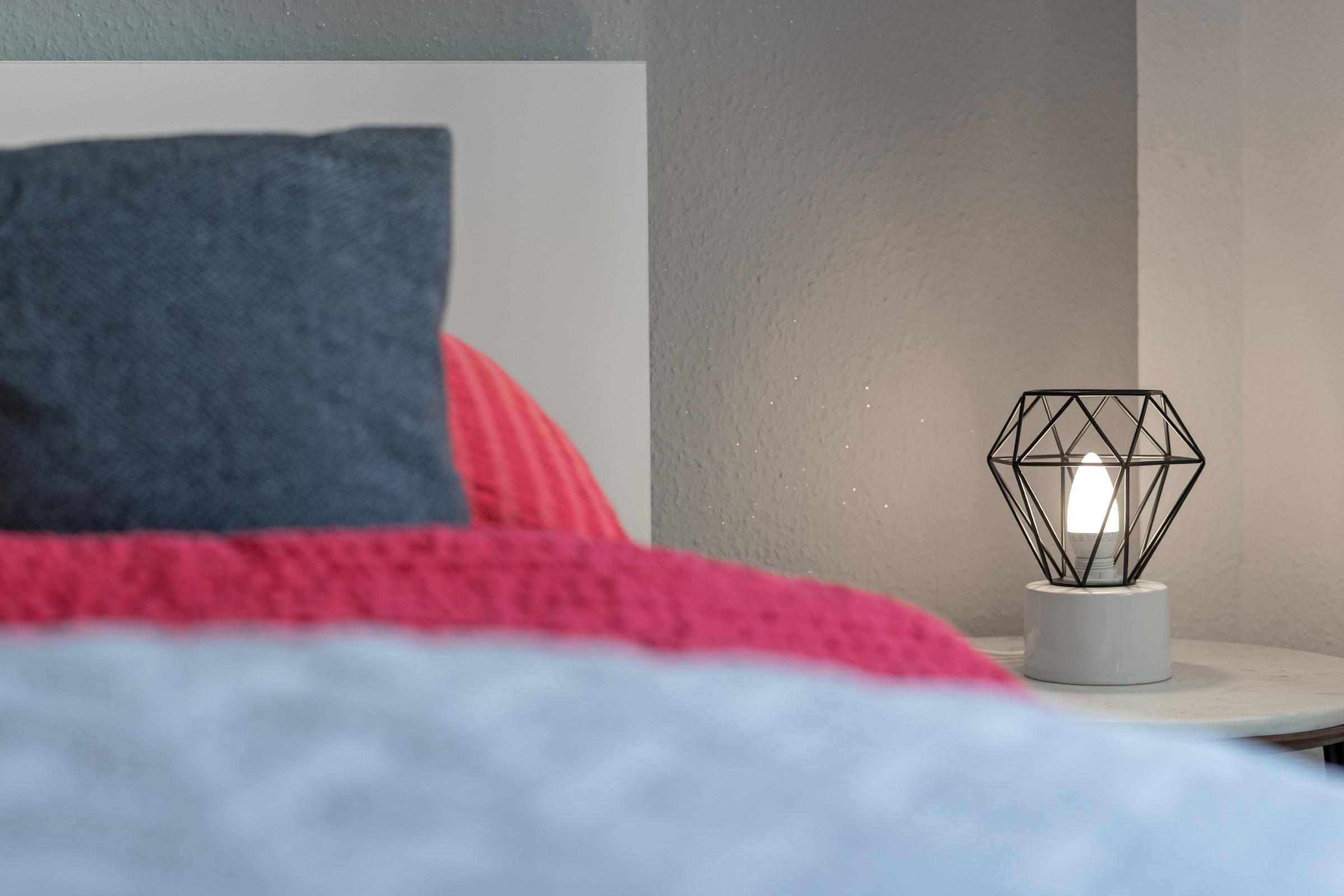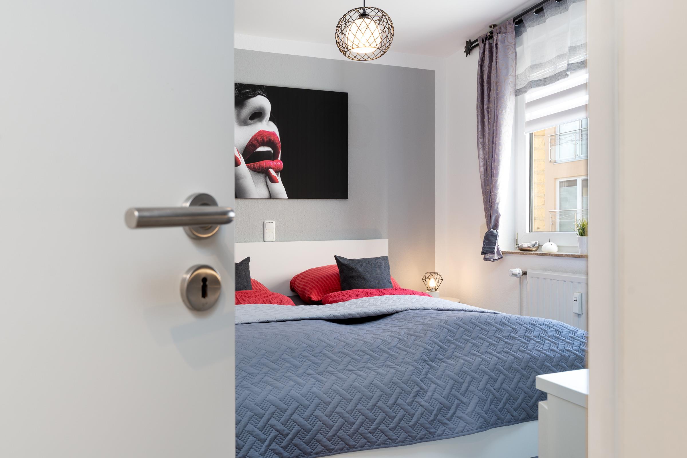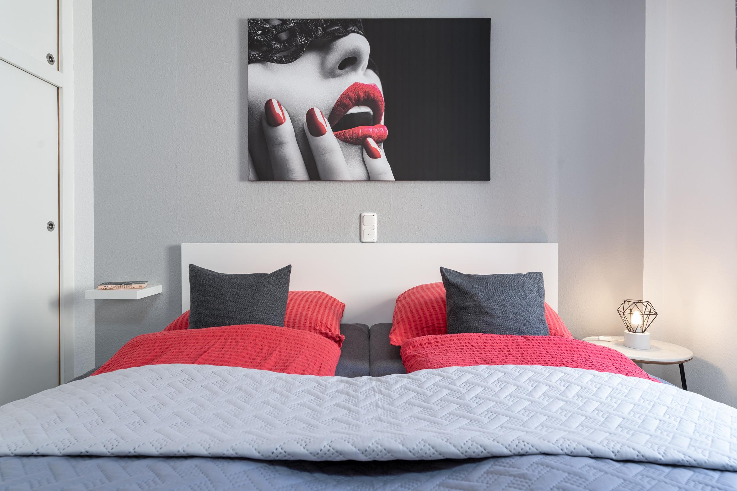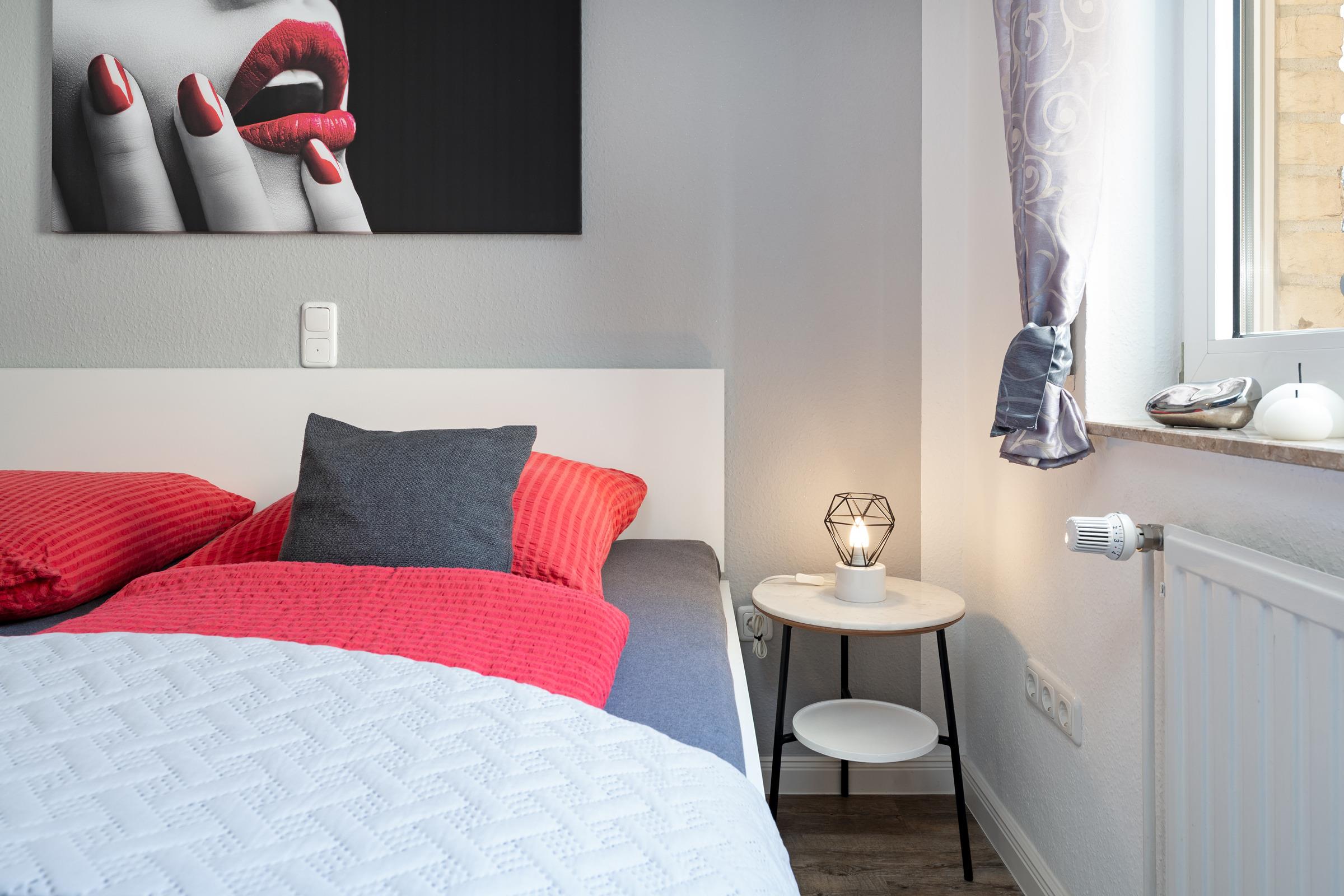 Schlafzimmer: 1 Doppelbett (2x 80x200 cm), kein Platz für ein Kinderbett, Kleiderschrank, Verdunklungsmöglichkeiten (Außenjalousie)