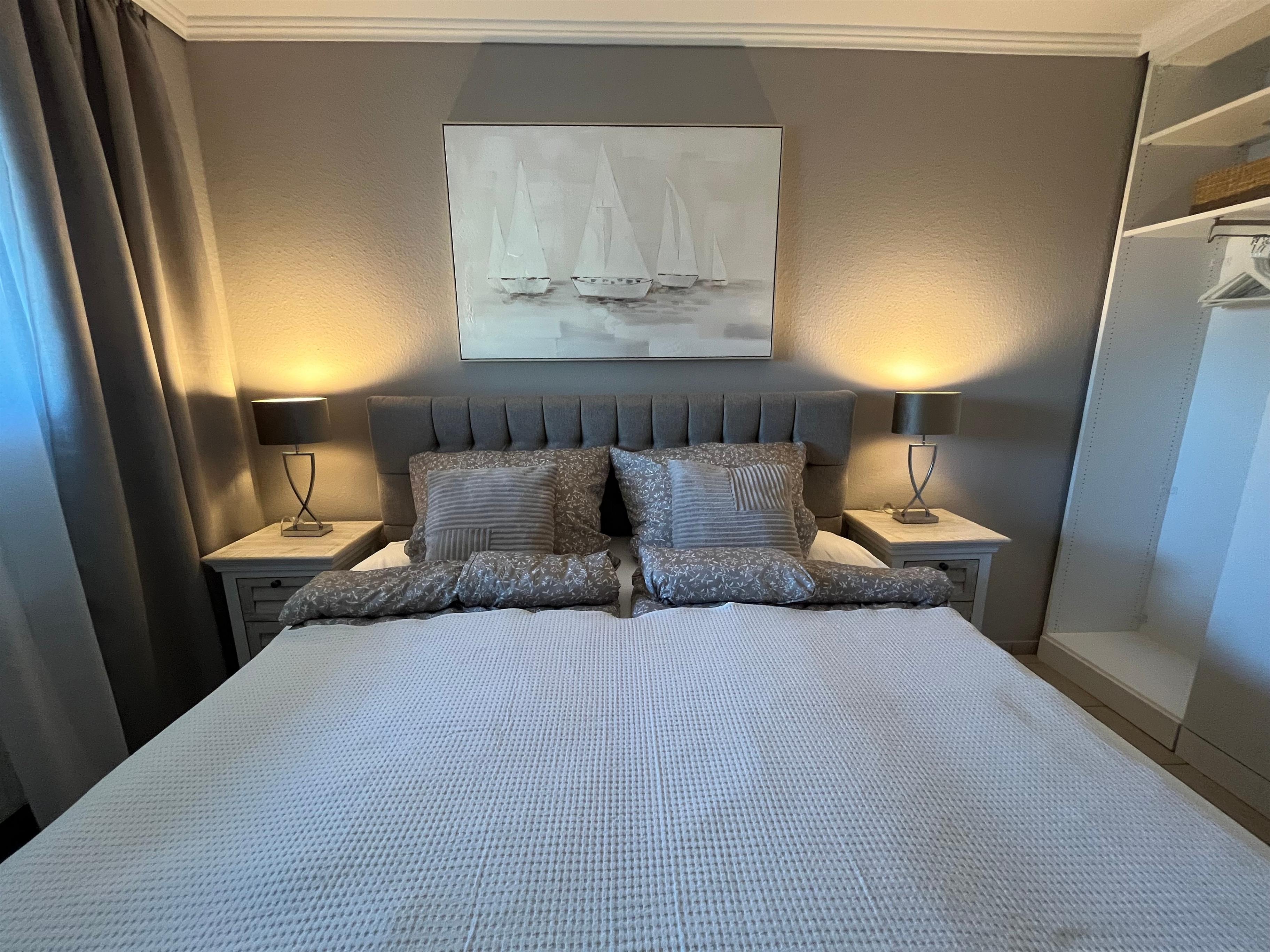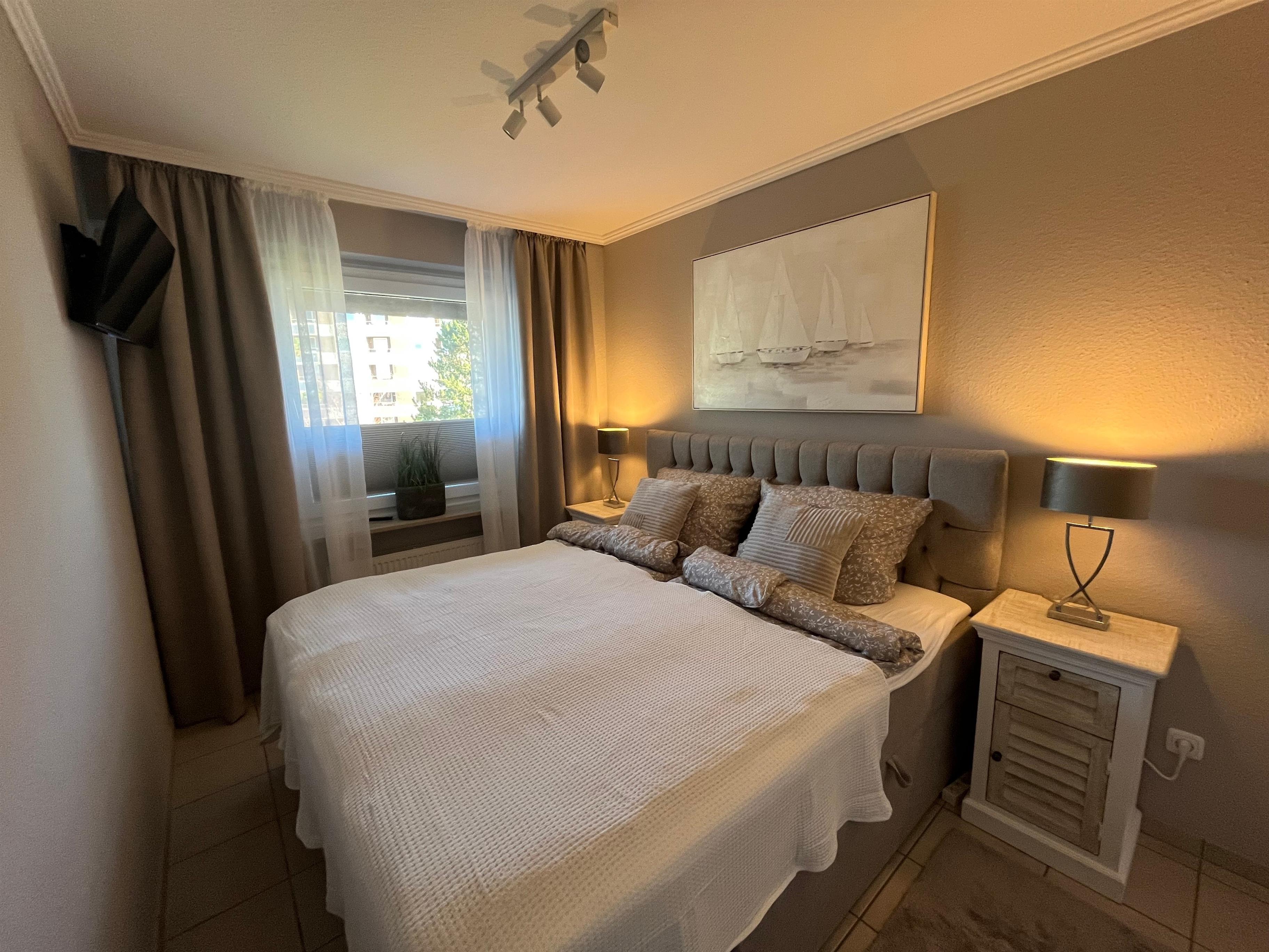 Das Schlafzimmer verfügt über ein geräumigen Kleiderschrank, ein hochwertiges Boxspringbett und einen weiteren Fernseher. Ein Verdunkelungsplissee sorgt für einen erholsamen Schlaf.
