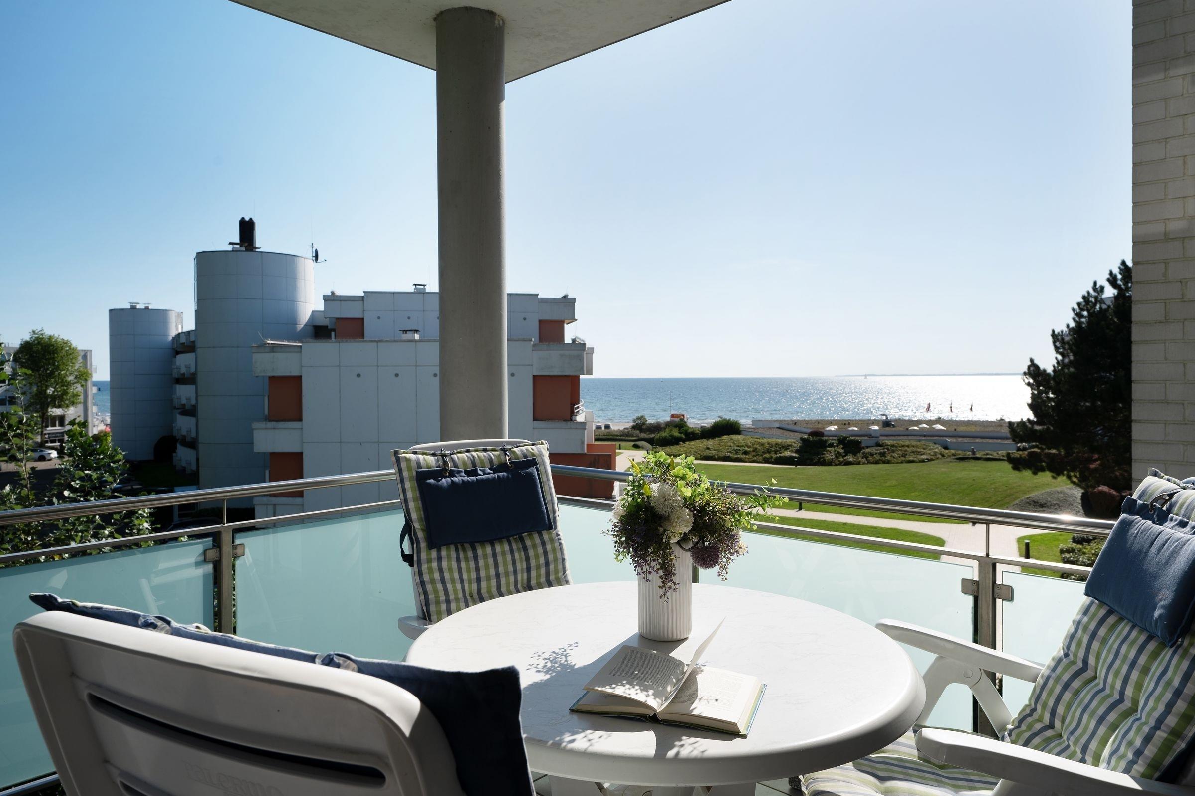 Ferienwohnung in bester Lage von Grömitz: Großzügige 3-Zimmer-Ferienwohnung im 2. Stock mit Balkon und Meerblick sowie einer Wohnfläche von ca. 76 m² für bis zu 3 Personen.