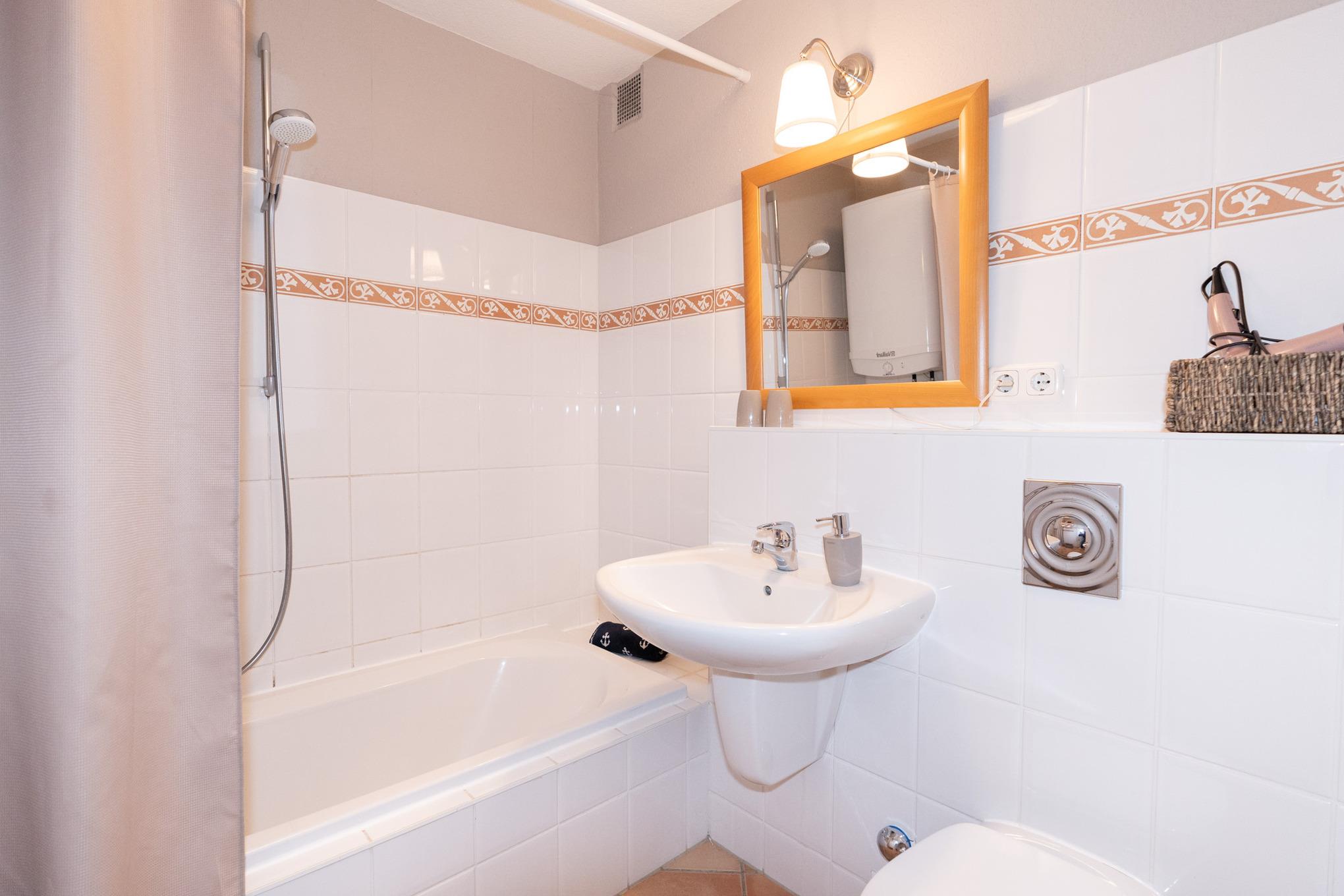 Das Badezimmer verfügt über eine Badewanne mit Duschvorhang, Waschbecken und ein Hänge-WC. Ablagen und ein kleiner Schrank bieten Platz für Ihre Hygieneartikel.