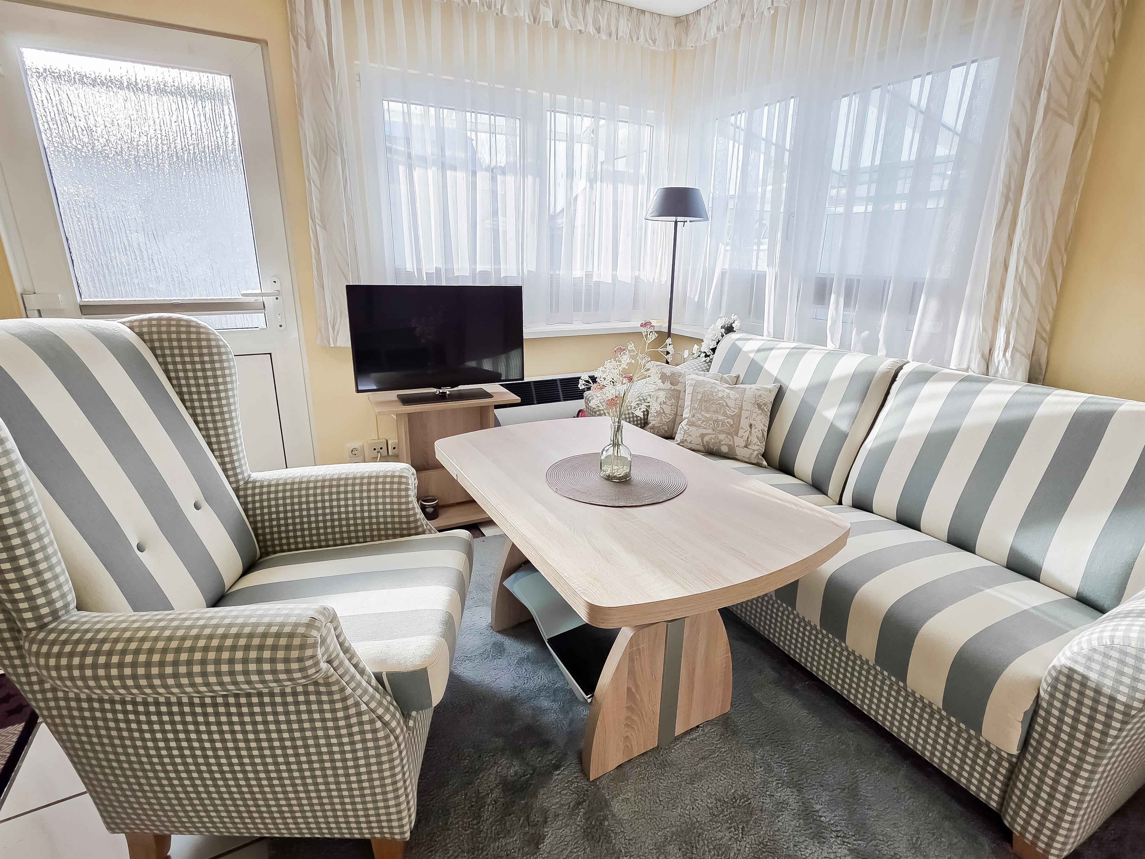 Couch, Sessel, verstellbarem Couchtisch und Fernseher: Bequeme Sitzecke mit Teppichboden zum Entspannen nach einem aktiven Tag.