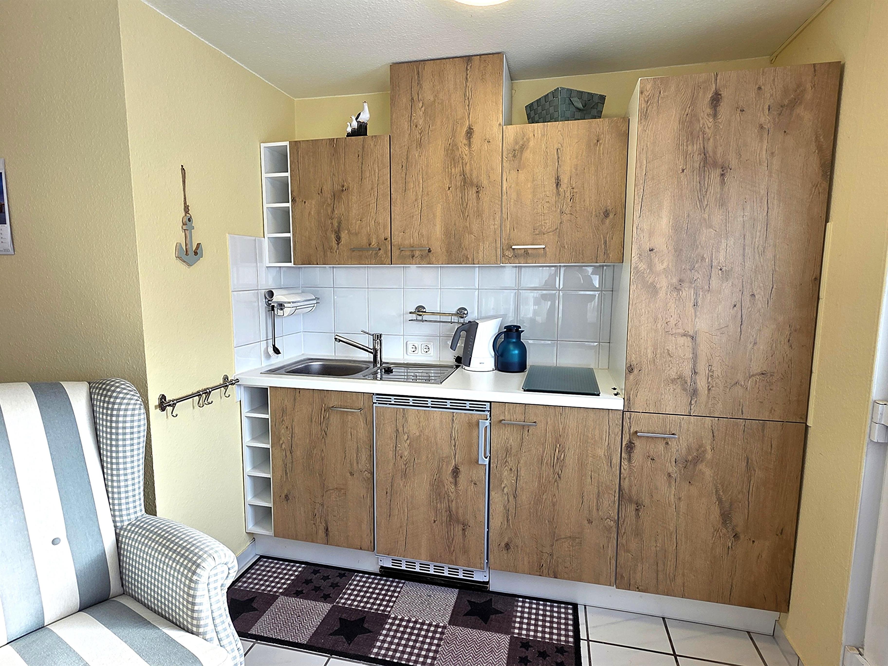 ~ Küchenzeile mit vielen Annehmlichkeiten: Induktionsherd, Toaster, Wasserkocher, Thermoskanne mit Kaffeefilter zum Aufbrühen, sowie Geschirr- und Kochgeschirr-Set: Pfannen, Töpfe, Besteck, Gläser und alles, was Sie für eine entspannte Selbstversorgung brauchen.