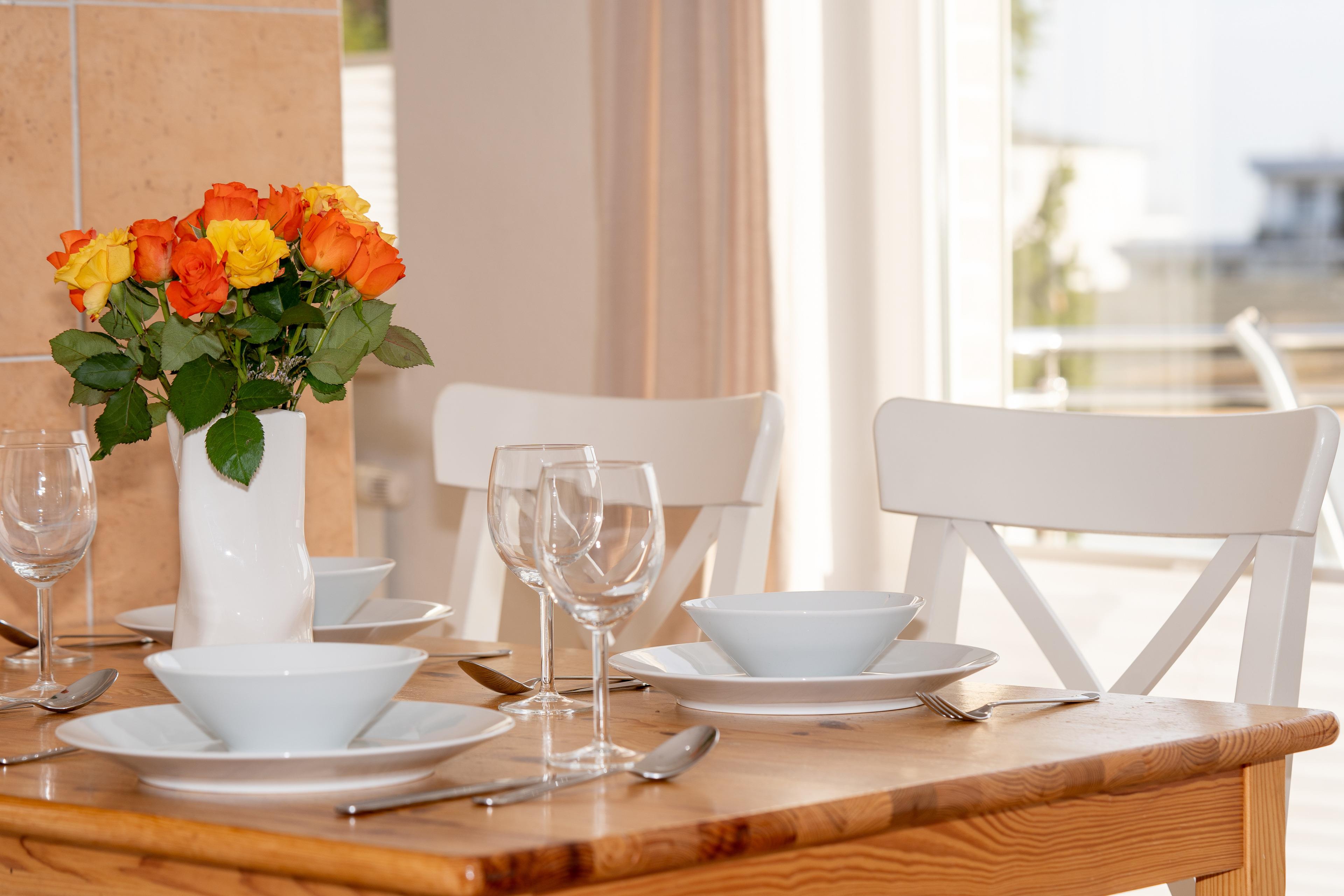 Die helle und komfortable Einrichtung sorgt für ein einladendes Ambiente. Vom großzügigen Flur aus gelangen Sie ins Schlafzimmer mit einem gemütlichen Doppelbett (2x90x200 cm), ins Badezimmer, das mit einem beheizbaren Handtuchhalter und Fußbodenheizung ausgestattet ist, sowie ins Kinderzimmer mit zwei Einzelbetten (2x90x200 cm). Der lichtdurchflutete Wohn-/Essbereich bietet direkten Zugang zum möblierten Balkon, auf dem Sie die Ruhe und den saisonal eingeschränkten Blick auf die Ostsee genießen können. Hier fühlt sich der Urlaub wie Entspannung pur an!