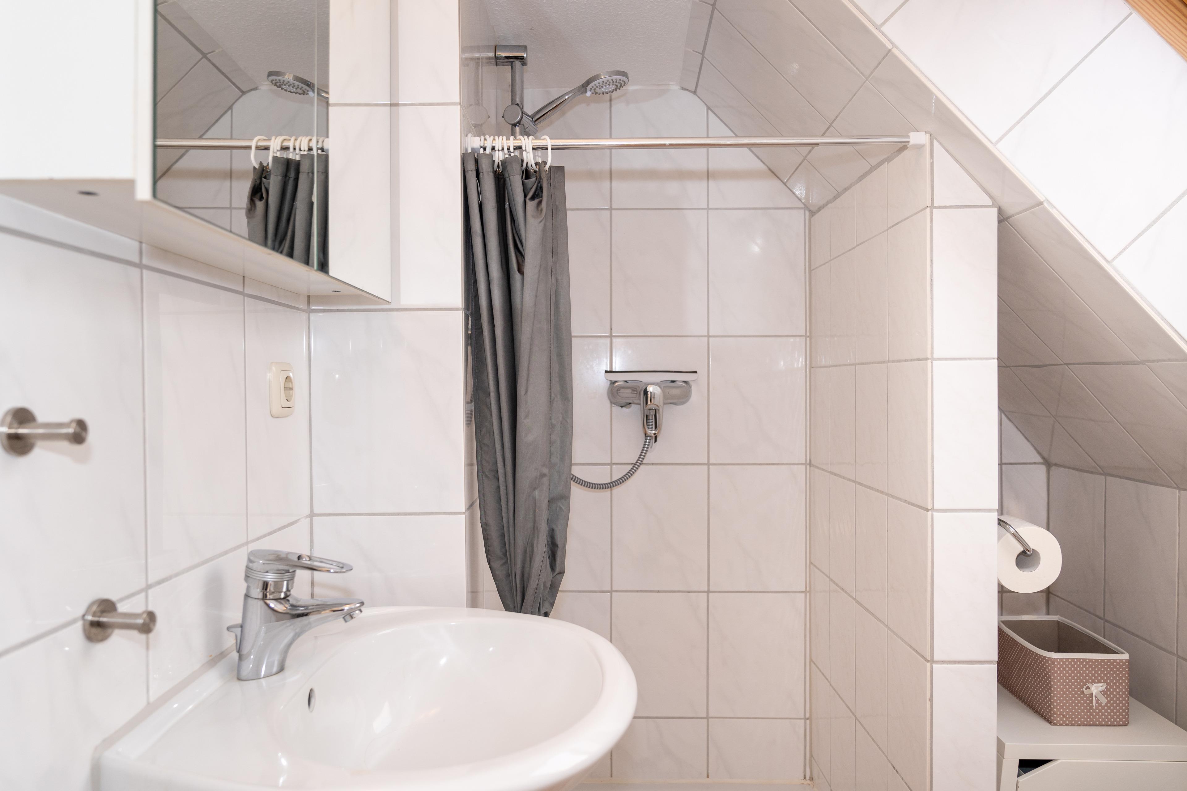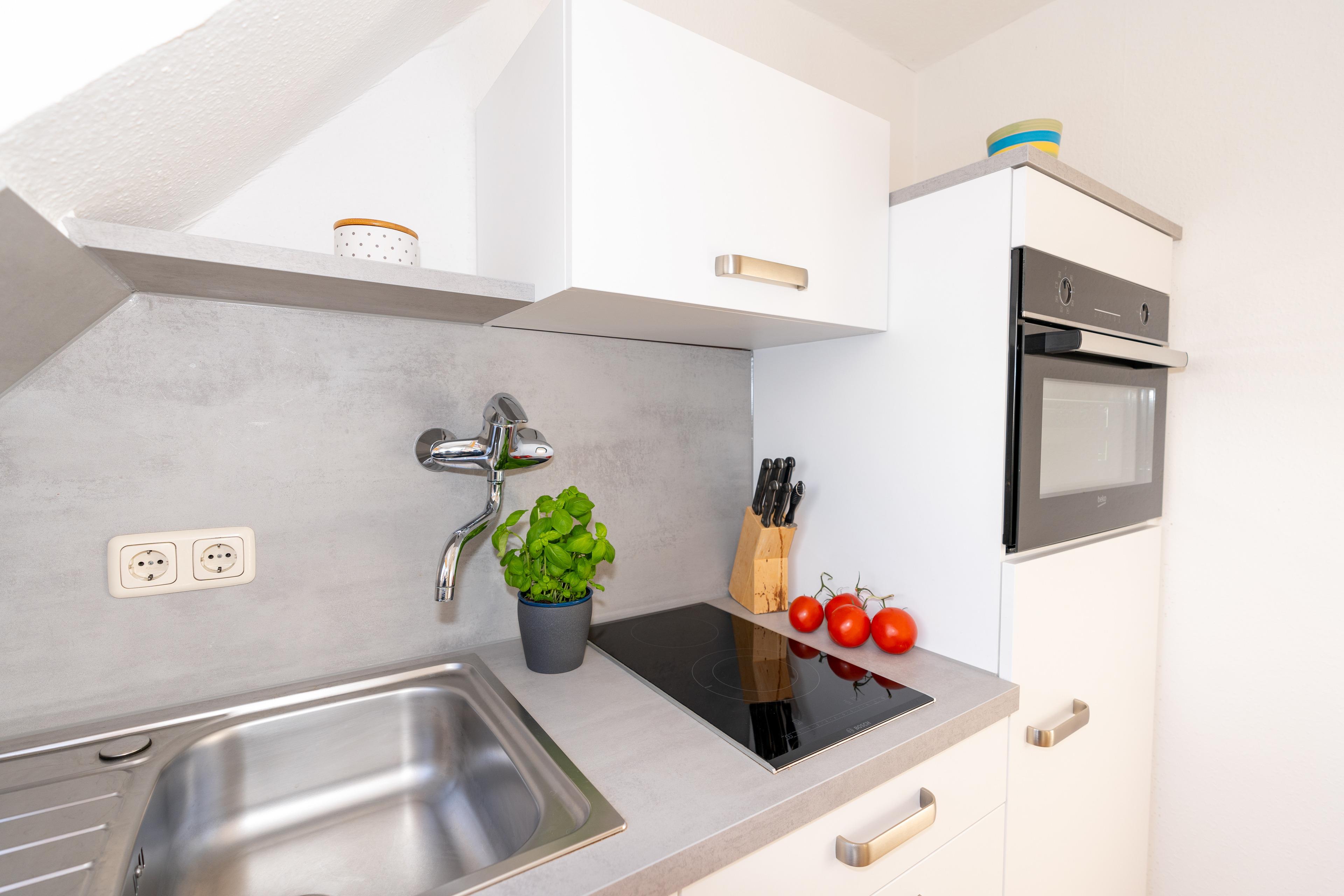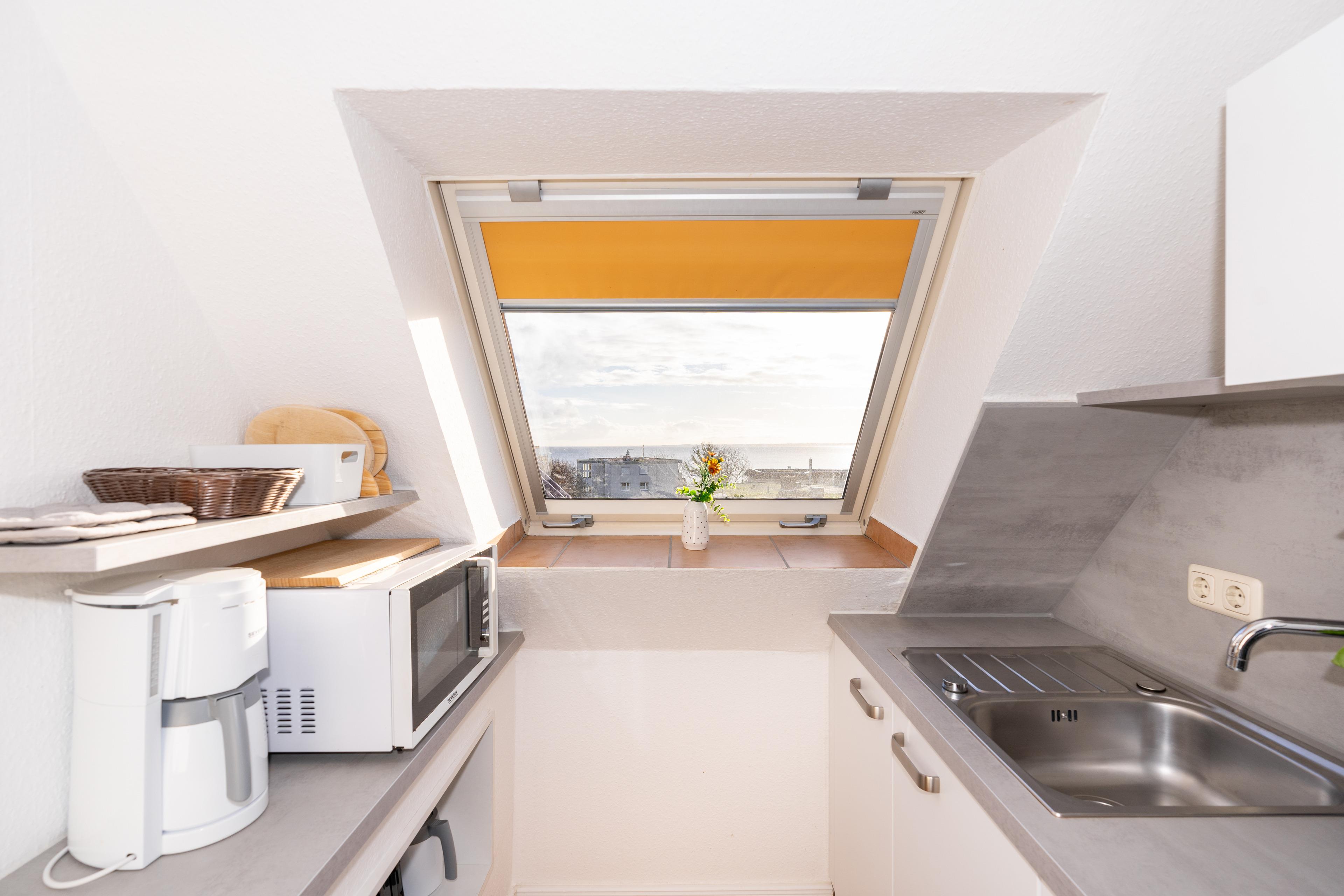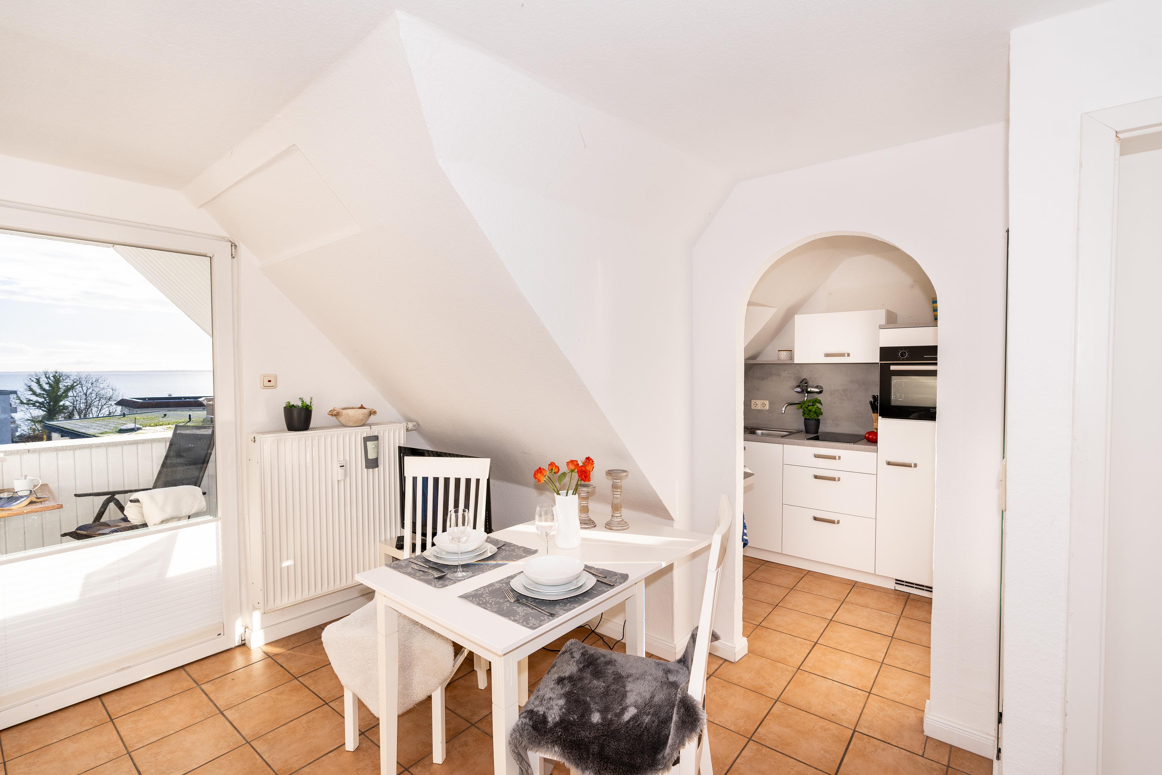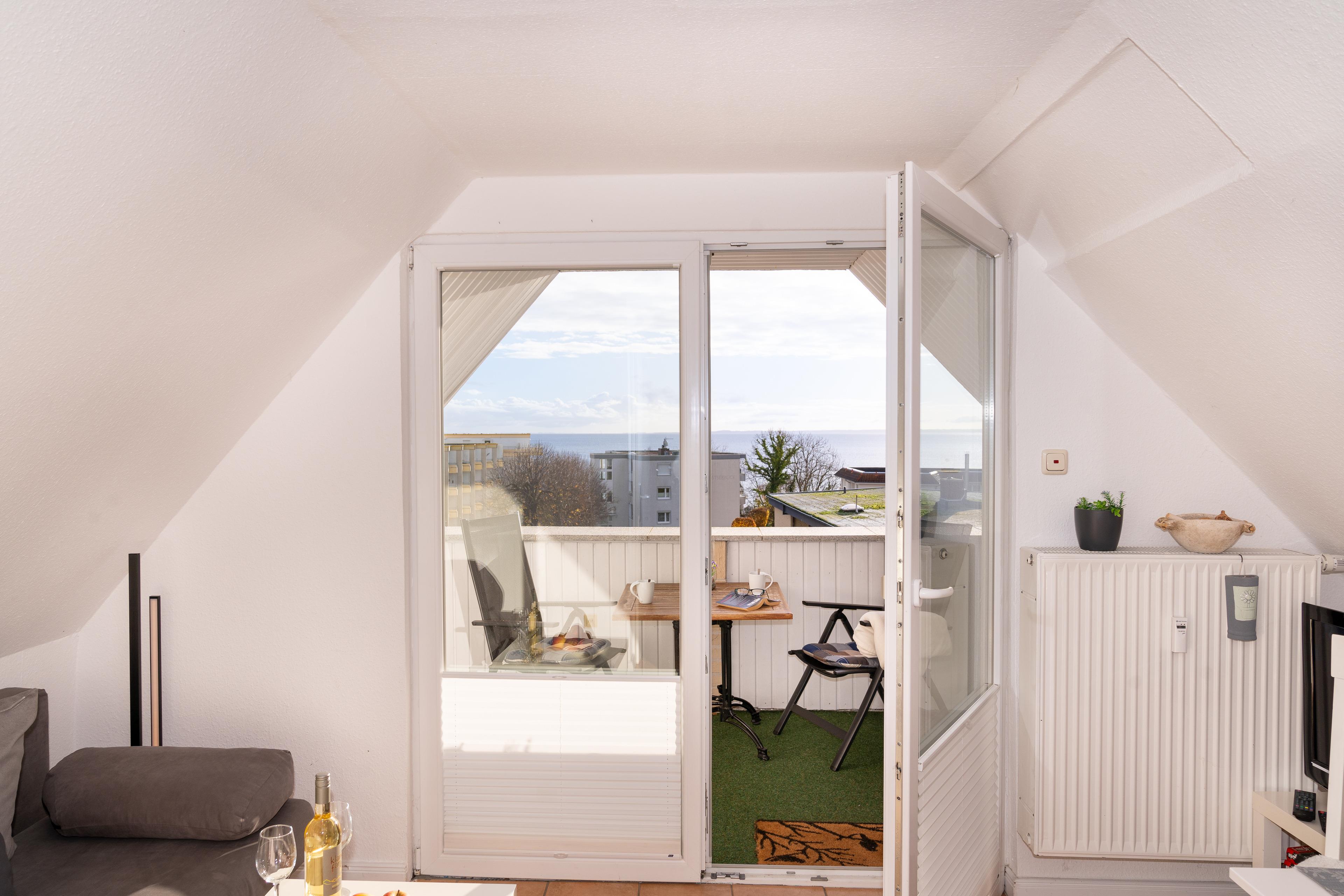 Der Wohnbereich dieser charmanten Wohnung erstreckt sich über ca. 40 m² und ist ausgestattet mit einem bequemen Doppelbett (2x 90x200 cm), einem Kleiderschrank, einer Kommode und einem Essplatz für zwei Personen. Ein Flatscreen-TV sowie eine gemütliche Couch sorgen für zusätzlichen Komfort und eignen sich perfekt für einen romantischen Urlaub zu zweit. Die kleine, separate Küche ist mit einem 2-Plattenherd und einer Mikrowelle ausgestattet. Das Duschbad ist geschickt unter den gemütlichen Dachschrägen untergebracht. Die clevere Raumaufteilung ermöglicht es, den Wohnbereich in zwei funktionale Zonen zu unterteilen. Außerdem gelangen Sie vom Wohnbereich direkt auf den überdachten Balkon, der Ihnen einen herrlichen Blick auf die Ostsee bietet.