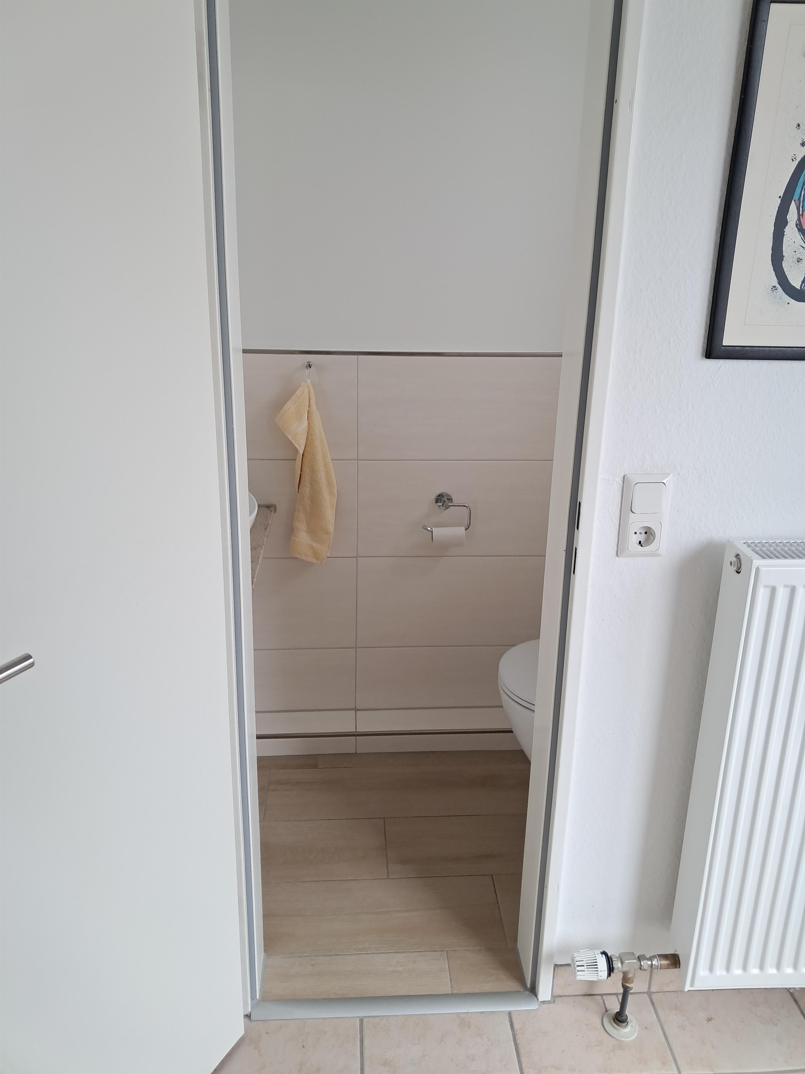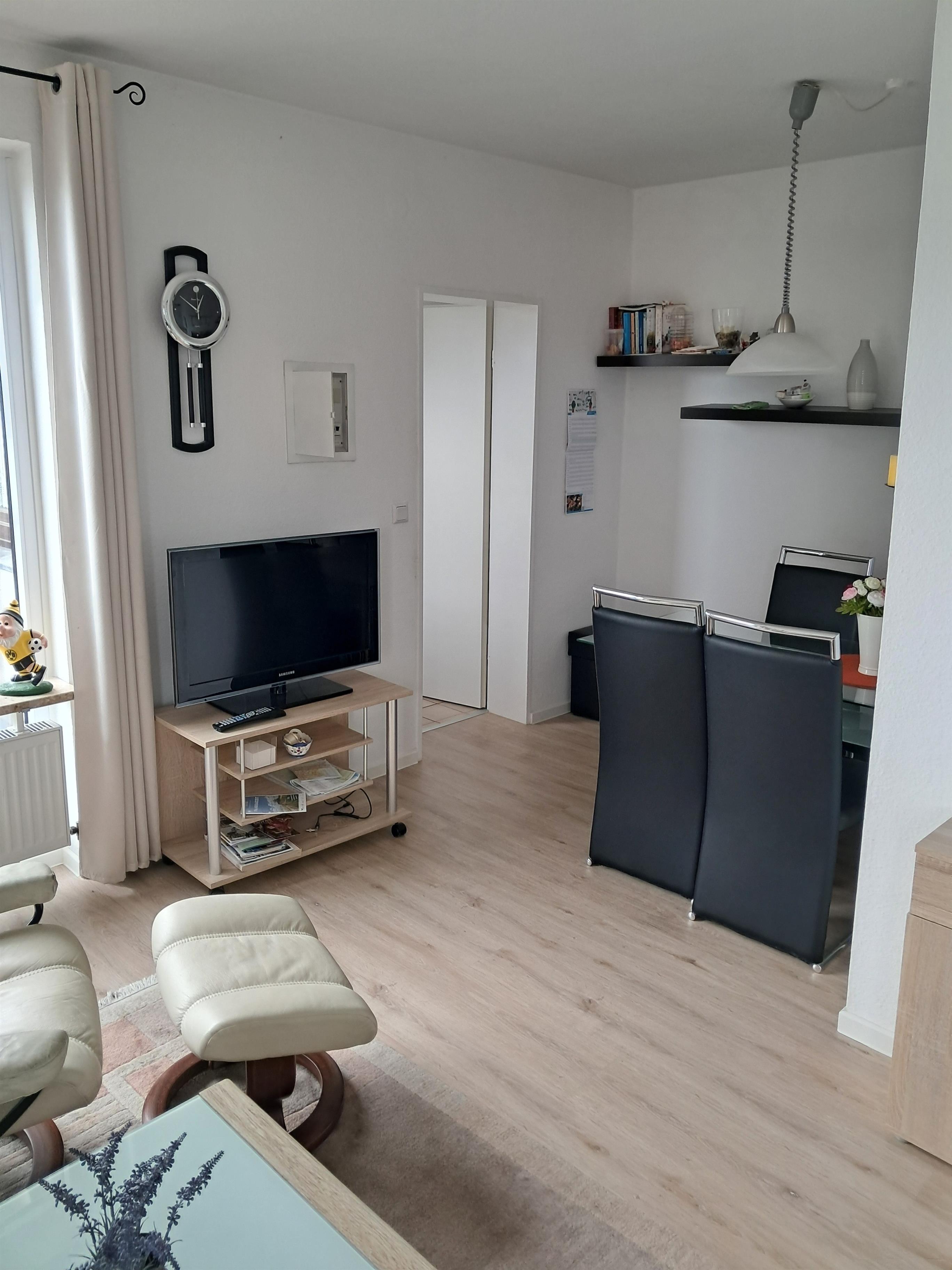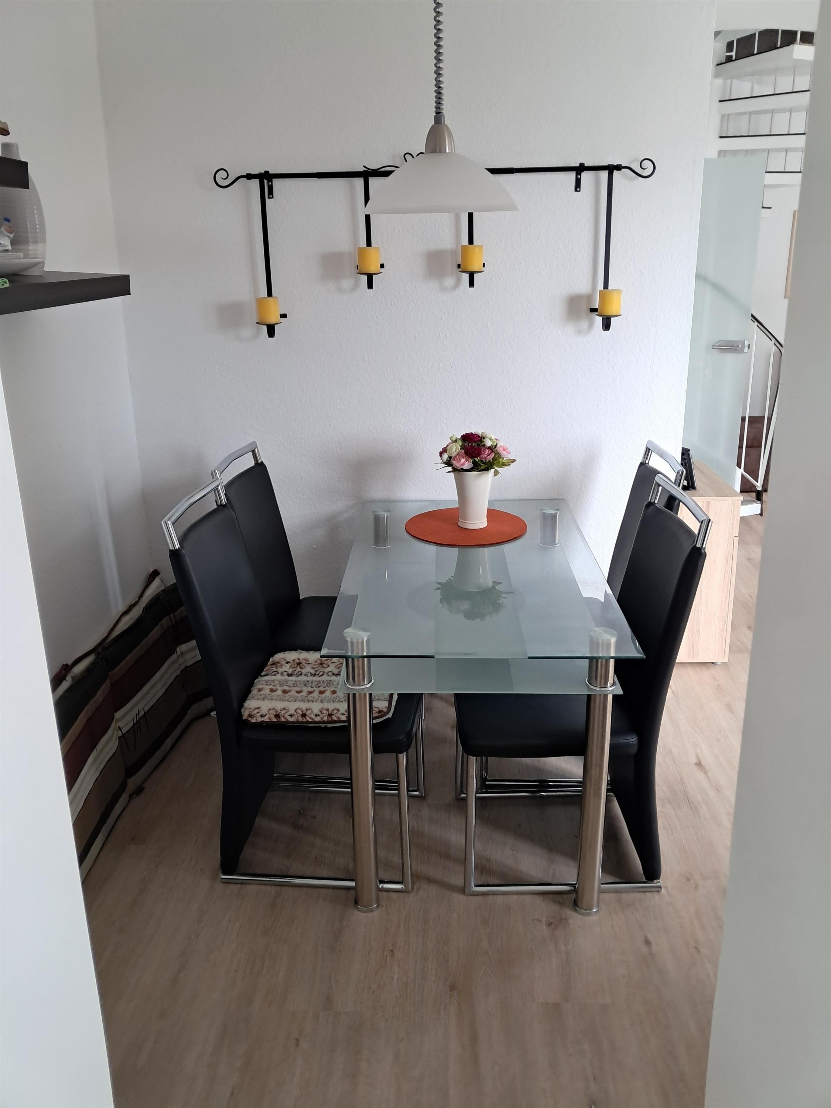 Sie finden unsere Wohnung in der 1. Etage. Über einen Laubengang gelangen Sie in einen kleinen Flur. Daran grenzt das Gäste WC. Vom Flur aus betreten Sie das Wohnzimmer, von wo aus Sie auf die ca. 20 qm große Balkonterrasse gelangen. Auf dem Süd/West-Balkon finden Sie gemütliche Sitzgelegenheiten und einen großen Tisch. Im Wohnzimmer befindet sich ein 4-Personen-Essplatz, welcher direkt an die vollausgestattete Küche (mit älterer Ausstattung) grenzt.