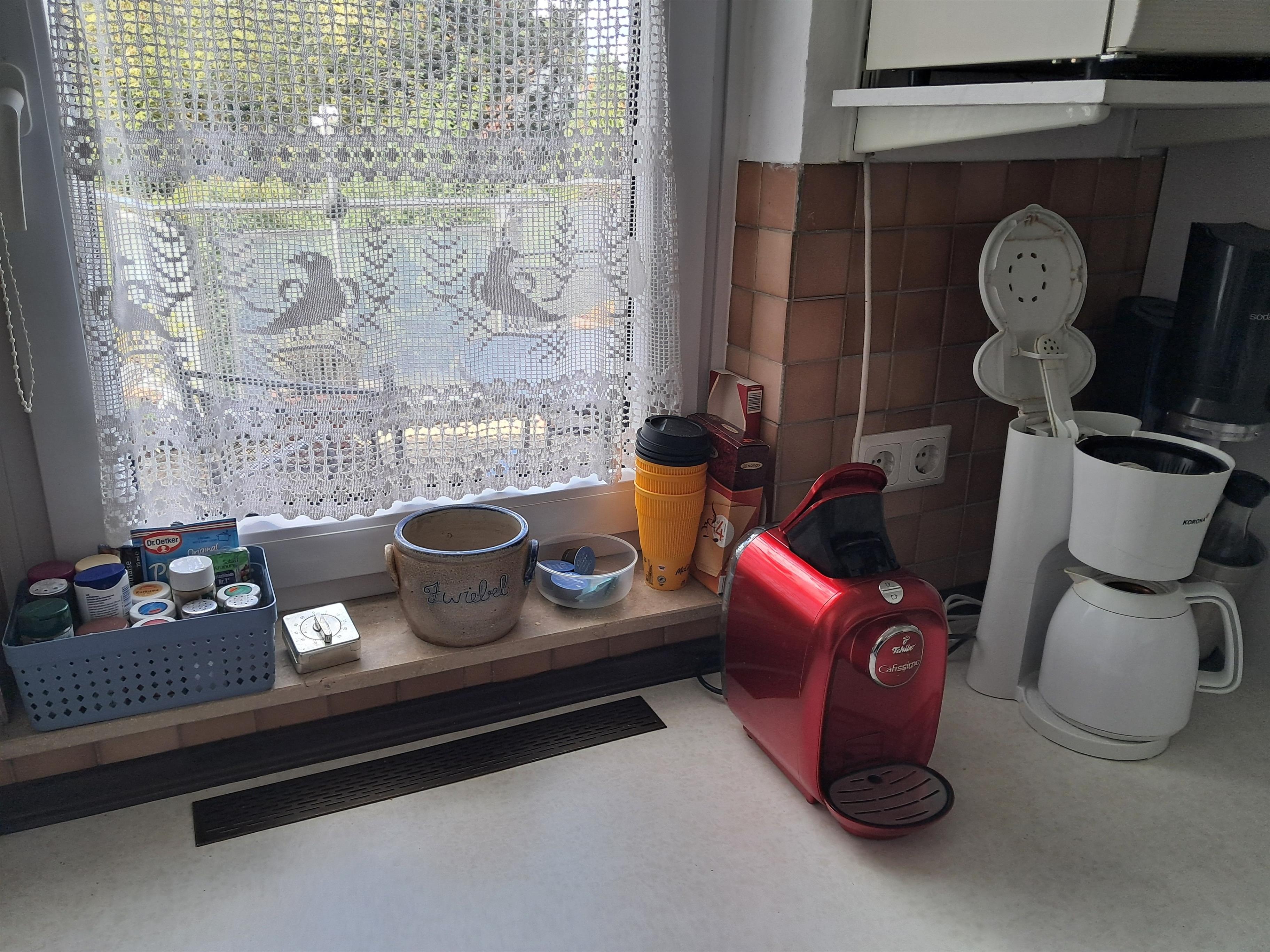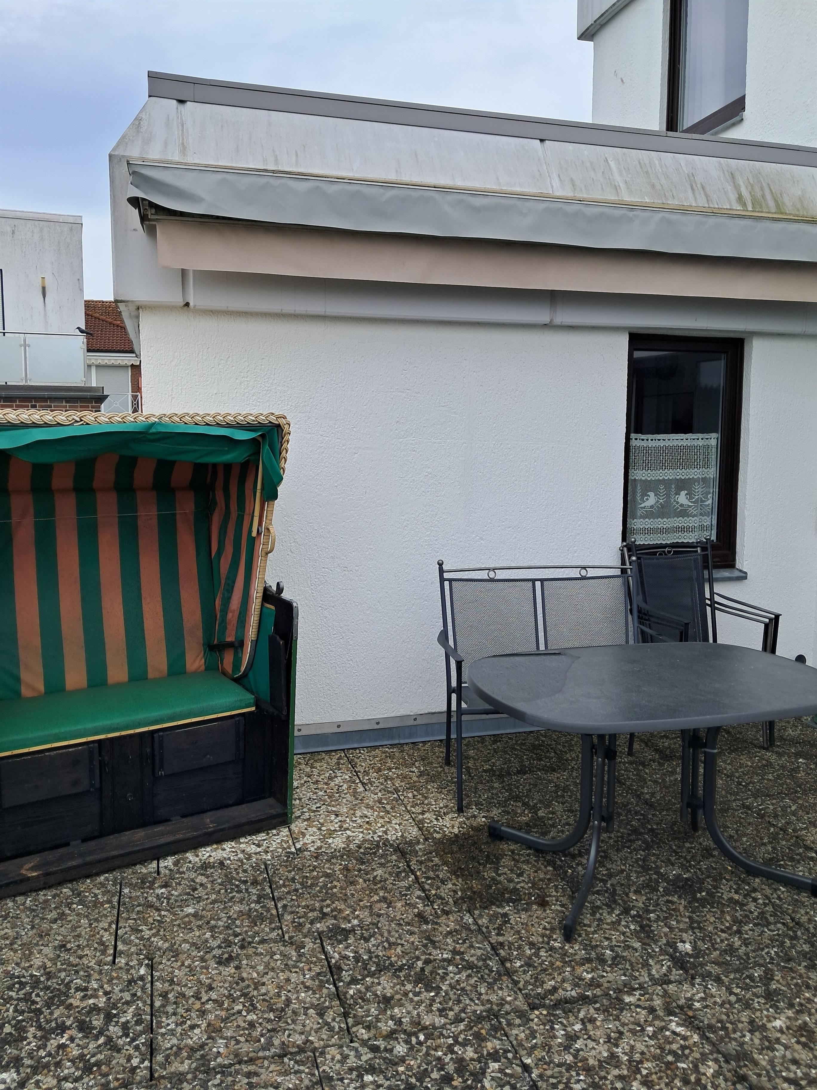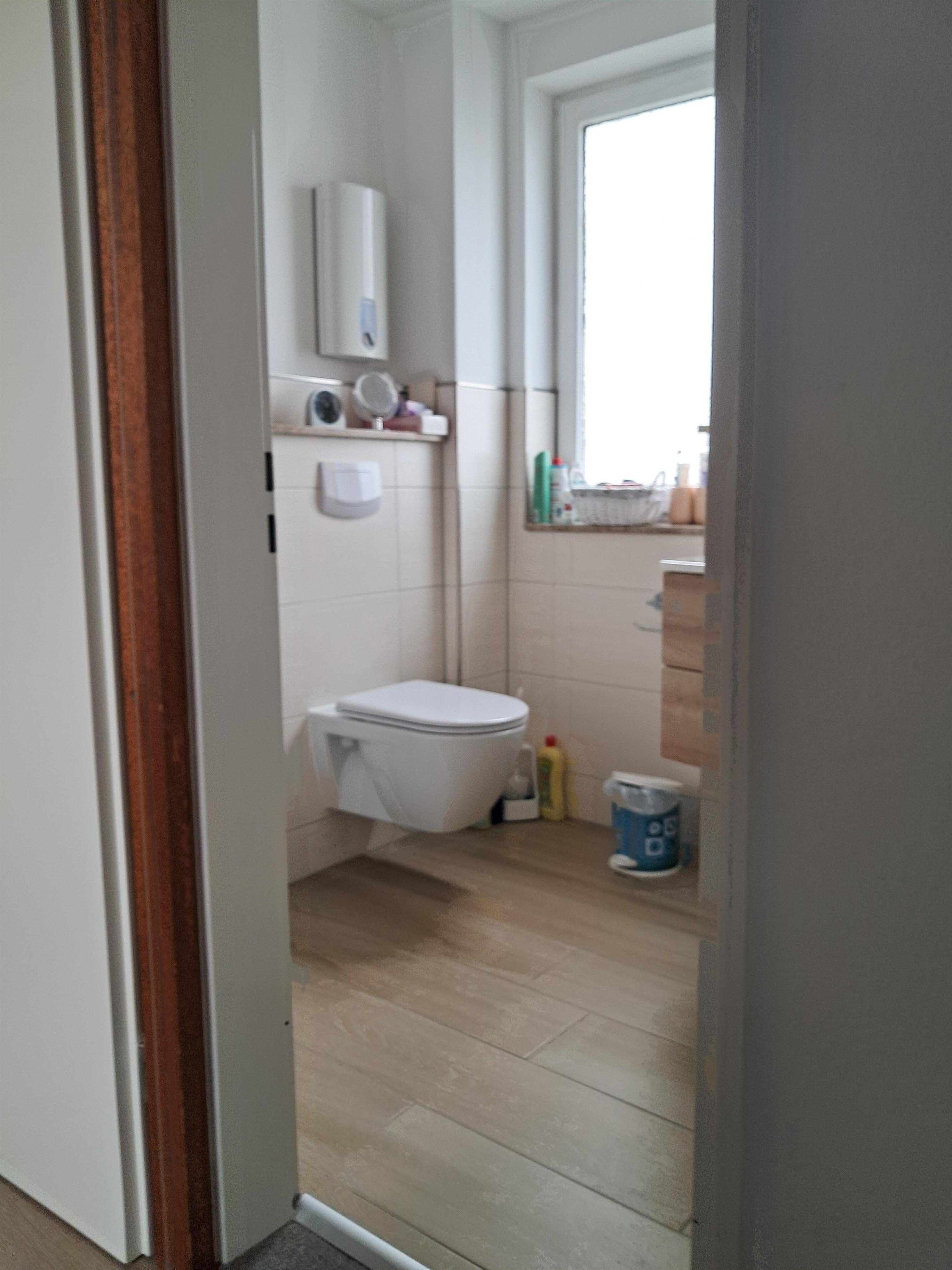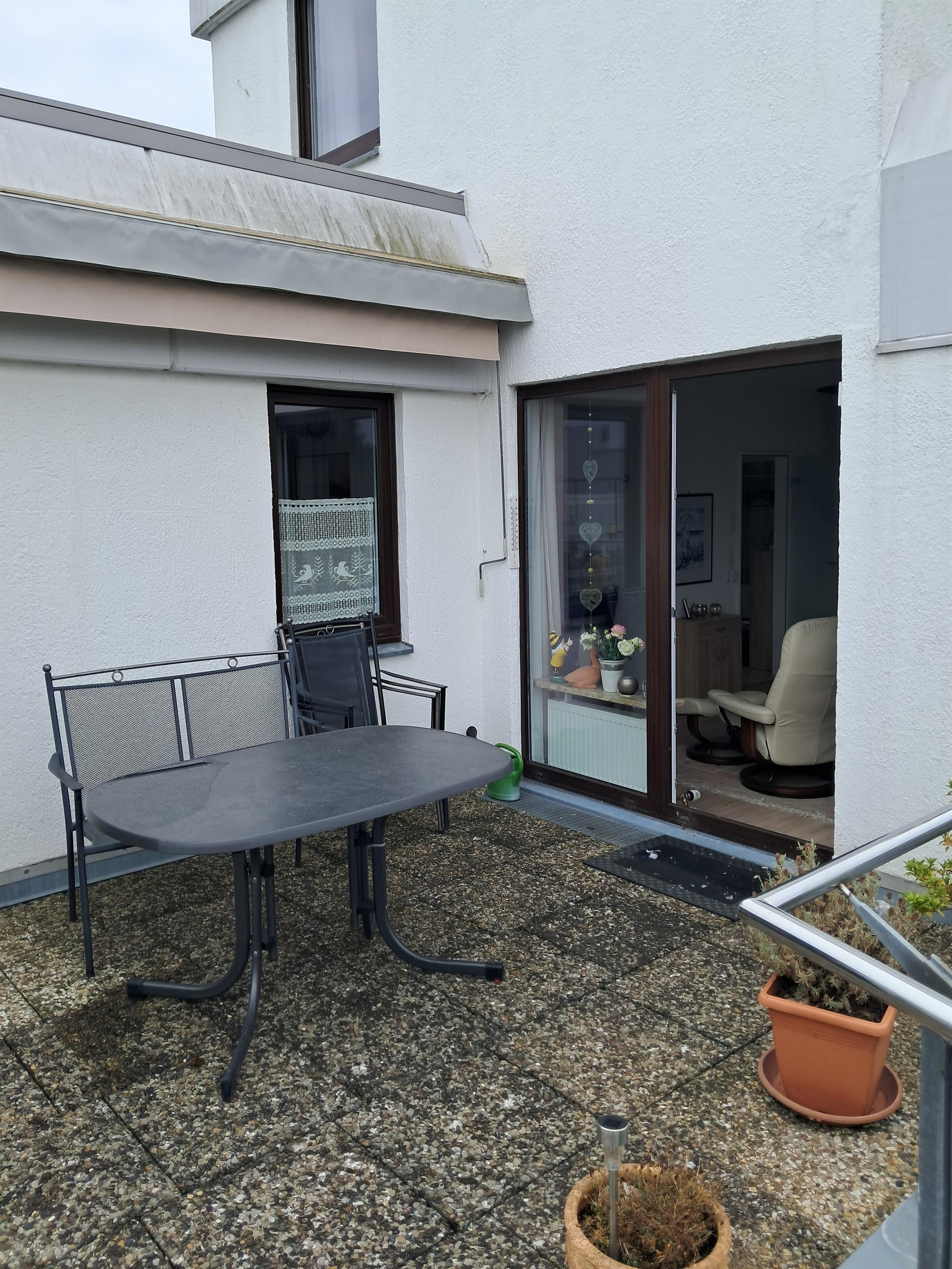 Sie finden unsere Wohnung in der 1. Etage. Über einen Laubengang gelangen Sie in einen kleinen Flur. Daran grenzt das Gäste WC. Vom Flur aus betreten Sie das Wohnzimmer, von wo aus Sie auf die ca. 20 qm große Balkonterrasse gelangen. Auf dem Süd/West-Balkon finden Sie gemütliche Sitzgelegenheiten und einen großen Tisch. Im Wohnzimmer befindet sich ein 4-Personen-Essplatz, welcher direkt an die vollausgestattete Küche (mit älterer Ausstattung) grenzt.