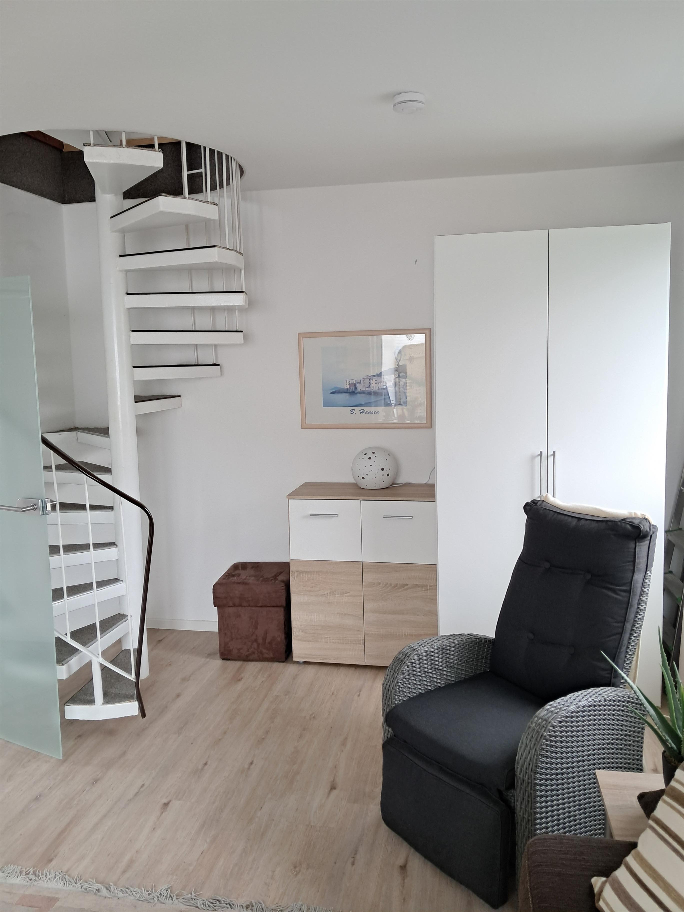 Über eine Wendeltreppe gelangen Sie vom Wohnzimmer aus in das großzügige Schlafzimmer mit den bequemen und extra großen Betten und das moderne Badezimmer mit Regendusche. Im Schlafzimmer befindet sich ein weiterer Flachbild-Fernseher.