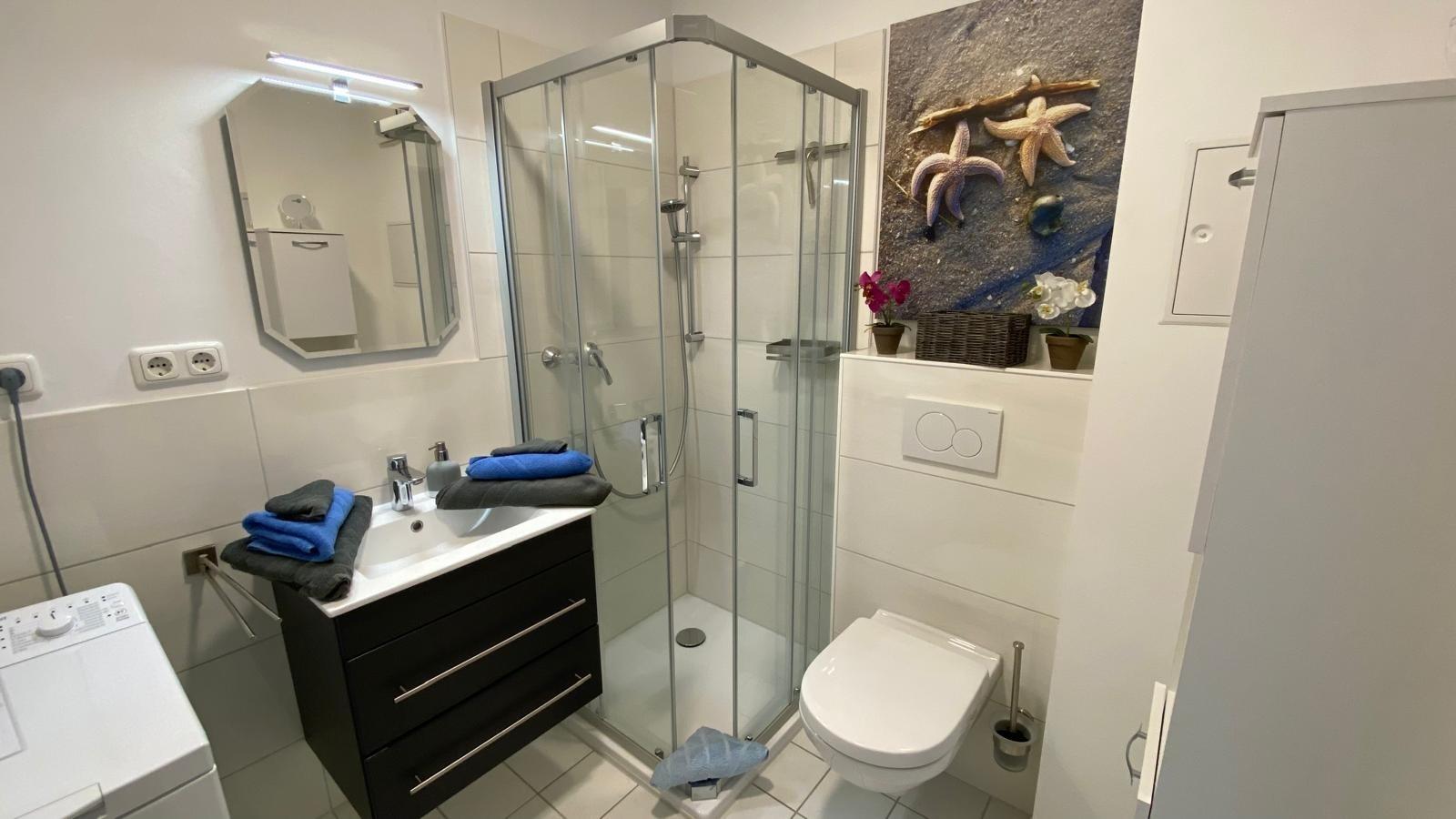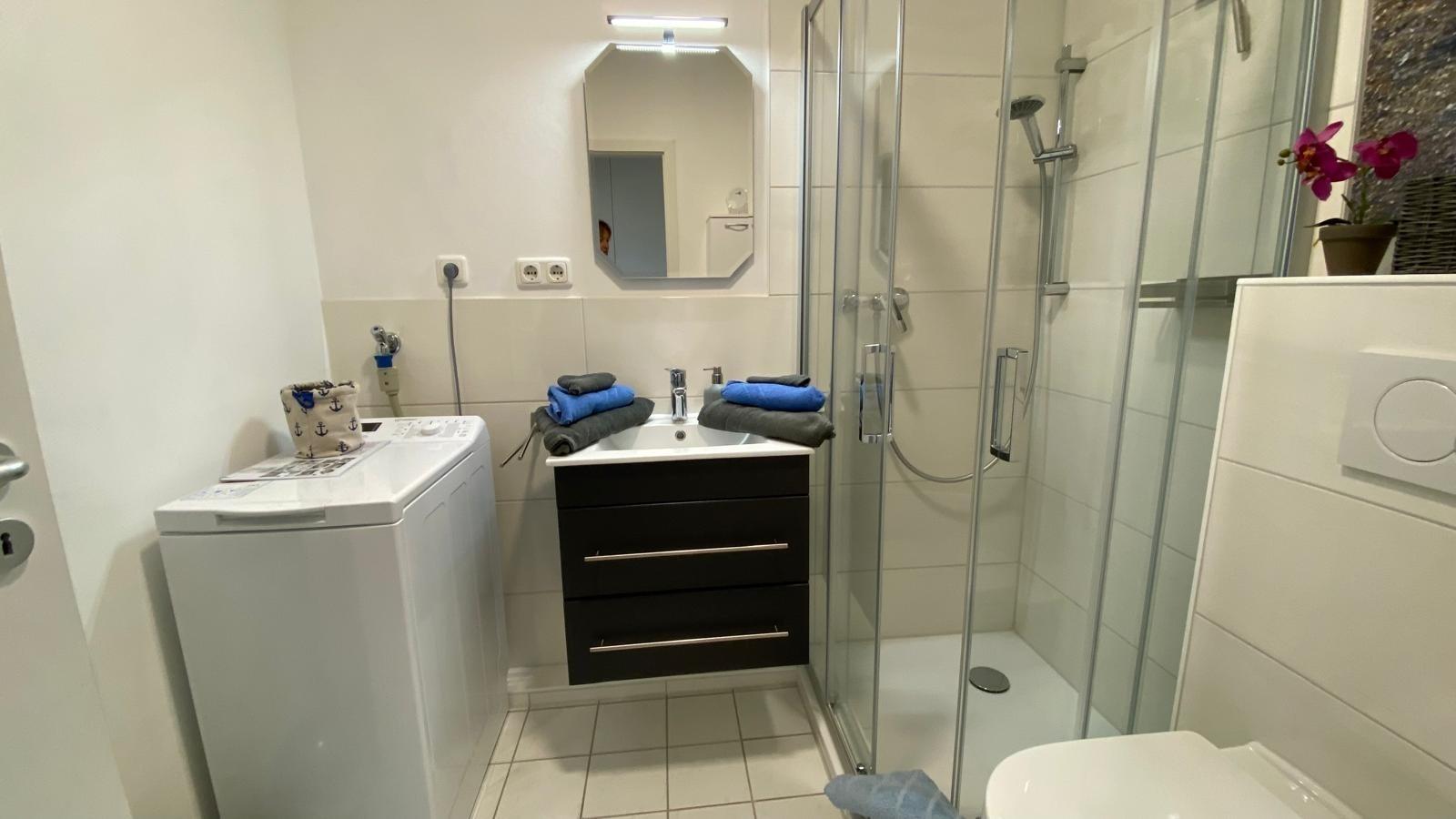 Im Duschbad befindet sich ein WC, Waschtisch mit Unterschrank, eine Waschmaschine, ein Hochschrank und eine begehbare Dusche.