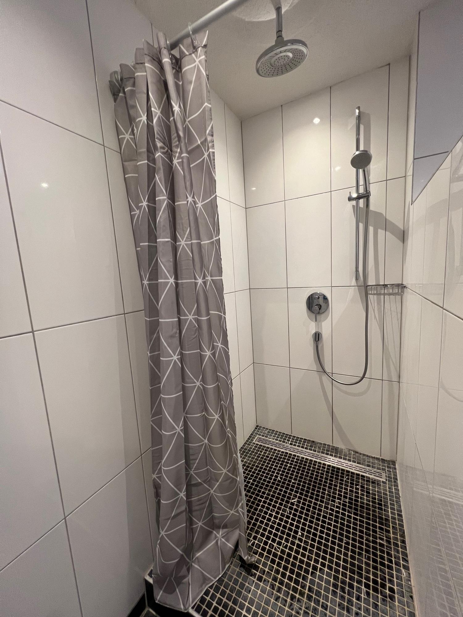 Das geräumige Duschbad überzeugt mit einem Atriumfenster, das für angenehmes Tageslicht sorgt. Zur Ausstattung gehören eine große Walk-in-Dusche, WC, Waschtisch und ein Spiegelschrank.