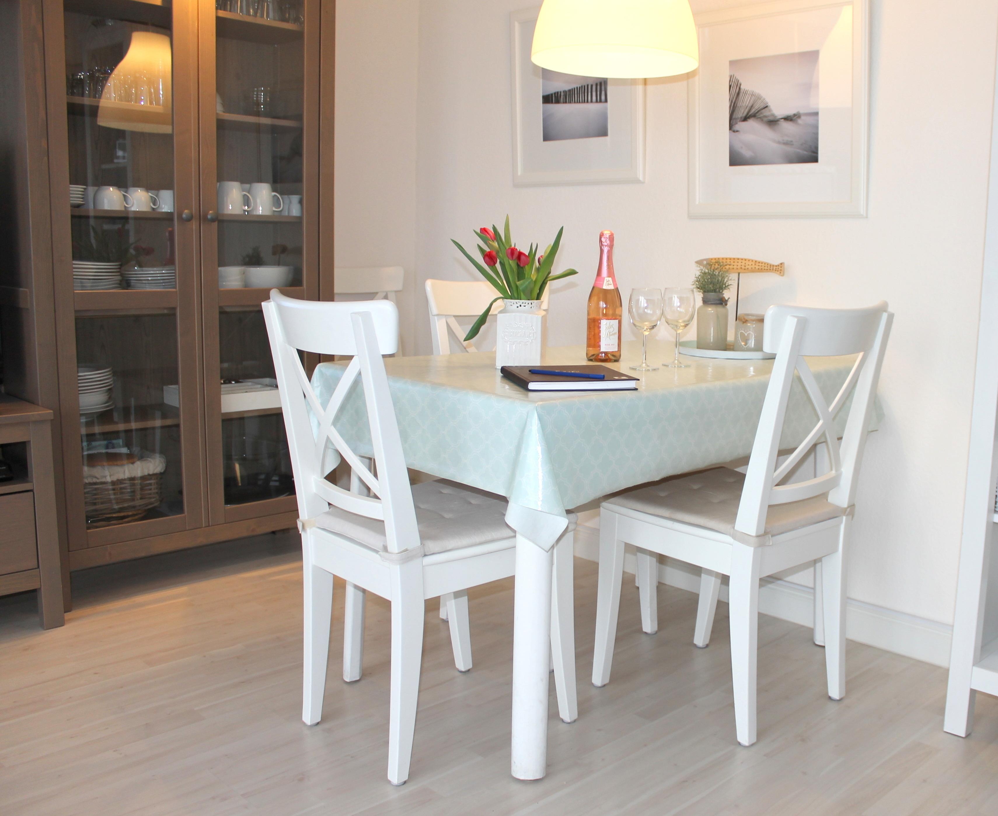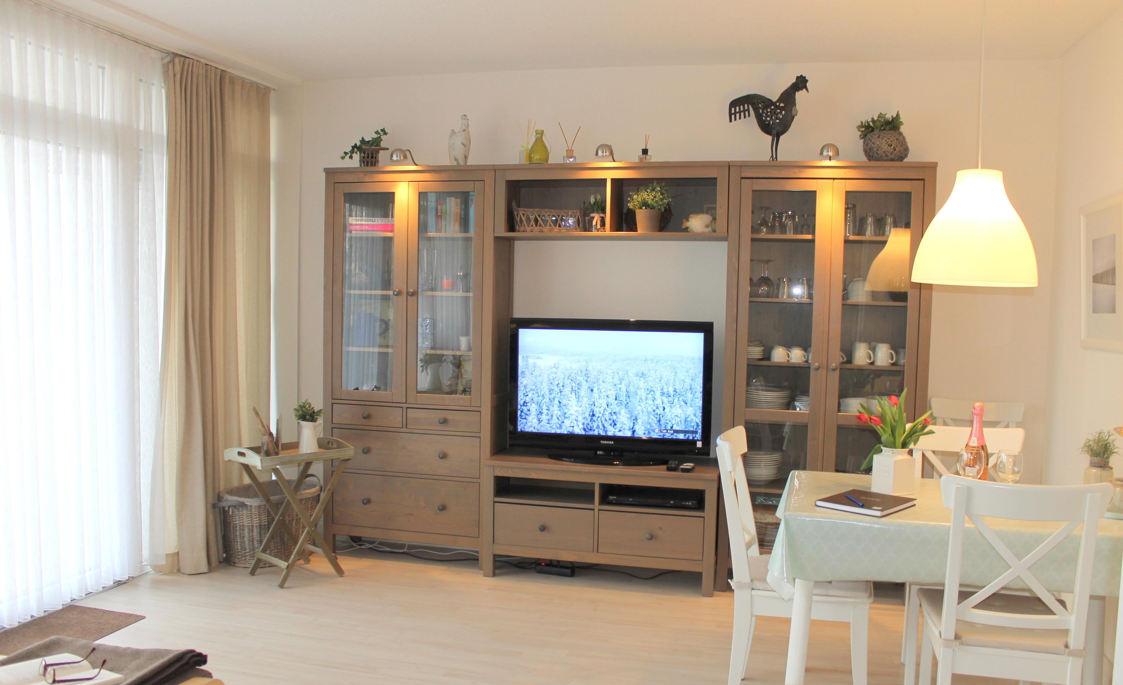 Im kombinierten Wohn/ Esszimmer befinden sich eine Schlafcouch (Breite 1,50 m), zwei Sessel, Esstisch mit 4 Stühlen, ein großer LCD-Fernseher, SAT-TV, DVD-Player und eine Stereoanlage. Der Wohnbereich lädt zu gemütlichen Stunden ein. Eine Sammlung an Büchern und Spielen steht Ihnen zur Verfügung.