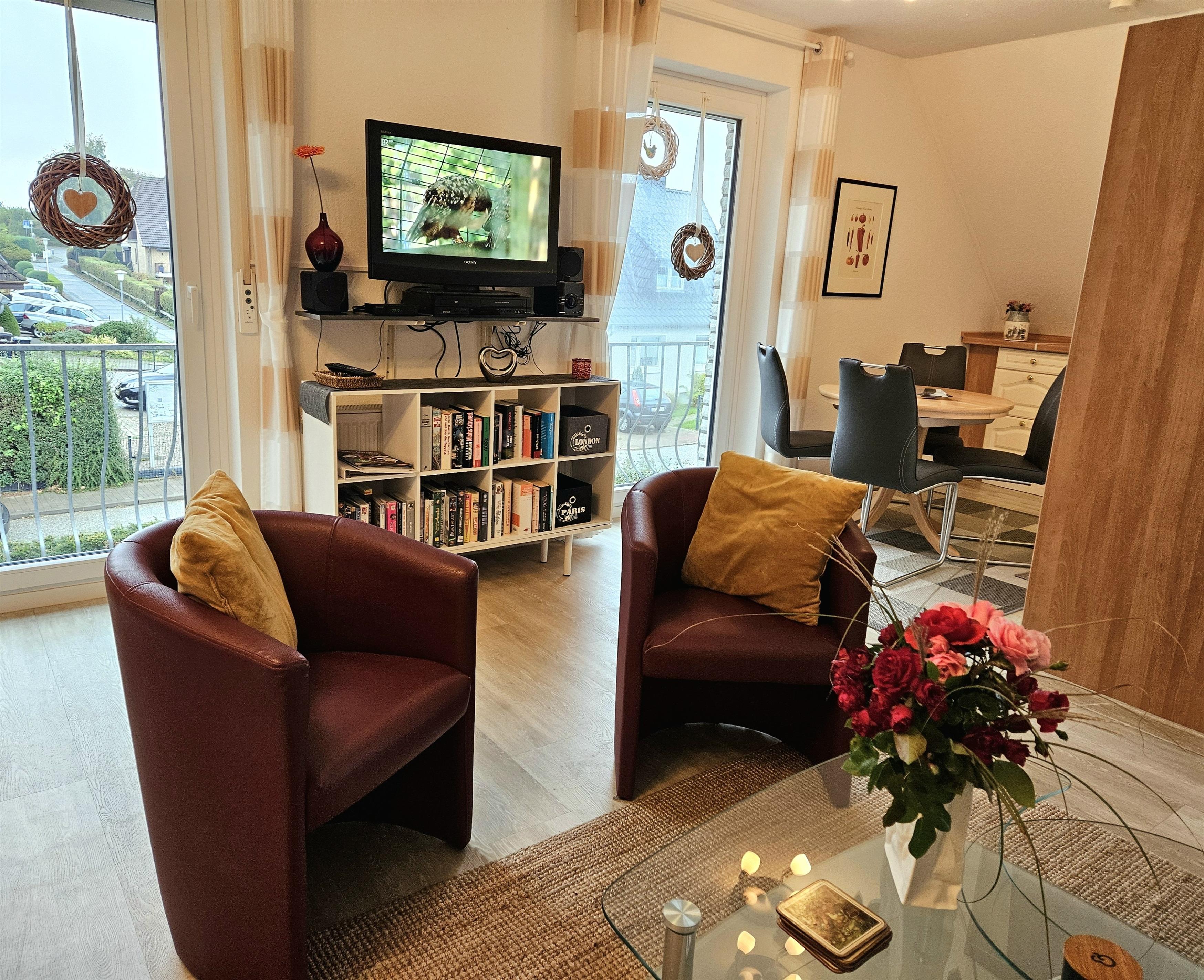Das Appartement "Nr. 2" im "Haus Frohnau" liegt in der ersten Etage und bietet Platz für bis zu fünf Personen. Die Wohnfläche der ca. 42 m² großen Unterkunft verteilt sich auf einen Wohn- / Schlafraum mit offener Küche, ein separates Schlafzimmer, ein Badezimmer sowie ein Gäste-WC. Der Wohnbereich ist mit einer gemütlichen Sitzecke, einem Doppelbett (1,80 x 2 m) sowie einer offenen Küche versehen. Die Küchenzeile ist u.a. mit Ceranfeldherd, Backofen, Geschirrspülmaschine, einem großen Kühlschrank und Gefrierschrank sowie einem Essplatz ausgestattet. Das Tageslicht-Badezimmer ist mit Dusche/WC und Waschtisch ausgestattet, zusätzlich gibt es ein Gäste-WC.