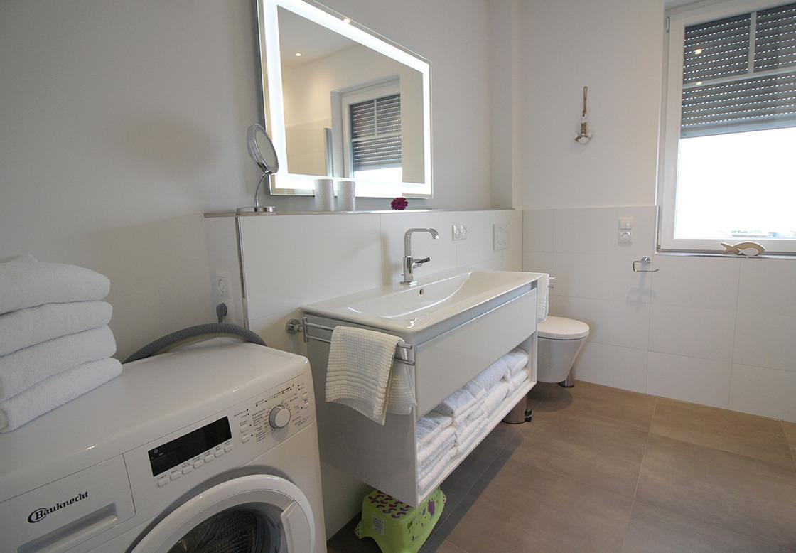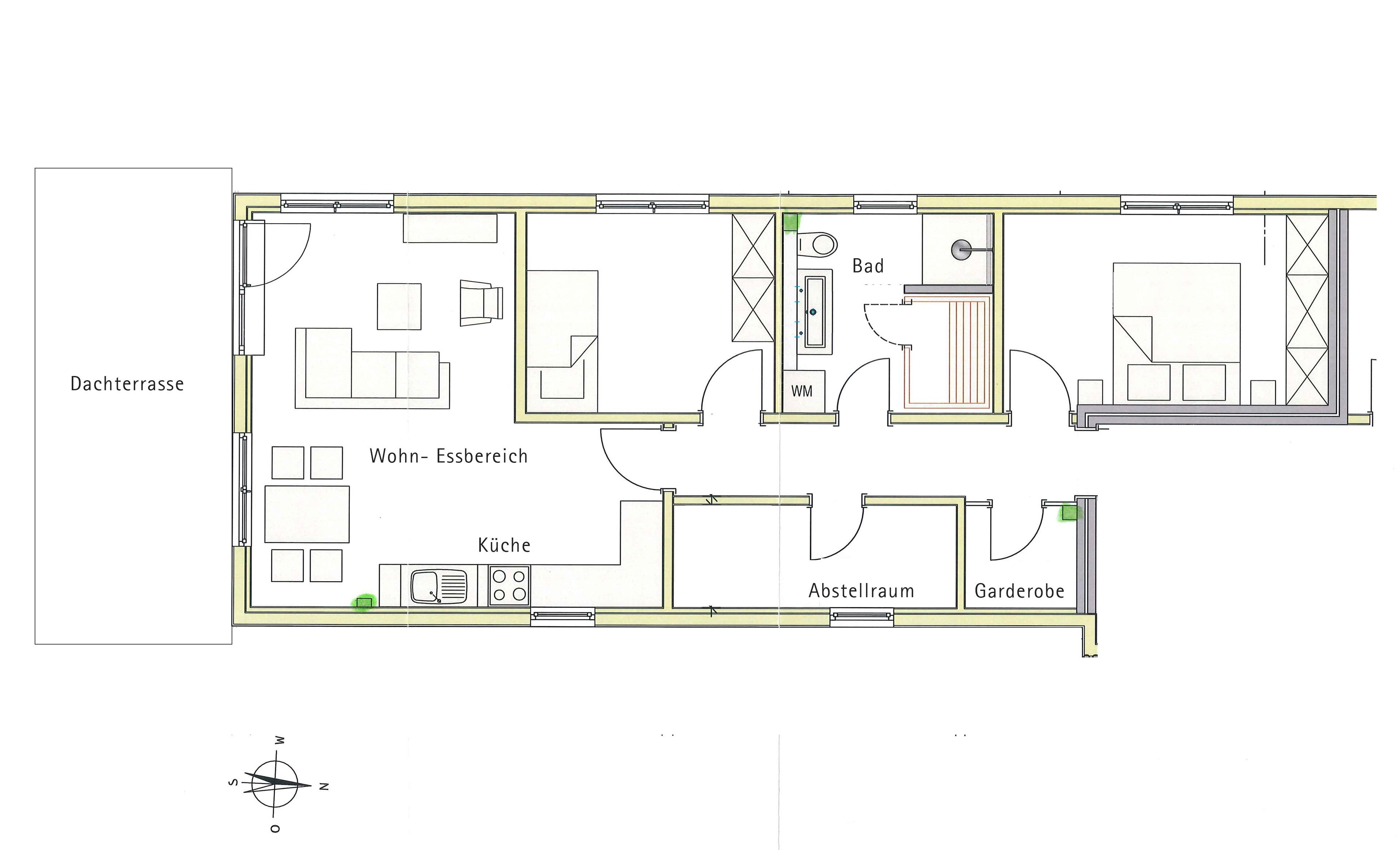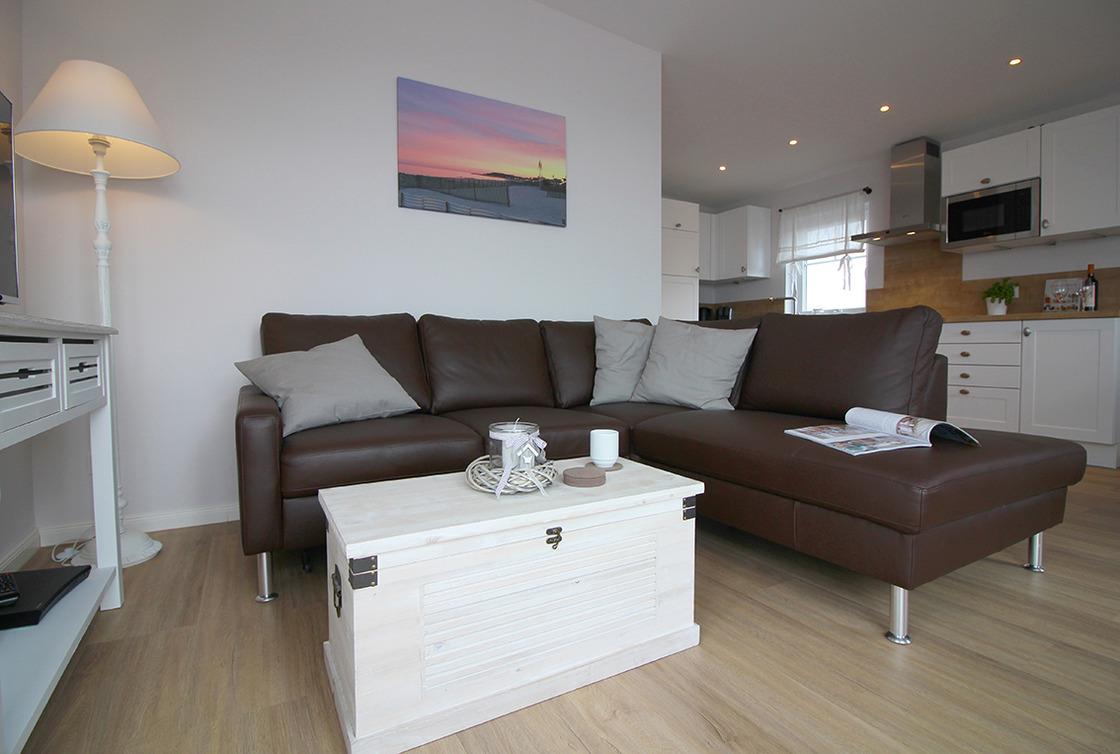 Diese schöne Ferienwohnung mit Fußbodenheizung und elektrischen Außenjalousien liegt im Staffelgeschoss/2.OG. Sie bietet Ihnen eine große, nach Süden ausgerichtete Dachterrasse mit elektrischer Markise, auf der Sie z. B. herrlich im Strandkorb entspannen können. Die große Wohnung verfügt über zwei Schlafzimmer mit Boxspringbetten und Flachbildfernseher sowie über eine kleine, feine Sauna im Bad. Dort finden Sie auch eine bodentiefe Regendusche sowie eine Waschmaschine, die Sie kostenfrei nutzen können. Die Küche ist voll ausgestattet und verfügt zusätzlich über eine Nespresso Maschine. Sie grenzt an den Ess- und Wohnbereich mit Flachbildfernseher, Blu-Ray-Player und Minikompaktanlage mit Bluetooth.