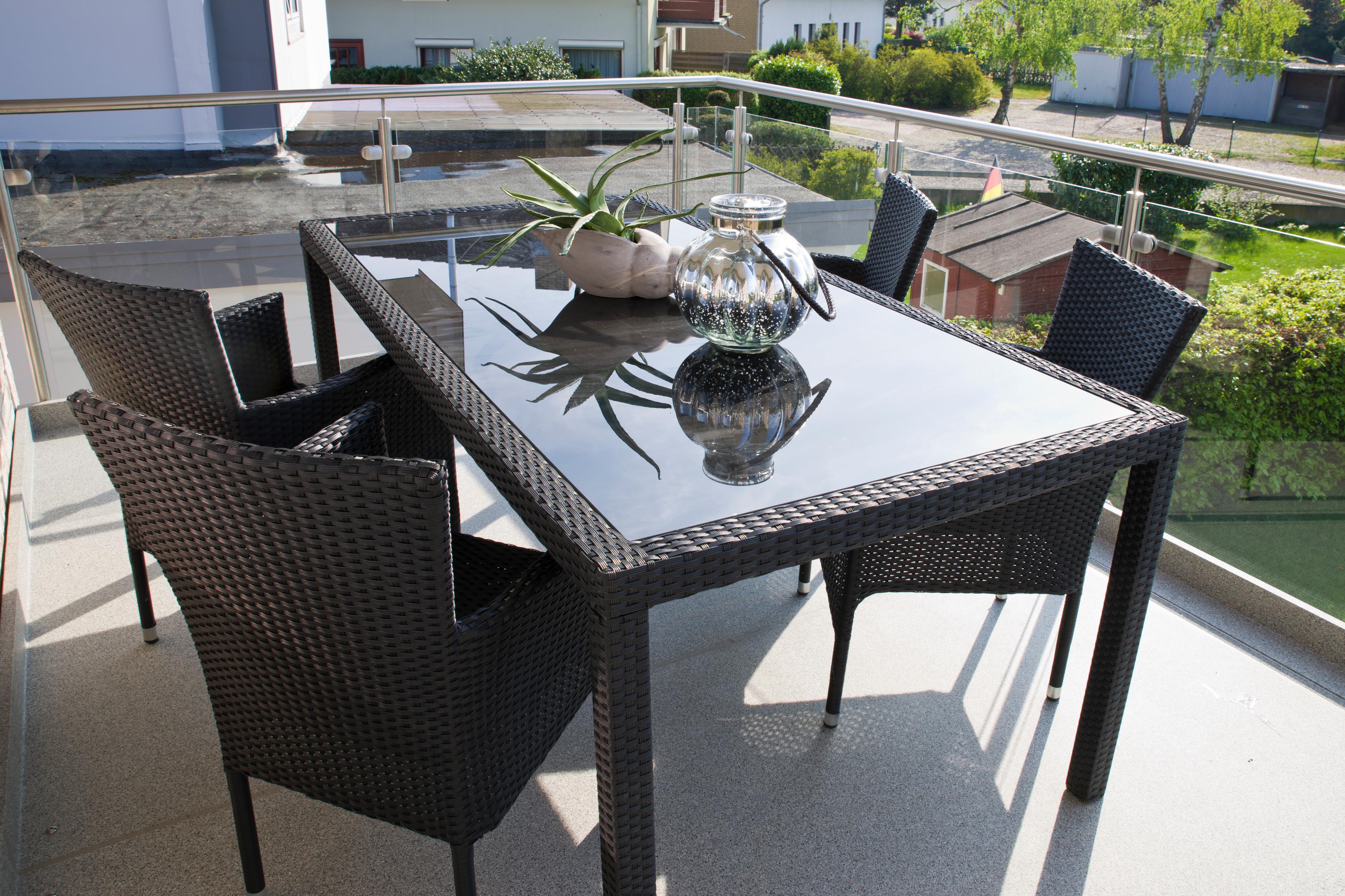 Desweiteren befindet sich im Wohnbereich ein Esstisch mit 4 bequemen Loom-Hochlehn-Stühlen, angrenzend an die offene Küche. Vom Wohnzimmer aus führt Sie die Balkontür direkt auf einen mit bequemen Loom-Gartenmöbeln ausgestatteten sonnigen Balkon, welcher zum genussvollen Frühstück und ungestörtem Sonnenbaden einlädt.