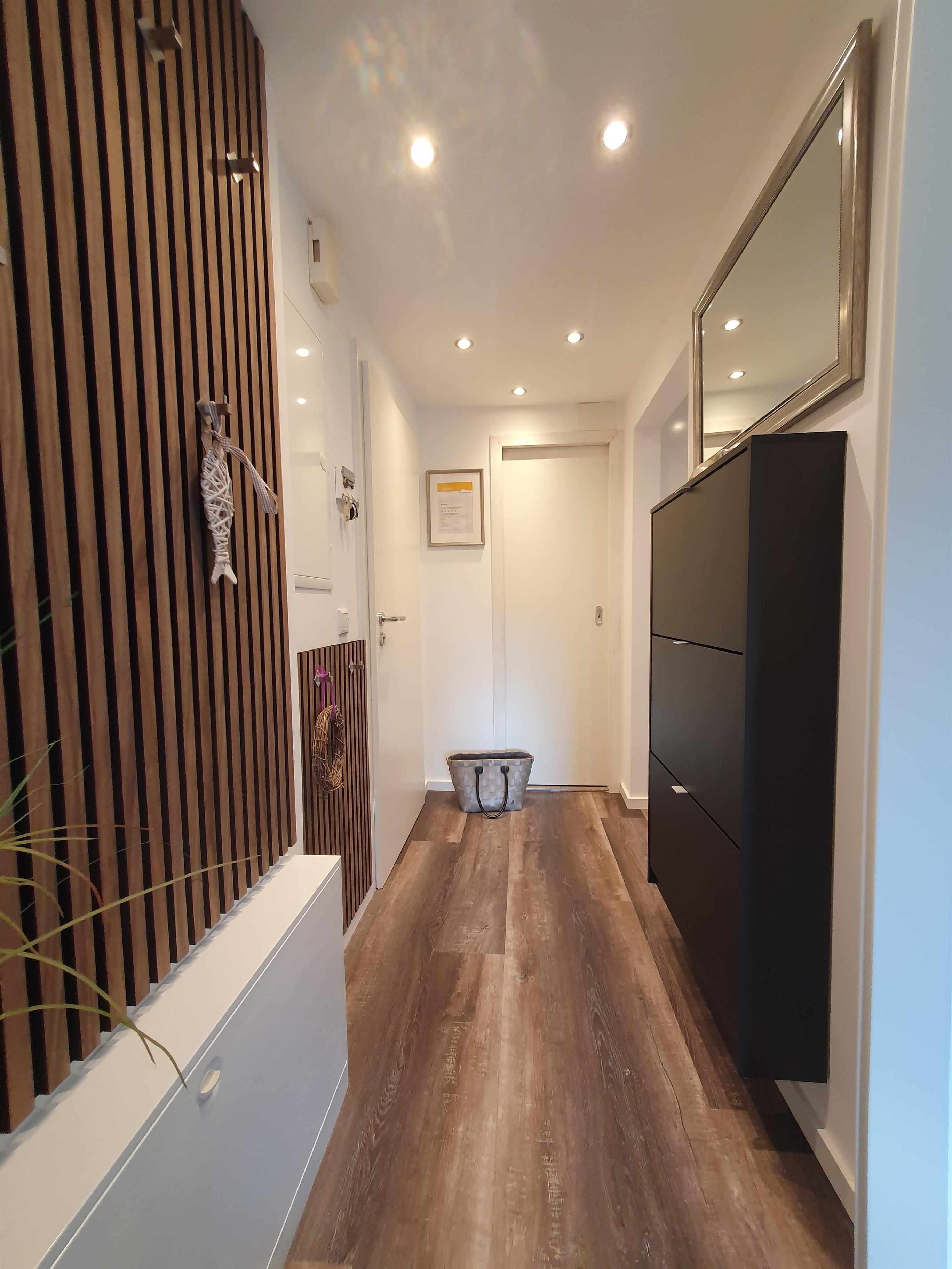 Der Flur ist großzügig mit im Winter beheizter Garderobe und mit einem Schuhregal ausgestattet.