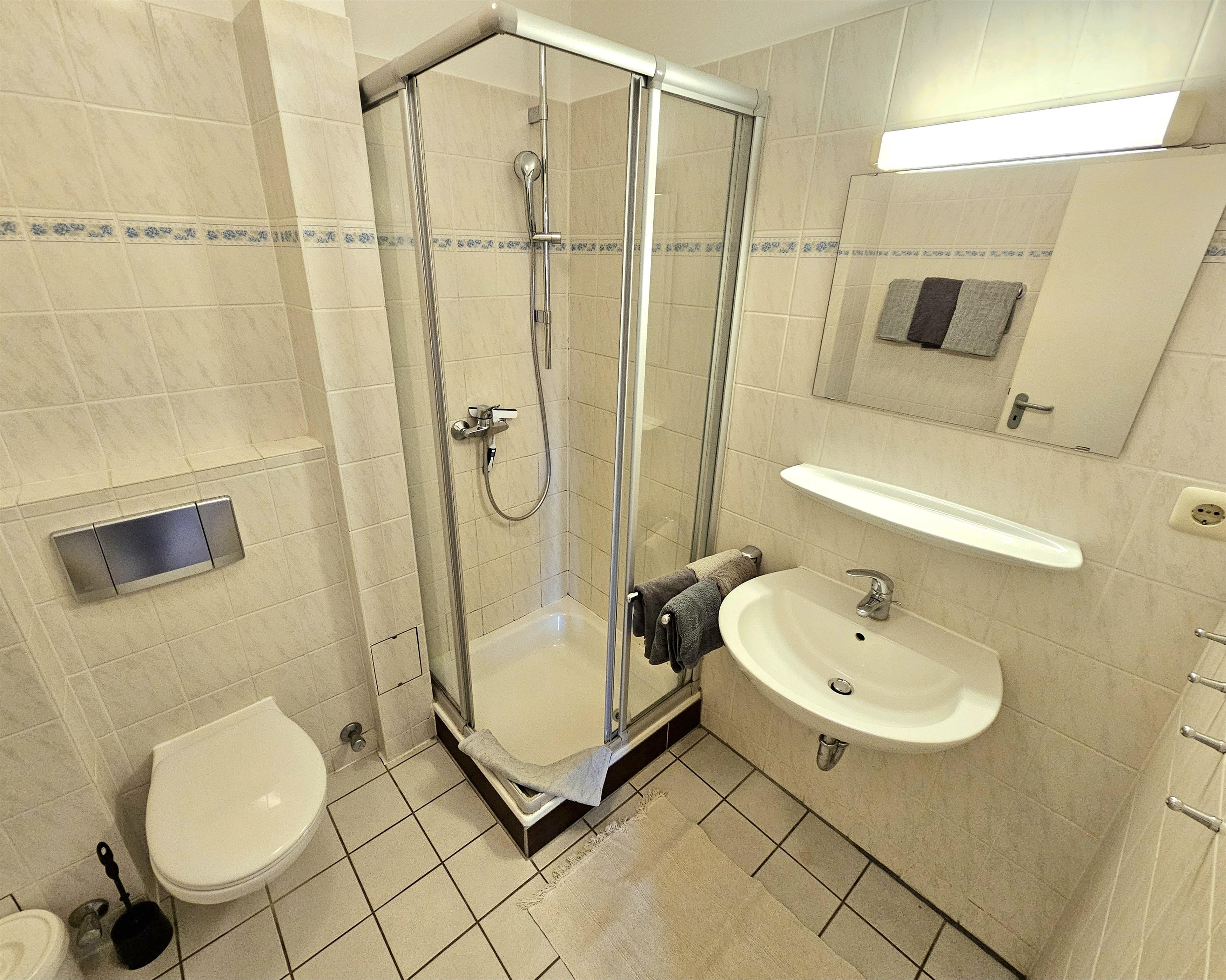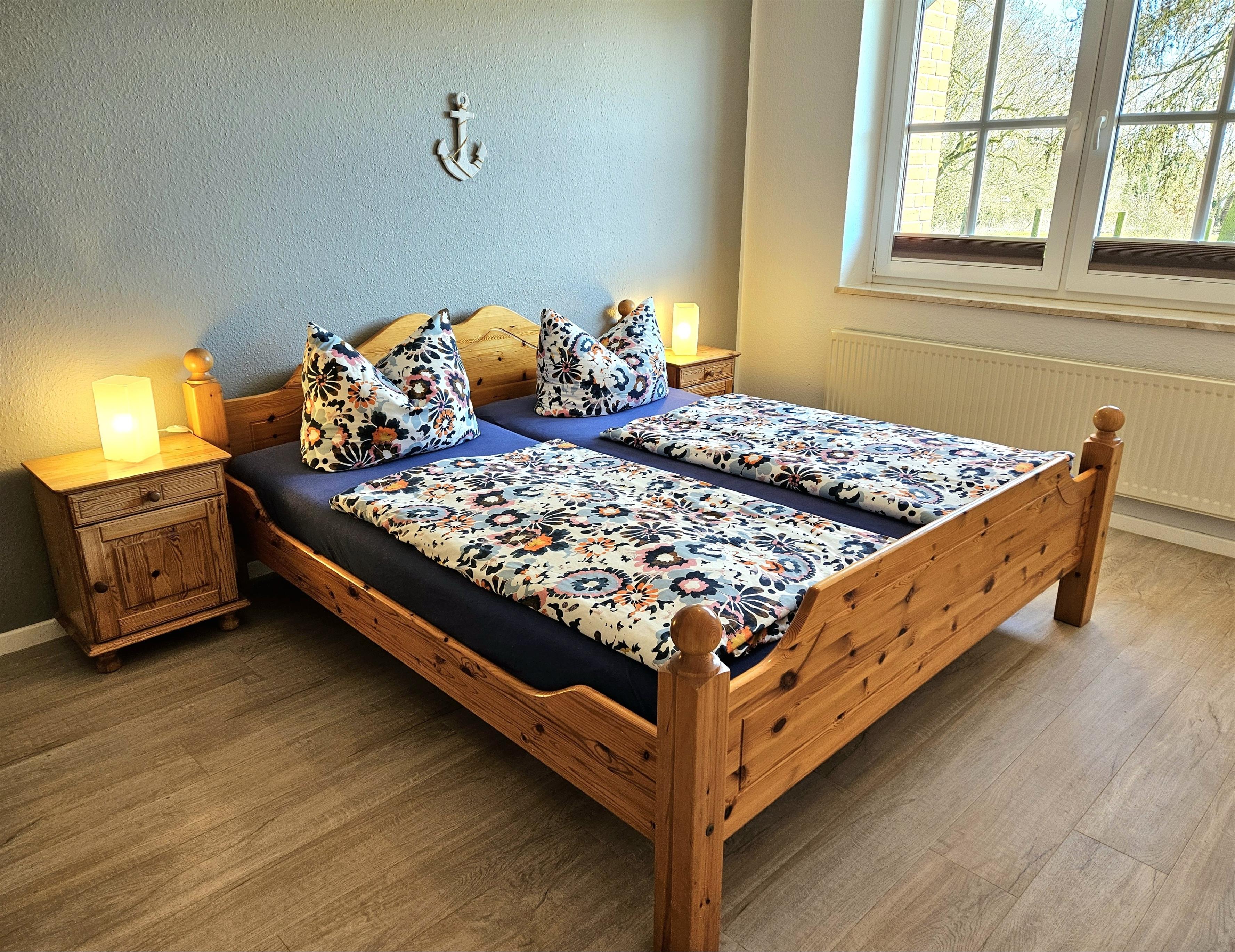 Die Wohnung "Nr. 1" auf dem "Grömitzer Pappelhof" liegt im Erdgeschoss und bietet Platz für bis zu 5 Personen. Die Wohnfläche der ca. 80 m² großen Ferienunterkunft verteilt sich auf ein Wohn- / Esszimmer, zwei separate Schlafzimmer, einen Flur, einen kleinen Abstellraum sowie auf eine separate Küche und ein Badezimmer. Das Wohn- / Esszimmer ist mit einer gemütlichen Sitzecke, Flachbild-TV sowie einem Esstisch versehen. Die separate Küche ist u.a. mit Backofen, 4-Plattenherd, Kaffeeemaschine, Mikrowelle und weiteren Küchengeräten versehen, auch hier befindet sich ein kleiner Essplatz für 2 Personen. Eins der beiden Schlafzimmer ist mit einem Doppelbett (getrennte Matratzen - Maße 0,90 x 2,00 m) und einem großen Kleiderschrank sowie zwei gemütlichen Korbsesseln versehen. Das zweite Schlafzimmer verfügt über drei Einzelbetten (0,90 x 2,00 m) einen Schreibtisch sowie einen Kleiderschrank. Das Badezimmer ist mit WC und Dusche versehen. Über den langgezogenen Flur gelangen Sie in alle Räume. Ein Abstellraum ist ebenfalls vorhanden. Vor dem Eingangsbereich der Wohnung befindet sich eine Terrasse sowie der große Garten.