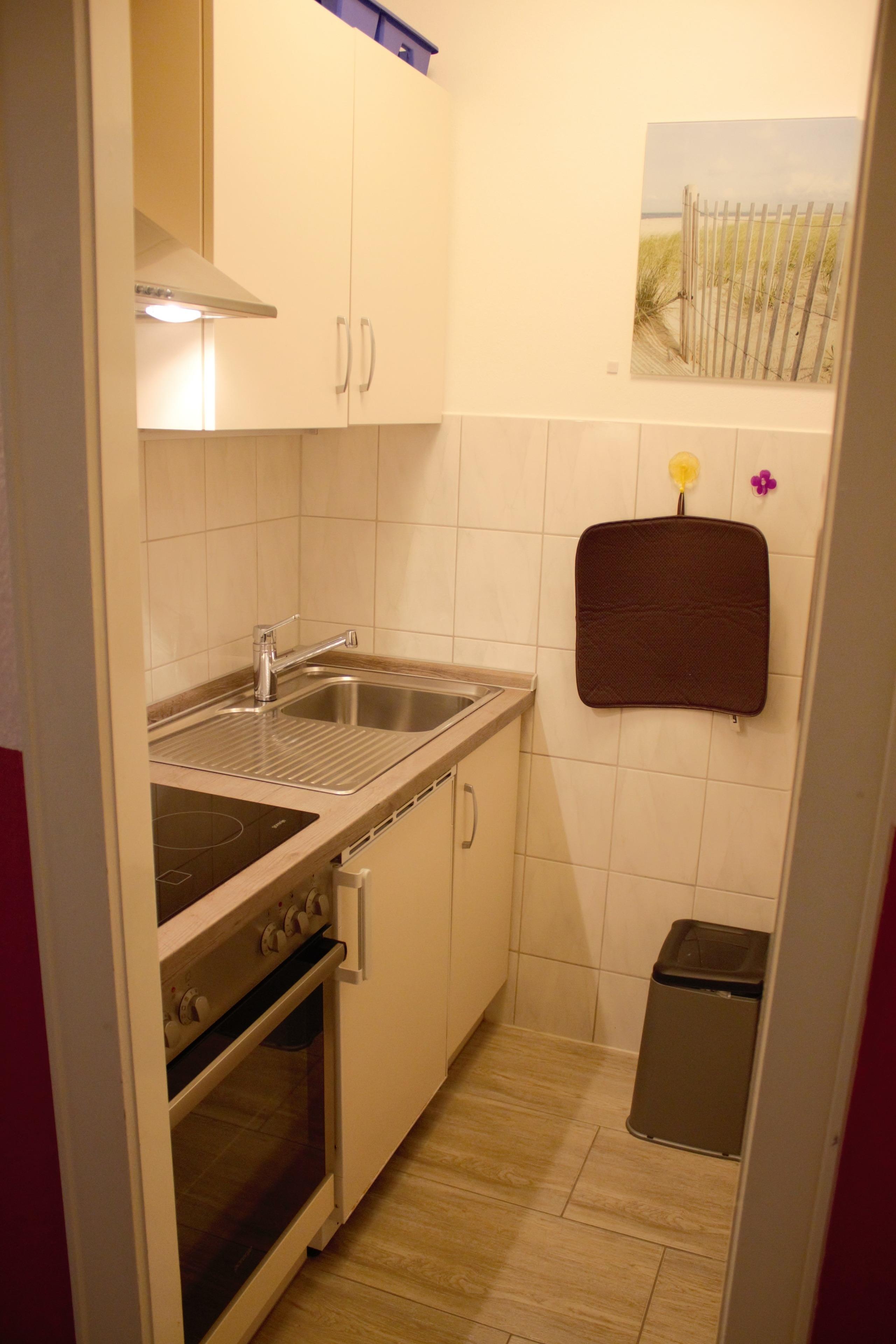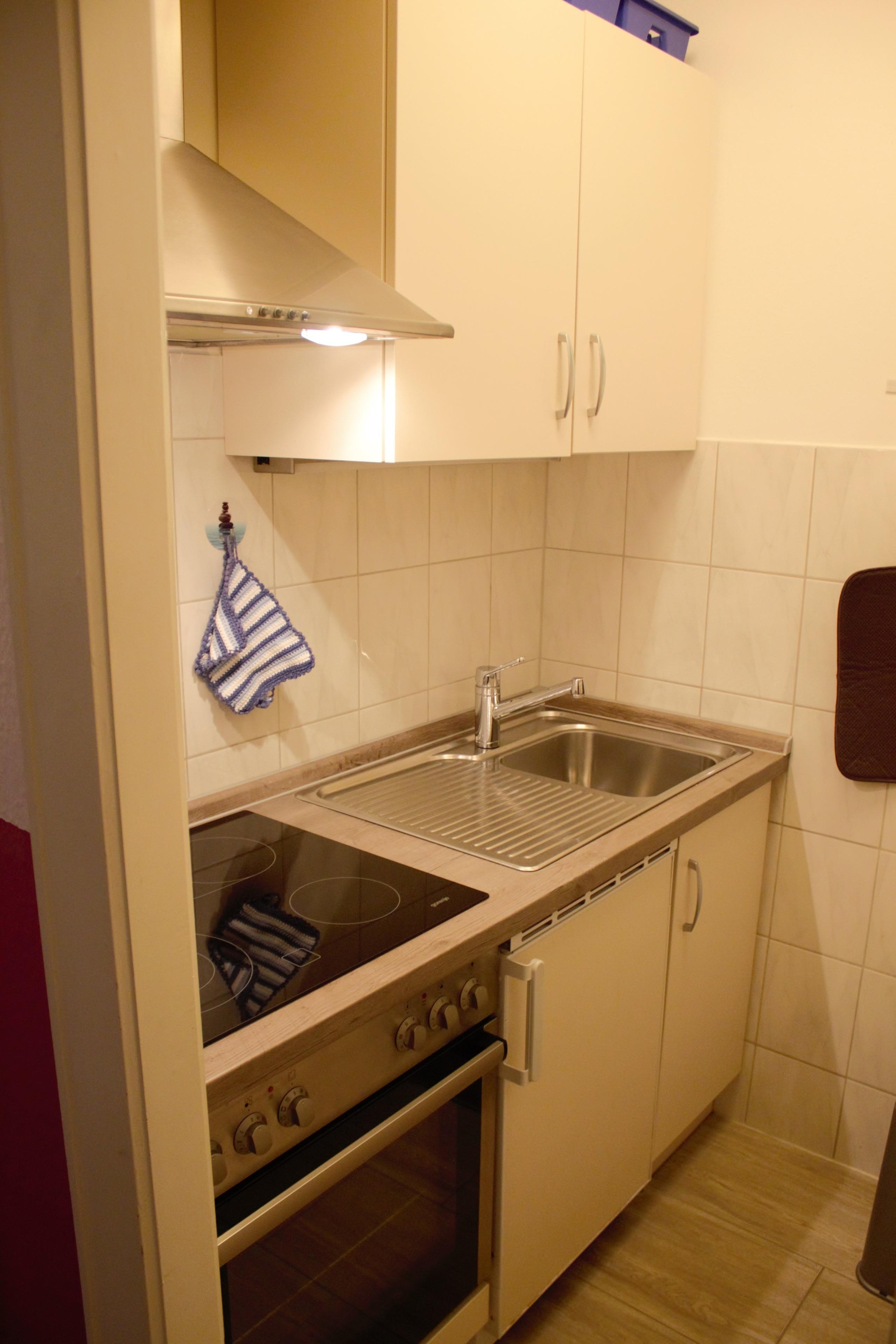 Die kleine separate Küche ist mit allen notwendigen Küchengeräten ausgestattet, einschließlich Kühlschrank mit Gefrierfach, Backofen und Kaffeemaschine. Das zweite Schlafzimmer bietet ein Doppelbett (1,60 x 2 m), einen Sessel und eine kleine Kommode. Beide Räume sind für die Nacht verdunkelbar.