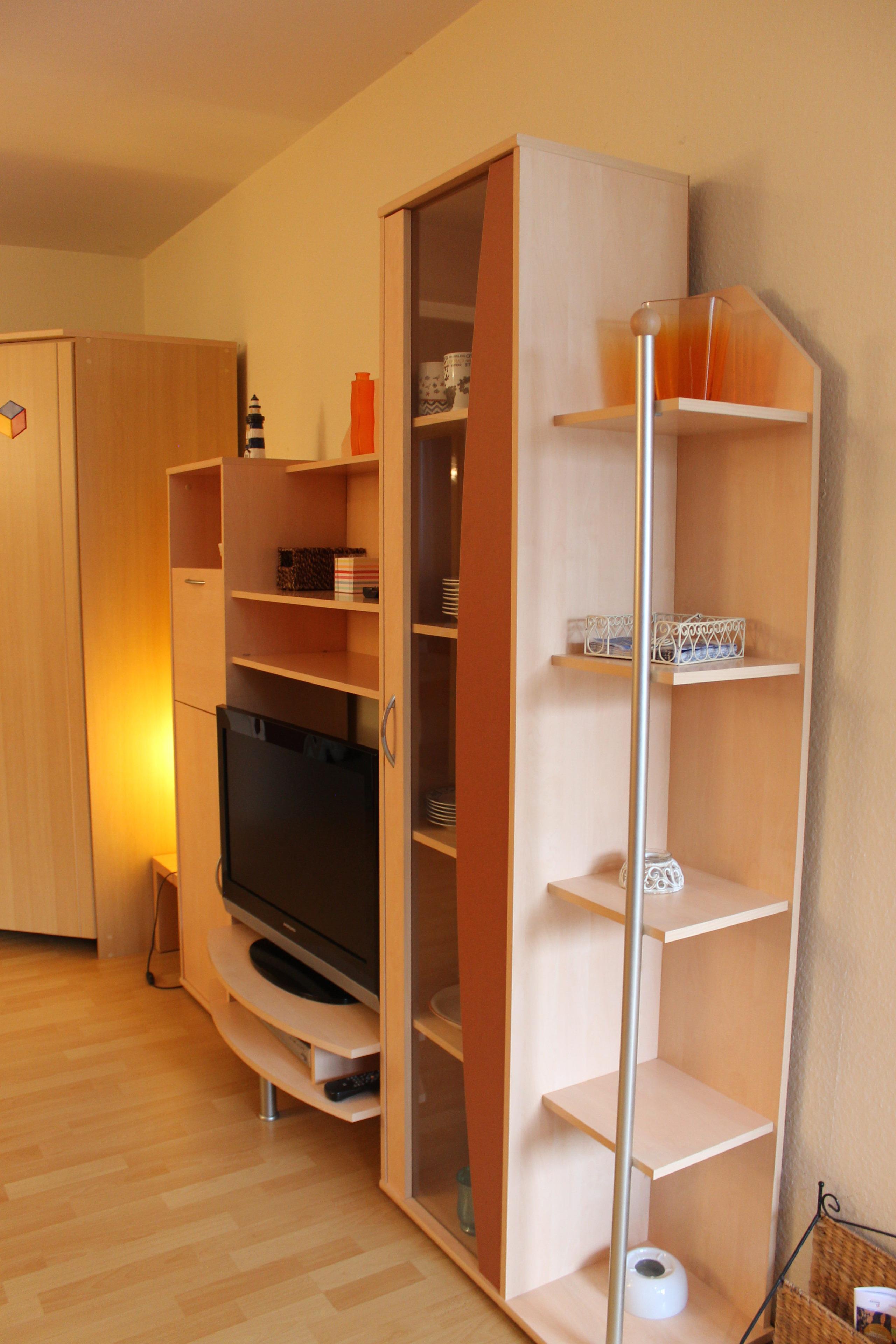 Das Wohnzimmer verfügt über eine bequeme Eckcouch mit Schlaffunktion, einen Flachbild-TV, eine Stereoanlage und einen Essplatz. Zusätzlich gibt es ein Doppelschrankbett (1,80 x 2 m)und einen großen Kleiderschrank. Vom Wohnzimmer aus erreichen Sie die möblierte Terrasse und den kleinen Gartenbereich.